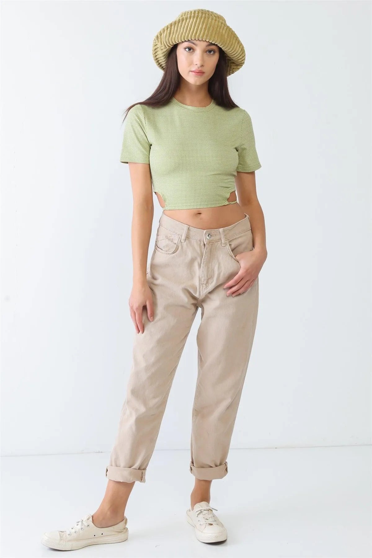 🖤 Item Features: Green & white, plaid, crew neckline, short sleeves, cut-out style, hem with adjustable around self-tie drawstring, cropped length, non-stretchy, unlined, non-sheer, casual, cute, girlish, must-have, lifestyle