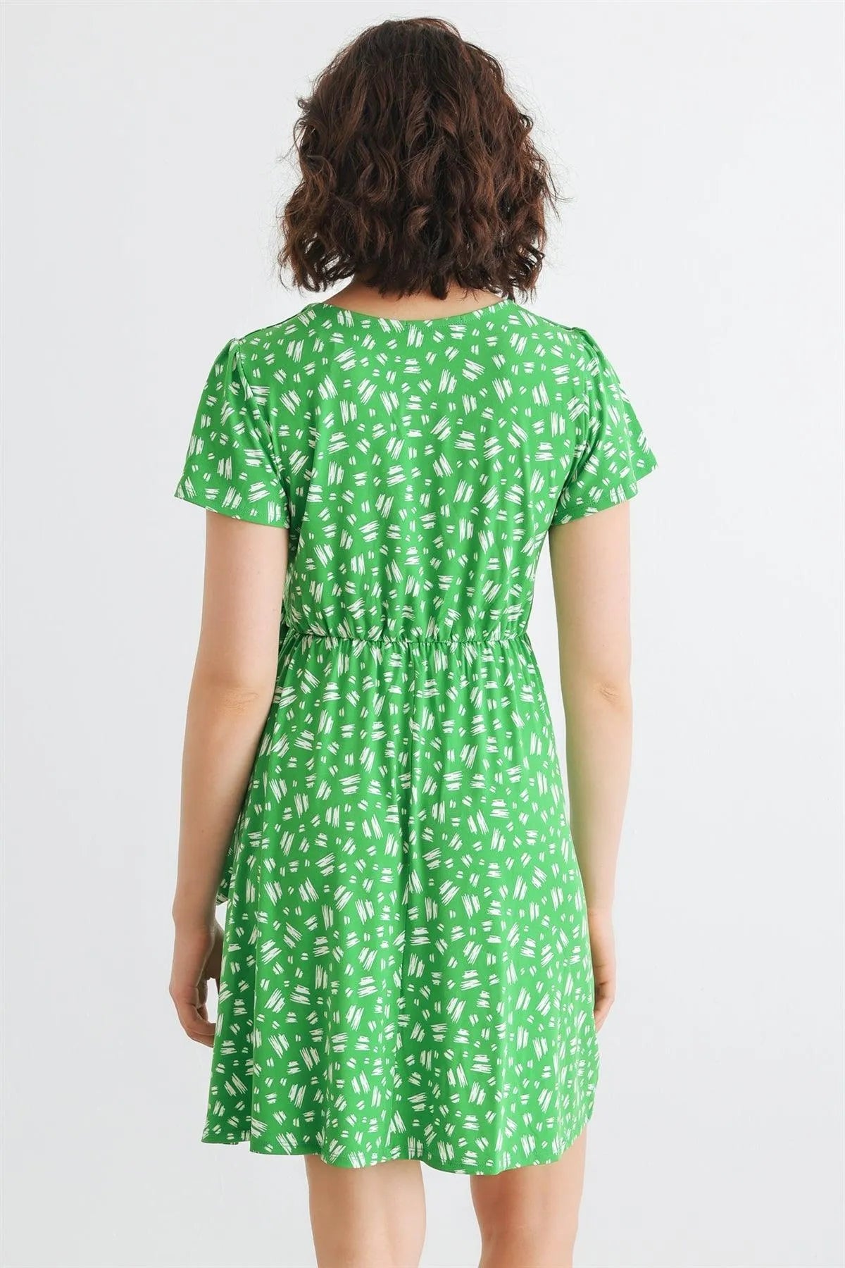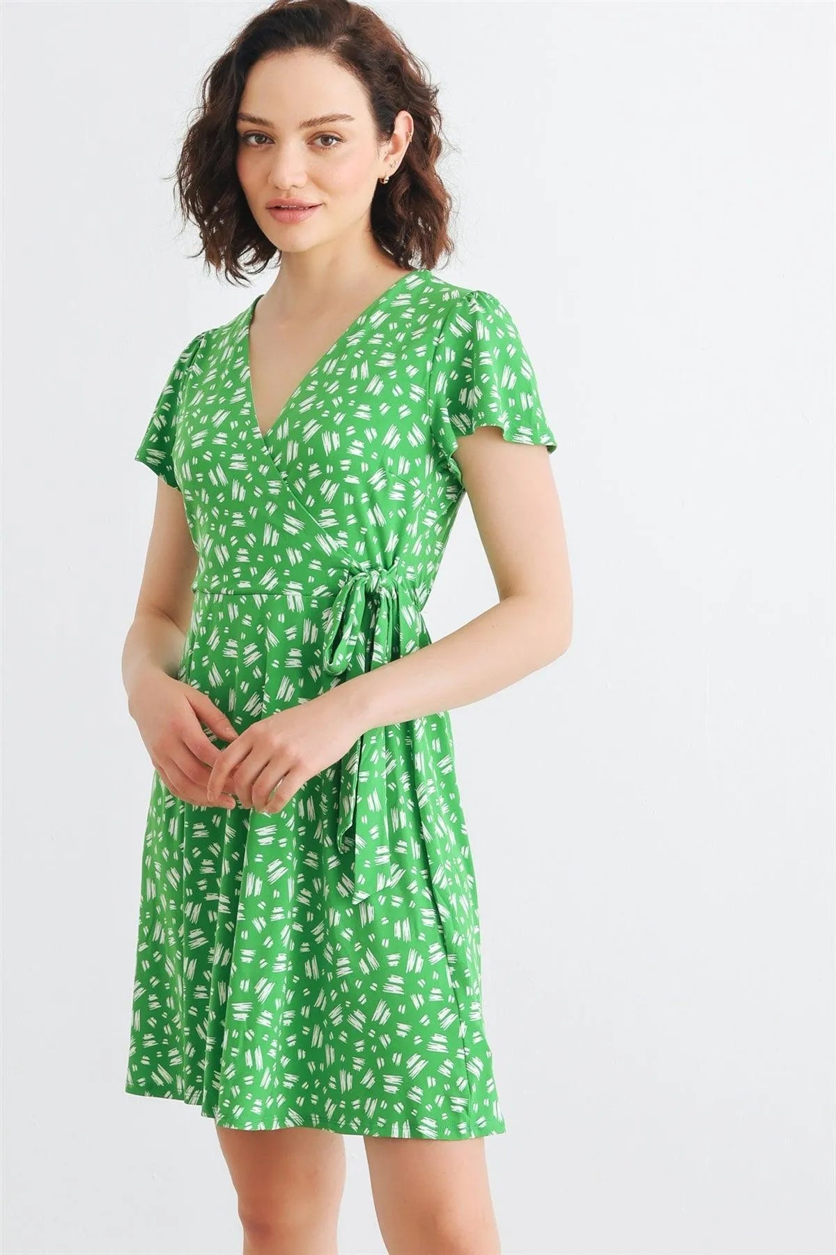 Green & White Print Wrap Neck Short Sleeve Tie Mini Dress /2-2-2