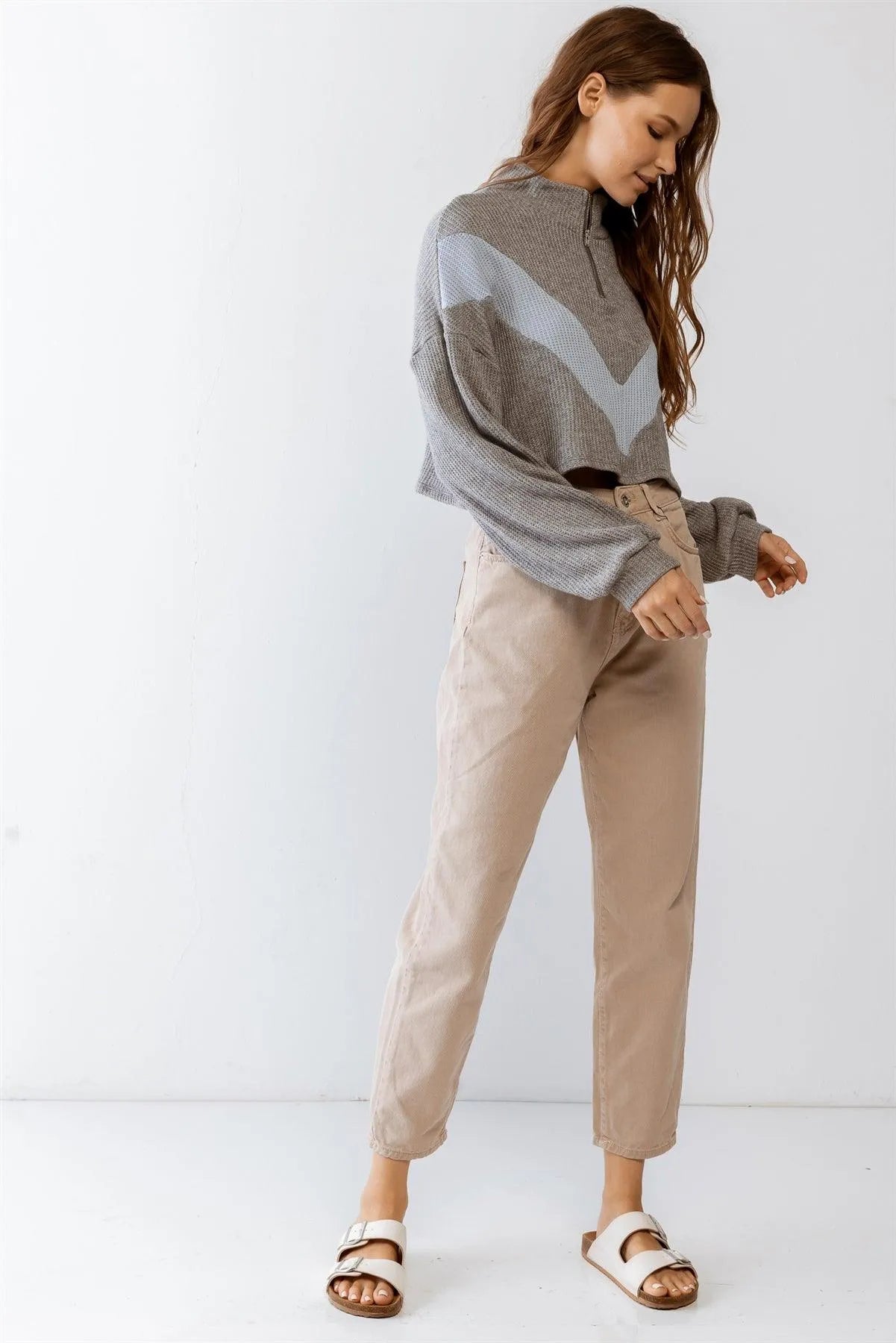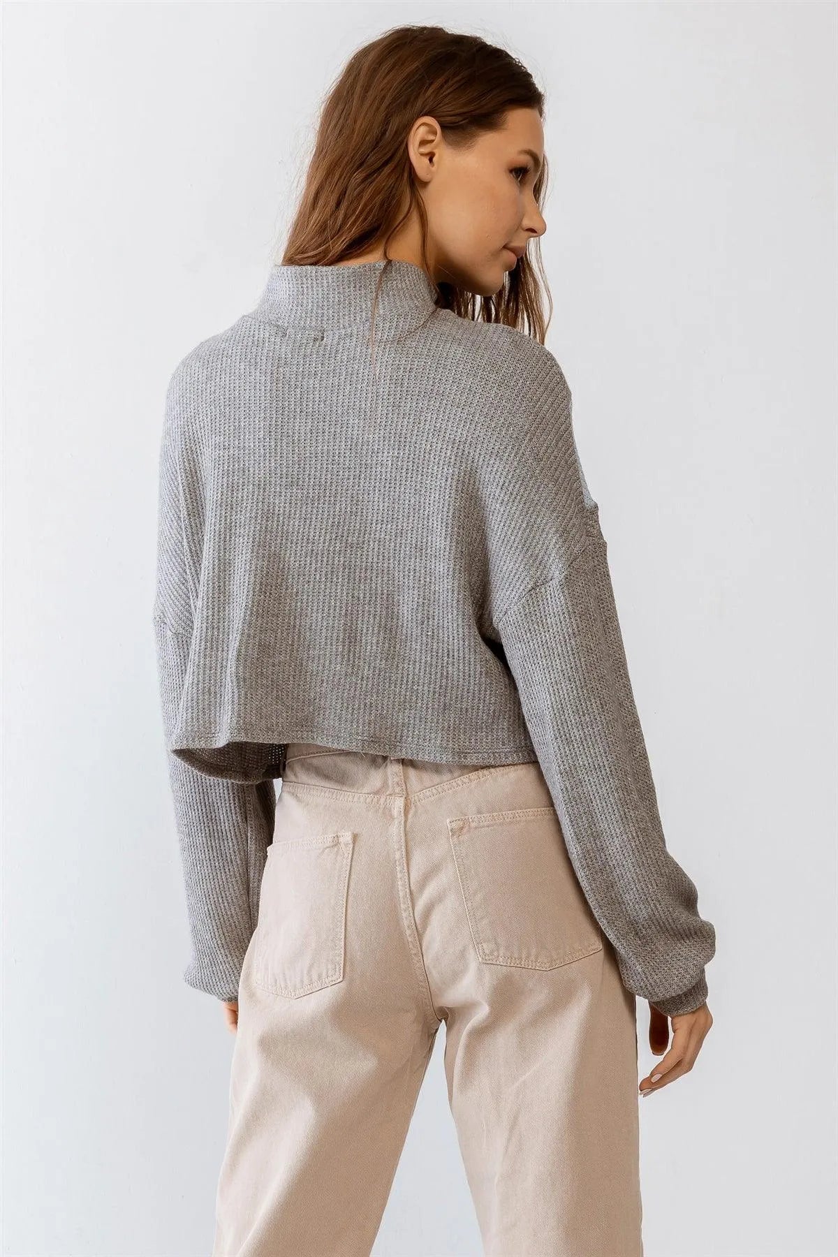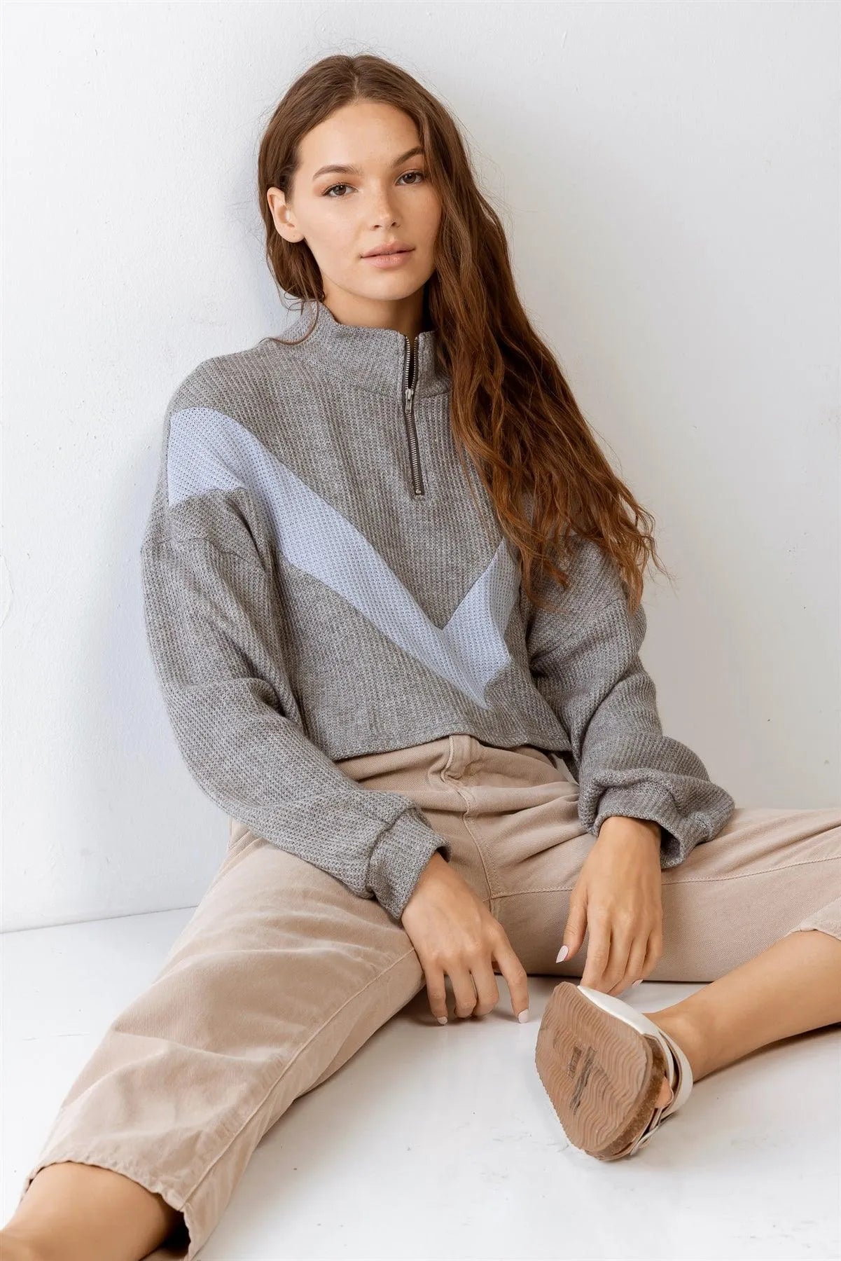 🖤 Stay warm and cozy in our Grey & Blue Waffle Knit Crop Top. This cute and trendy top features a unique blue detail on the front and a playful turtle neckline with a zip-up closure. Made with a soft knit material, dropped shoulders, and cuffed long sleeves, this top is a must-have for any casual outfit. Its cropped length adds a touch of style while keeping you comfortable. Perfect for any occasion, this top is not see through and will keep you warm and stylish all day long. (Zip it up in style with this must-have top!)