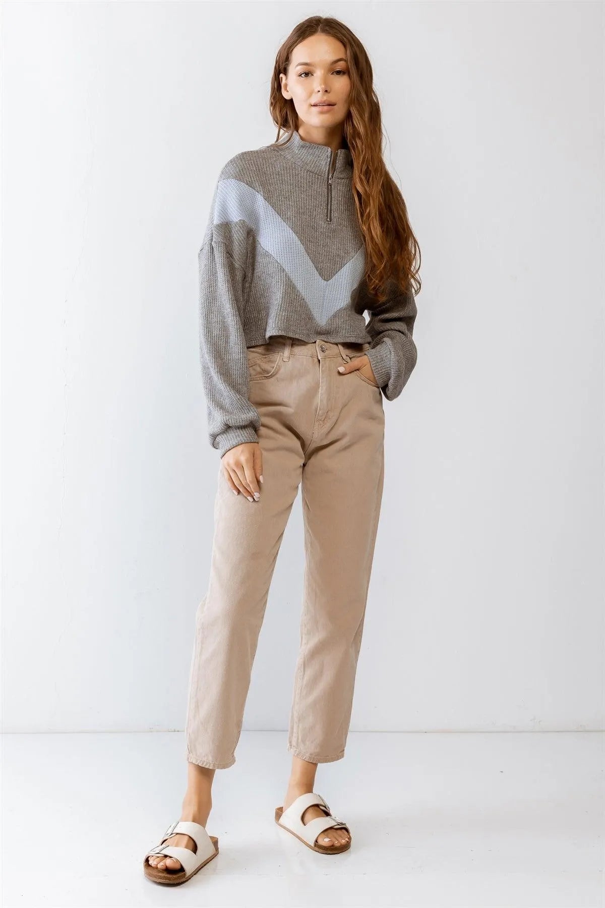 🖤 Item Features: Grey & front blue detail, knit material, turtle neckline with zip-up closure, dropped shoulders, cuffed long sleeves, cropped length, unlined, non-stretchy, not see through, casual, cute, warm, cozy, trendy, must-have.