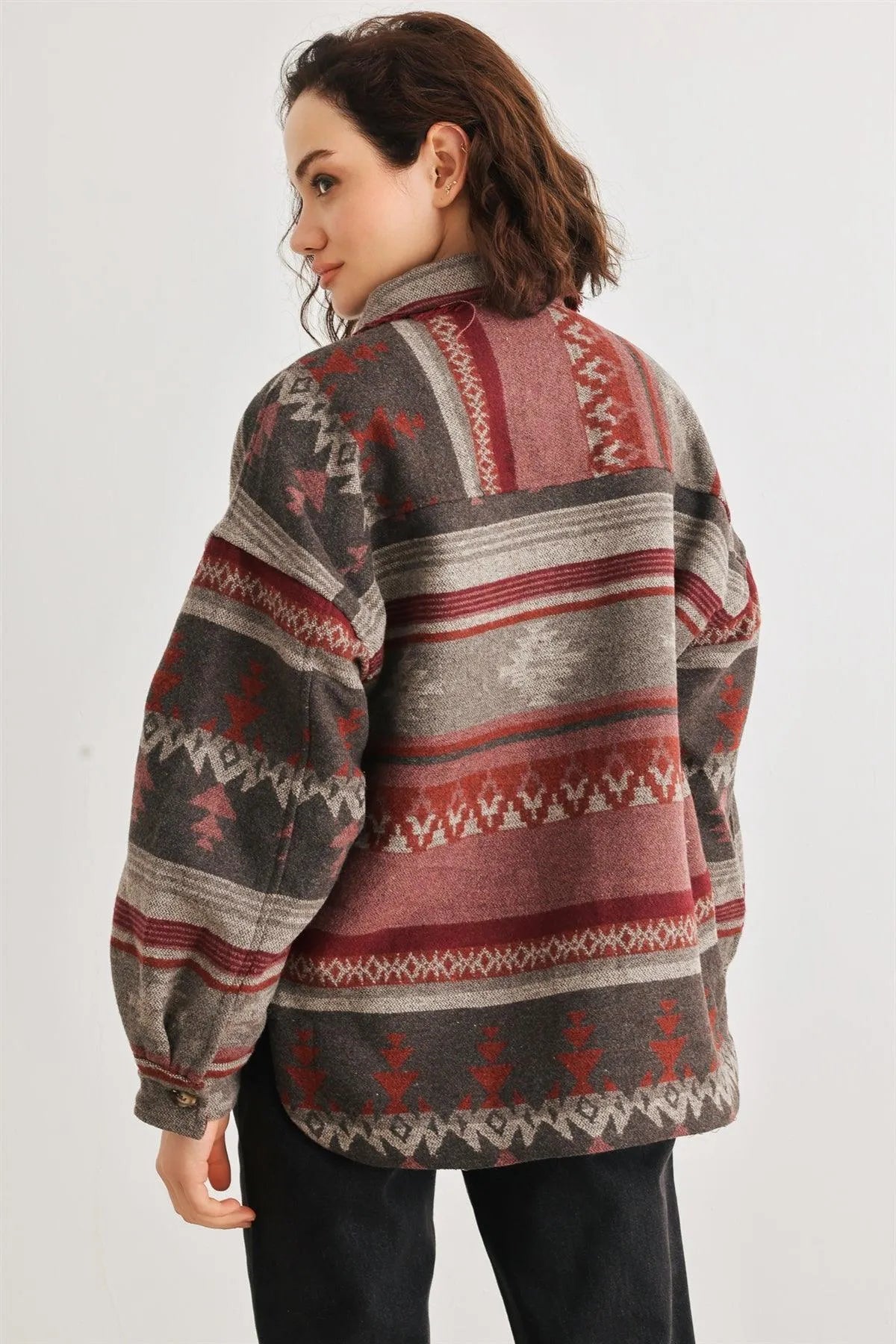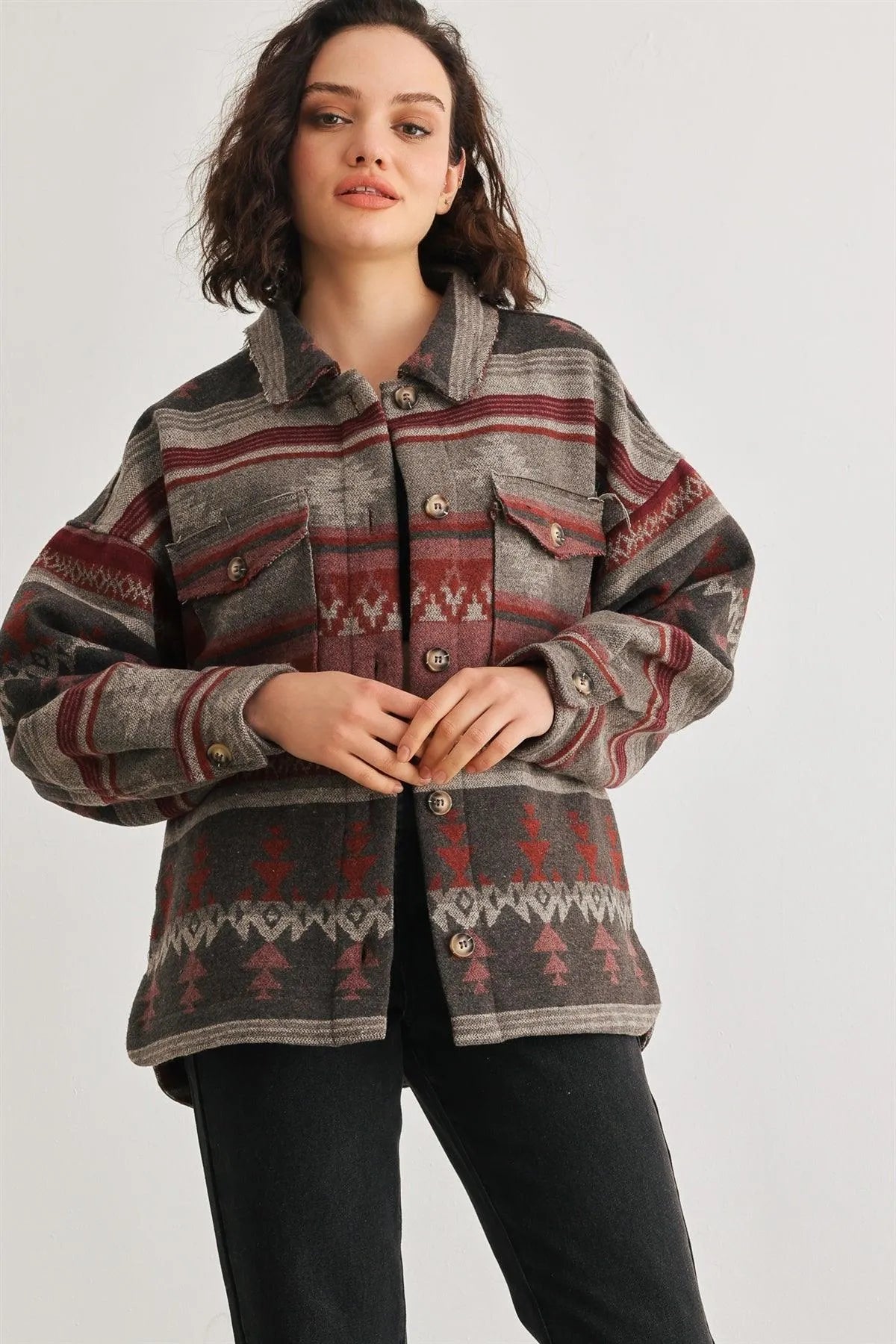 🖤 Item Features: Grey mix, tribal print, long sleeves, button-up, four pockets, collared neckline, trim, non-stretchy, unlined, casual, cute, warm, cozy