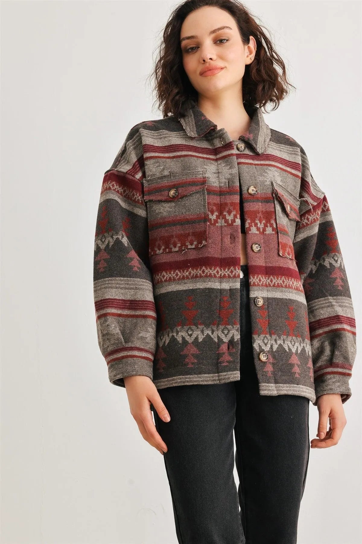 Grey Mix Tribal Print Button-Up Collared Neck Four Pocket Long Sleeve Jacket /2-2-2