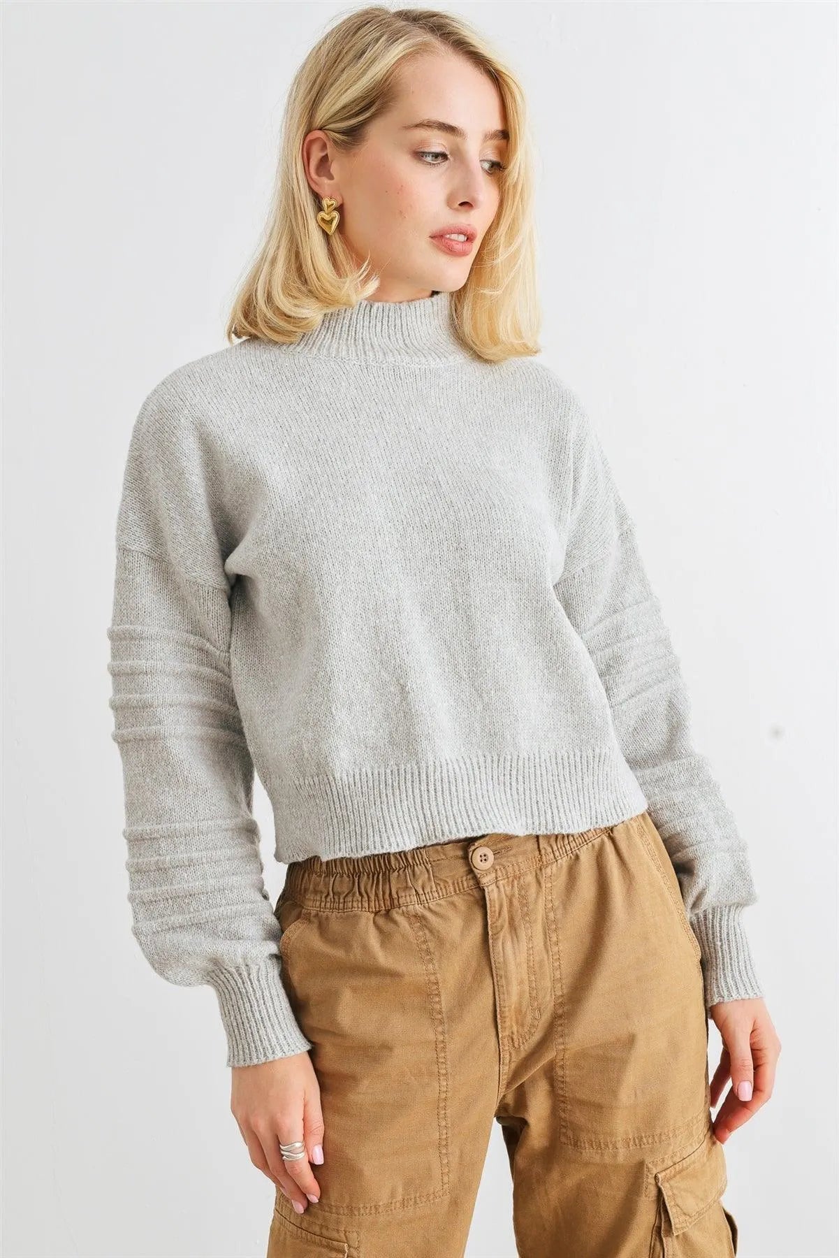 Heather Grey Knit Mock Neck Lantern Sleeve Sweater /2-2-2