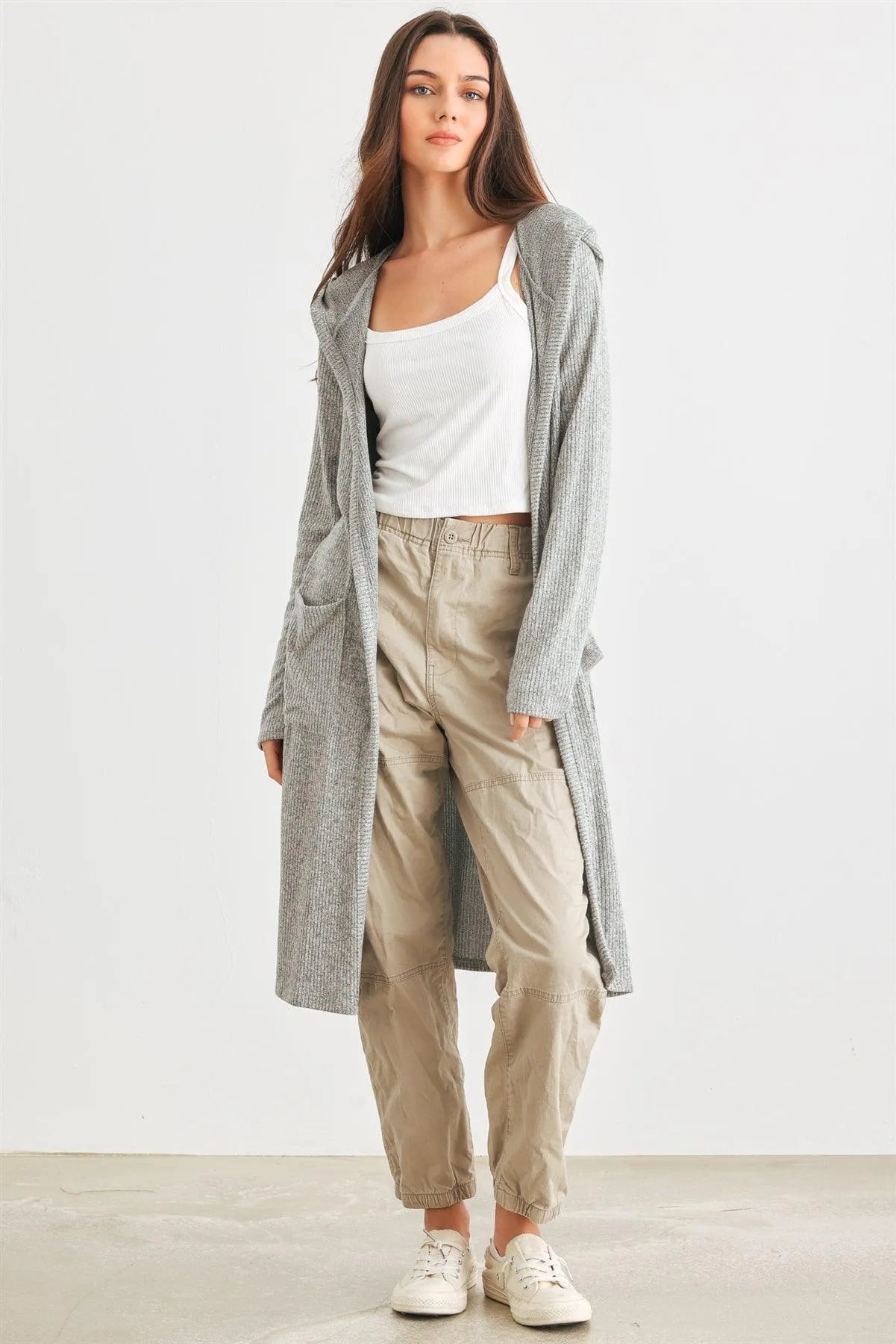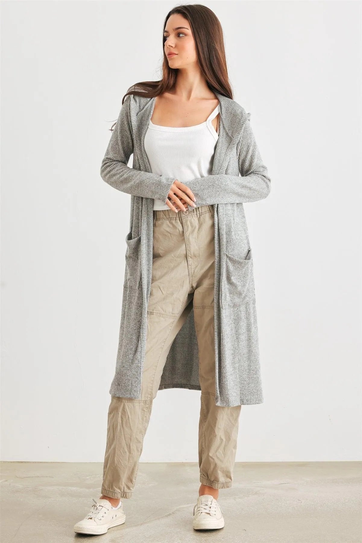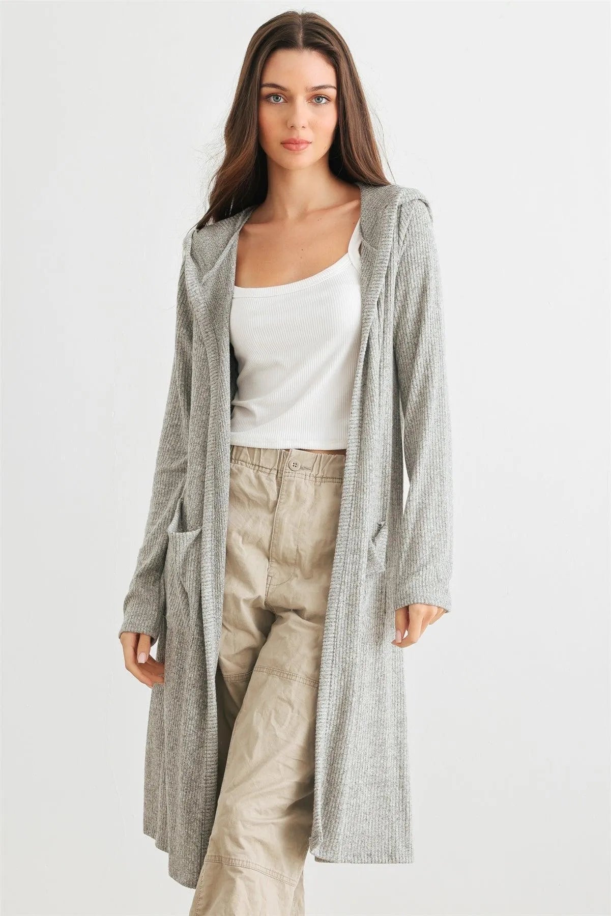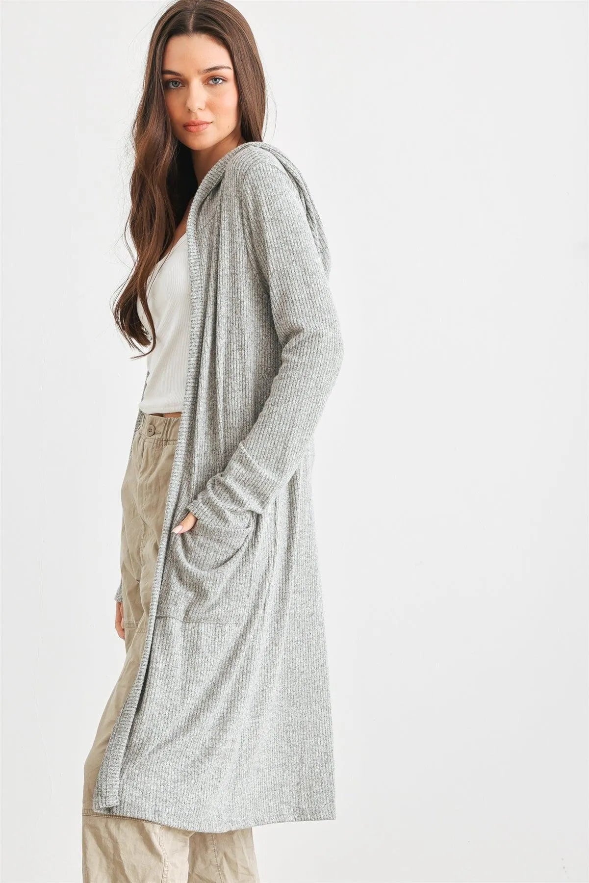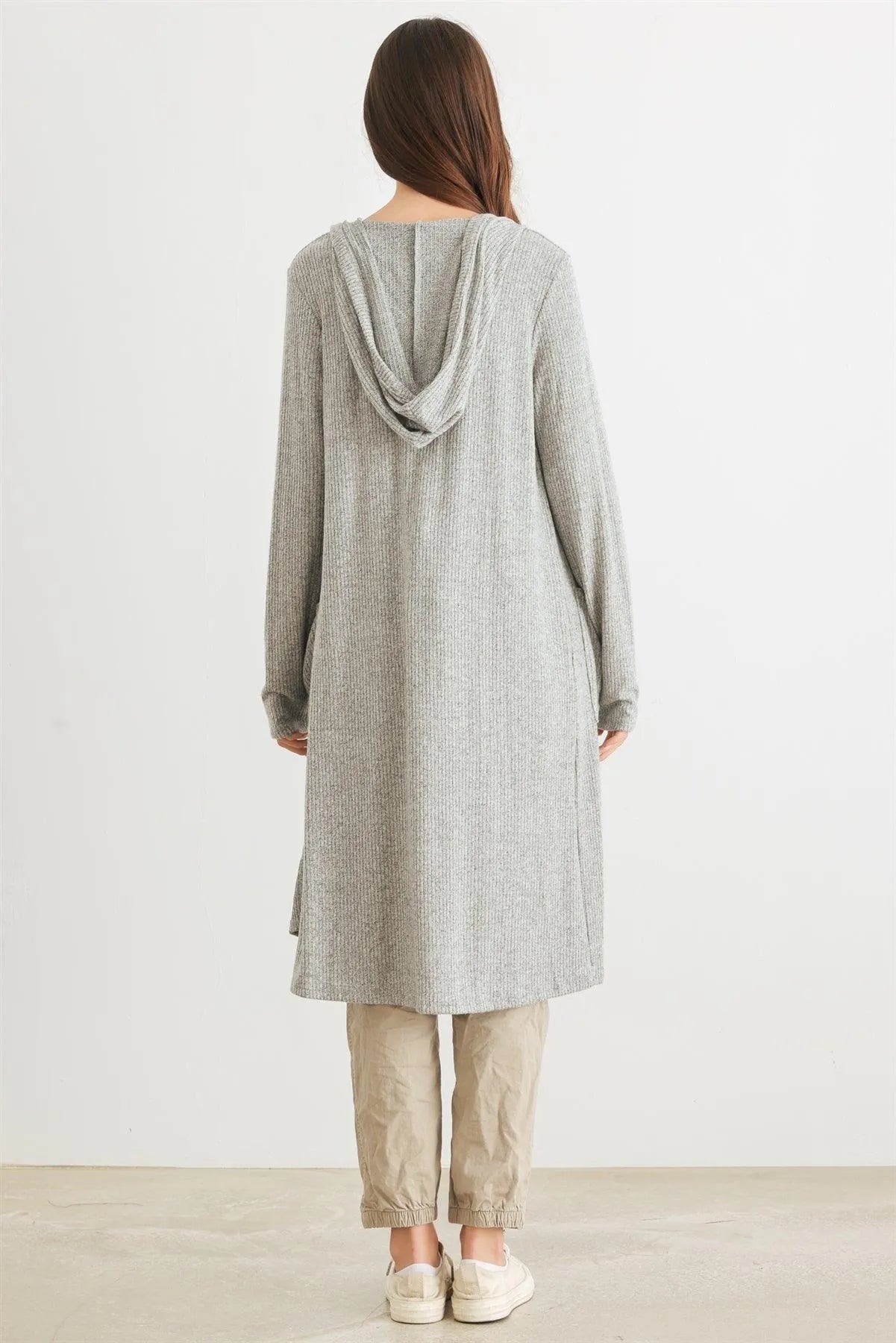 Heather Grey Ribbed Two Pocket Open Front Hooded Cardigan /2-2-2