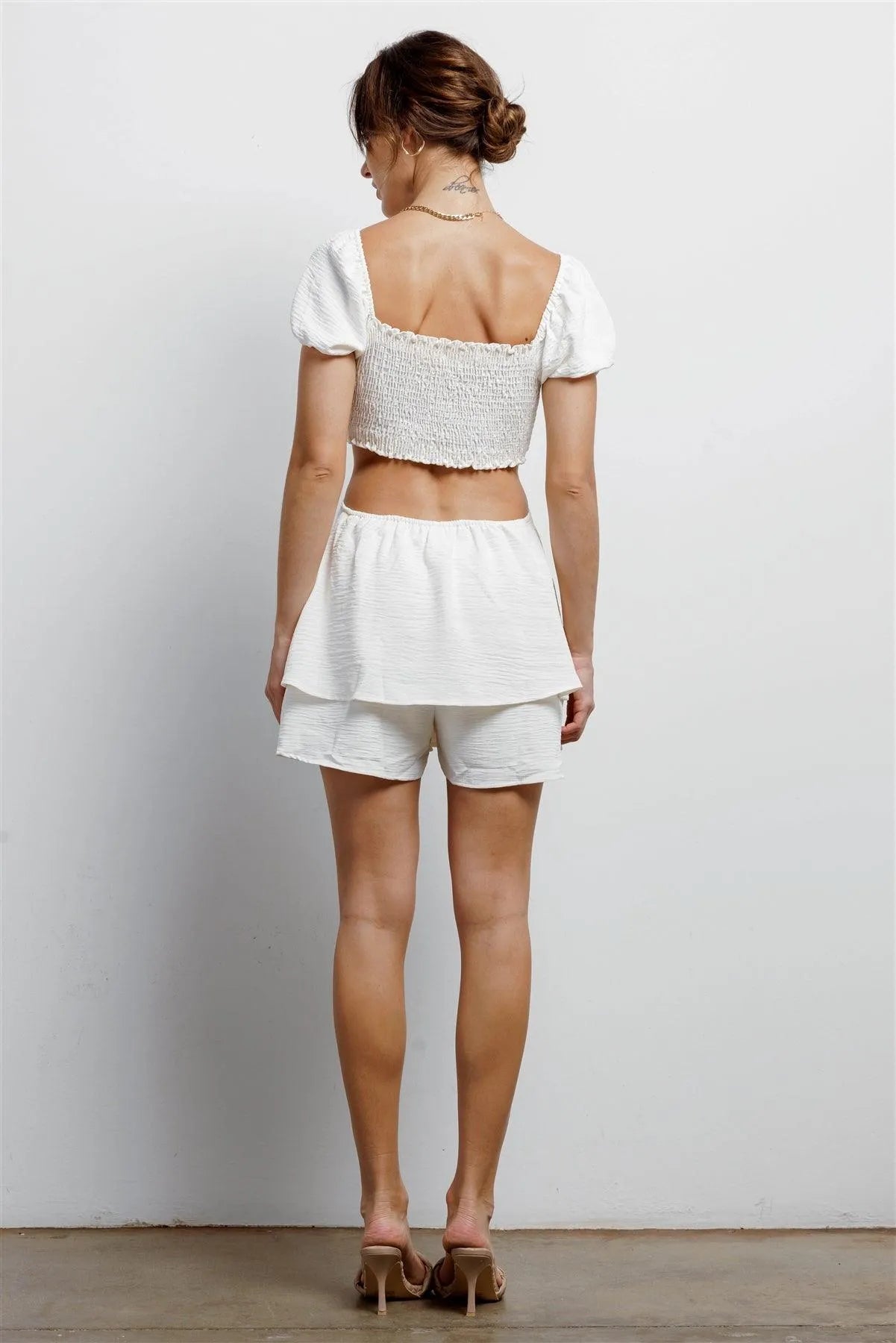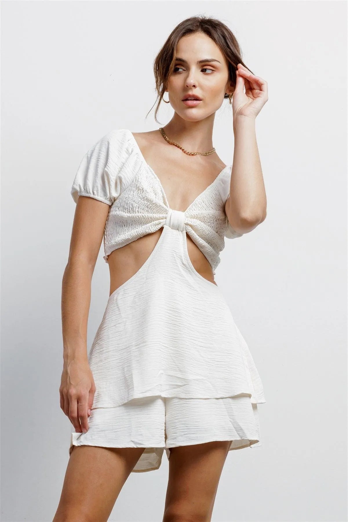 🖤 Item Features: Ivory, smocked, textured, front bow & cut-out details, puff short sleeve, mini lengths, flare hem, lined, stretchy, non-sheer, stylish, trendy, cut-out style, cute, girlish, street style, must-have