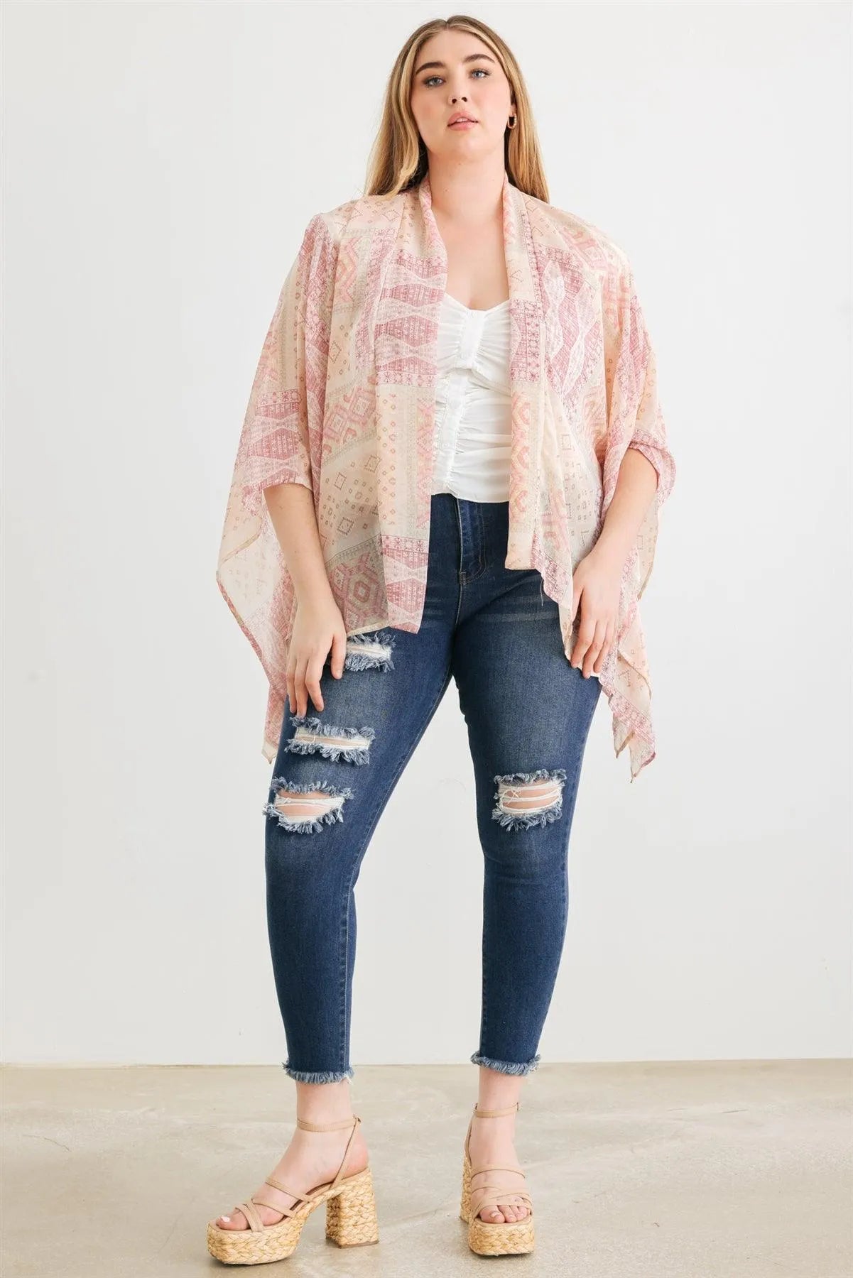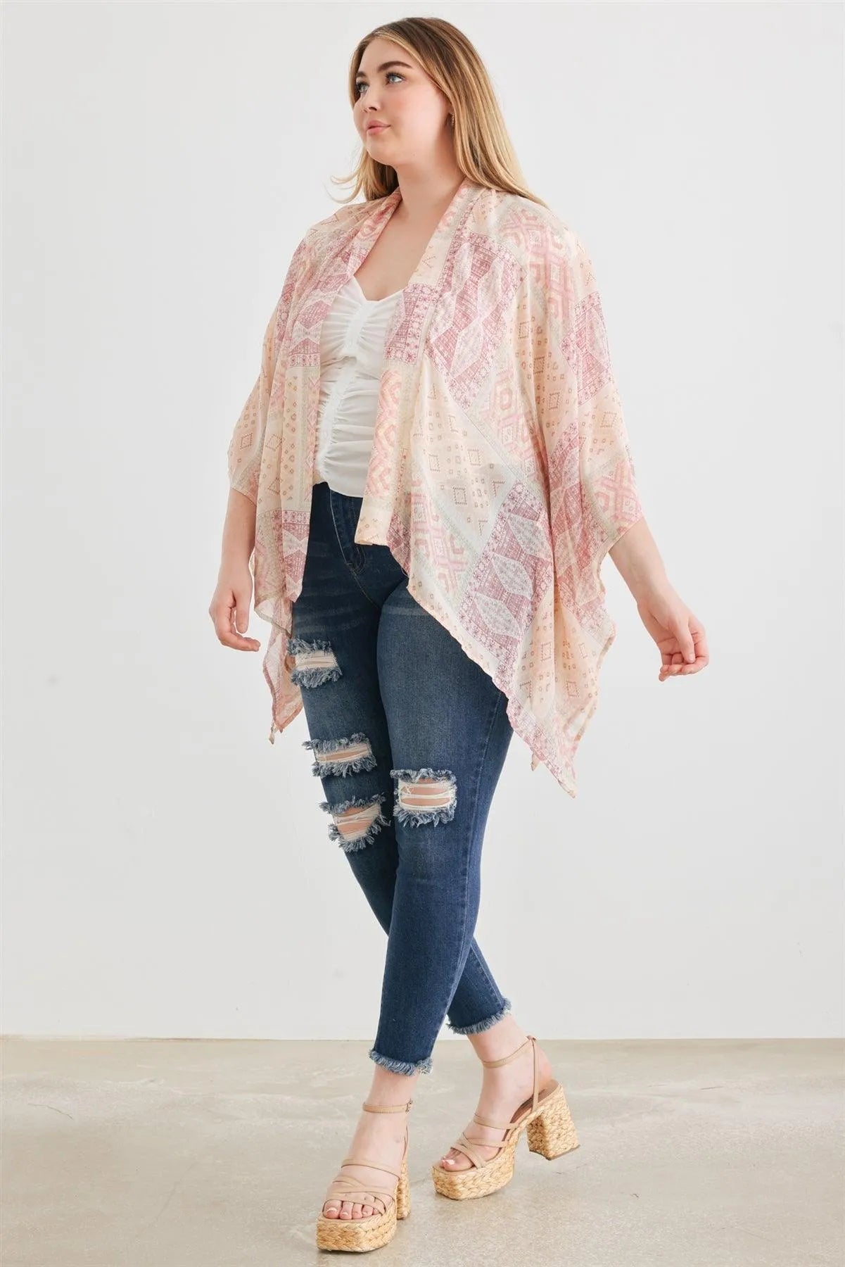 Junior Plus Berry Tribal Print Chiffon Open Front Kimono/Cover Up /2-2-1