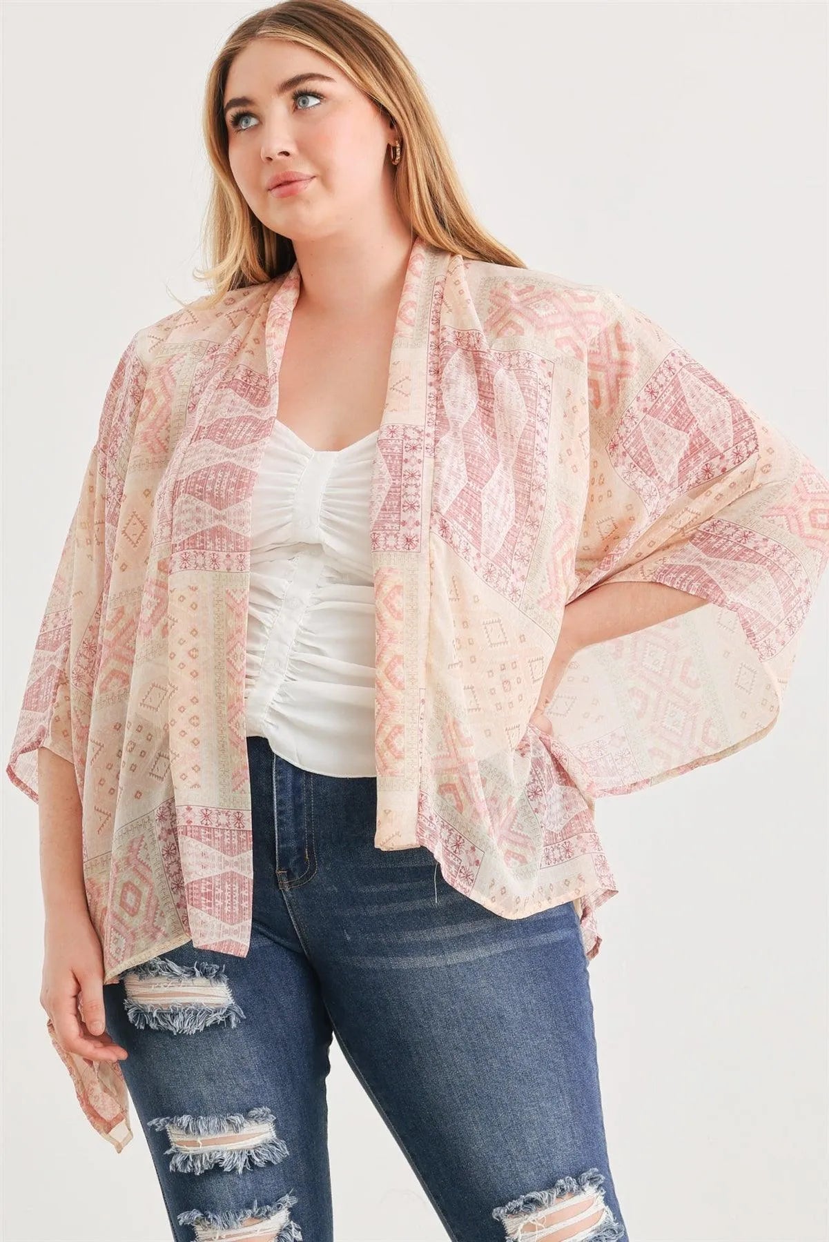 Plus Size Berry Boho Tribal Print Chiffon Kimono Cover Up