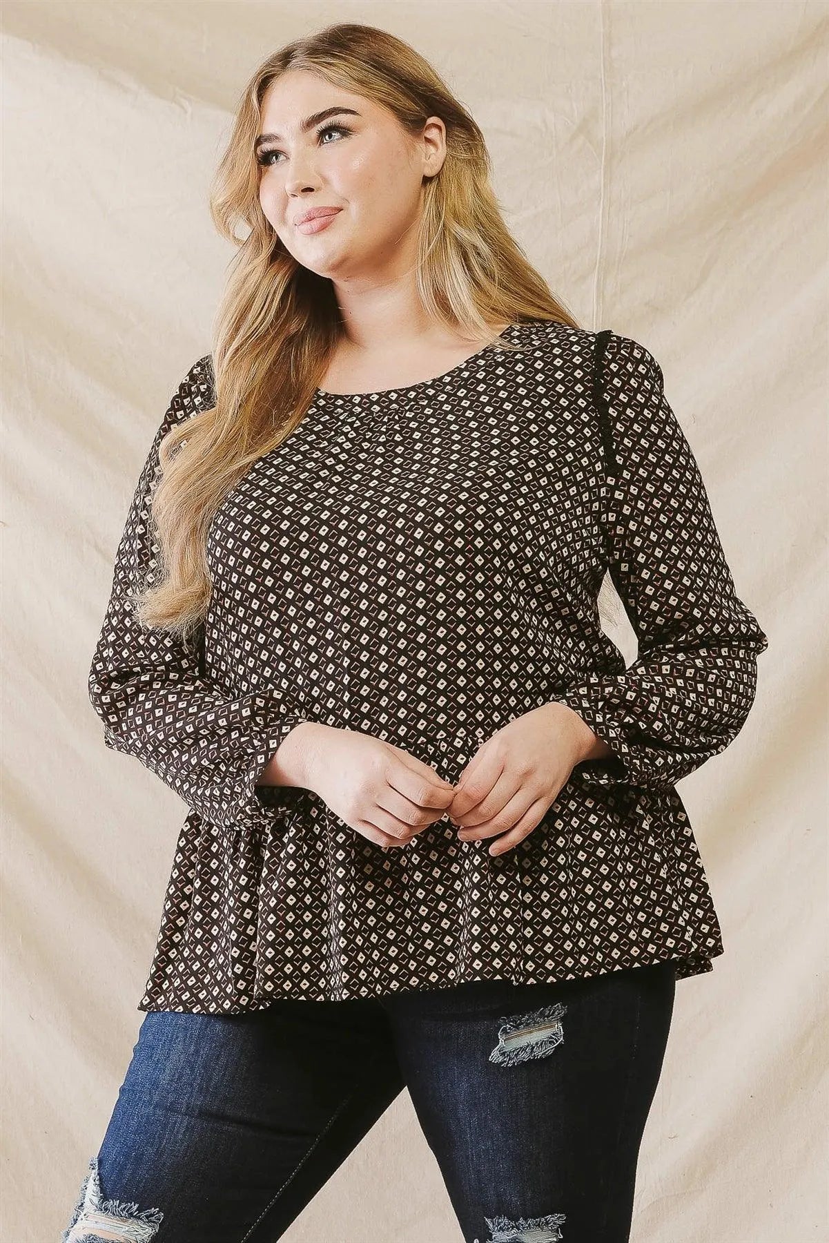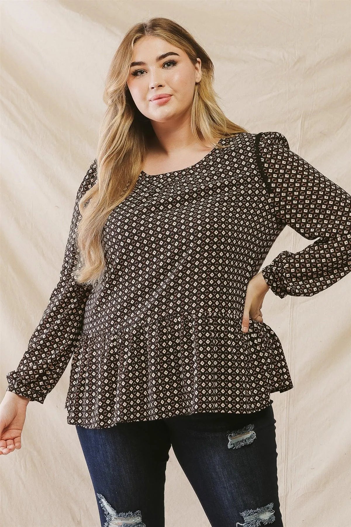 Junior Plus Black Chevron Print Embroidery Shoulder Detail Flare Hem Top /3-2-1