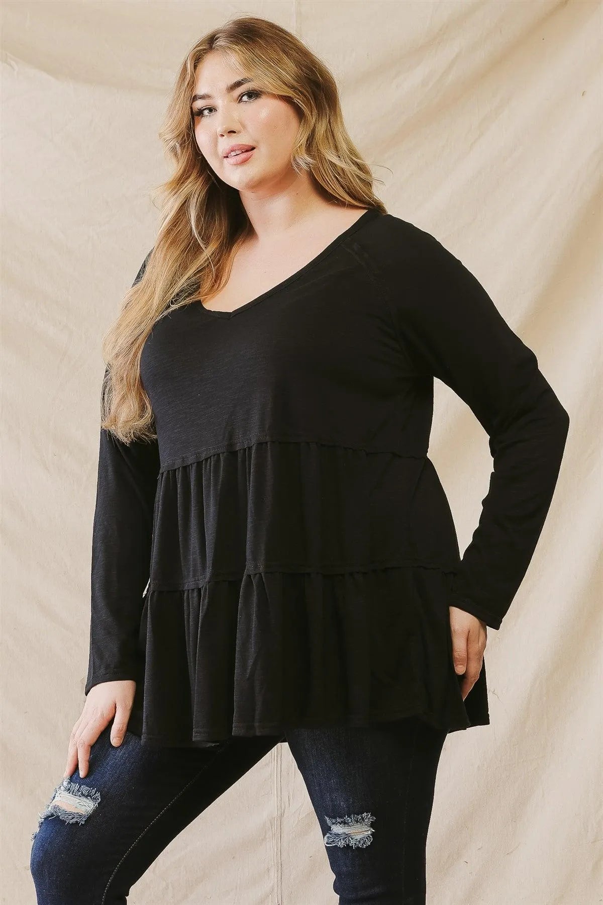 Junior Plus Black Flare Hem V-Neck Long Sleeve Top /2-2-1