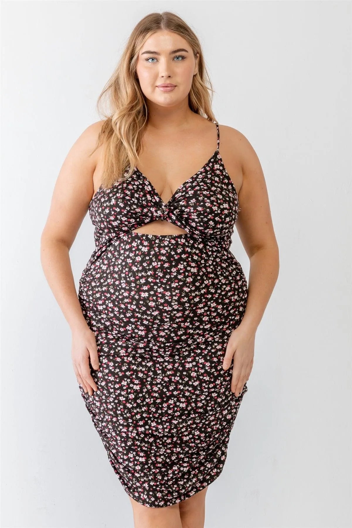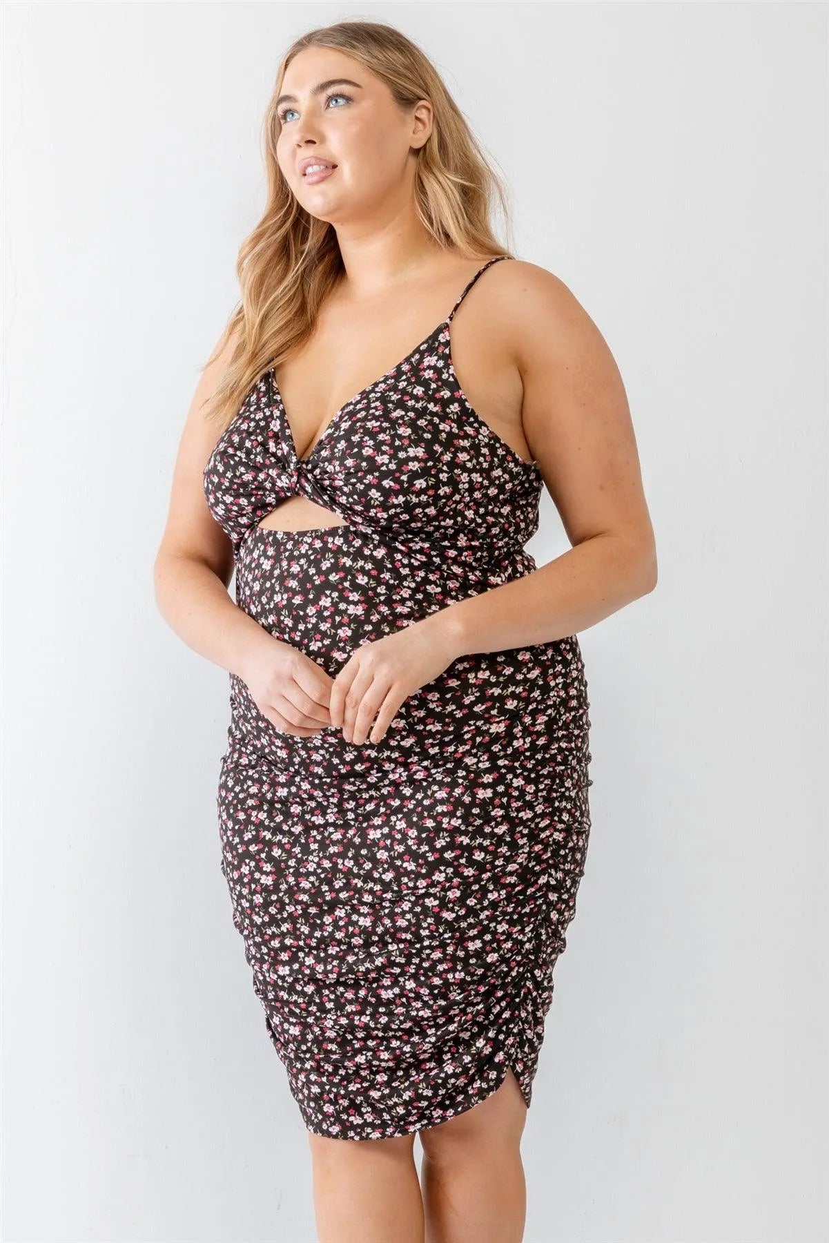 Plus Size Floral Twist Cut-Out Ruched Strappy Midi Dress