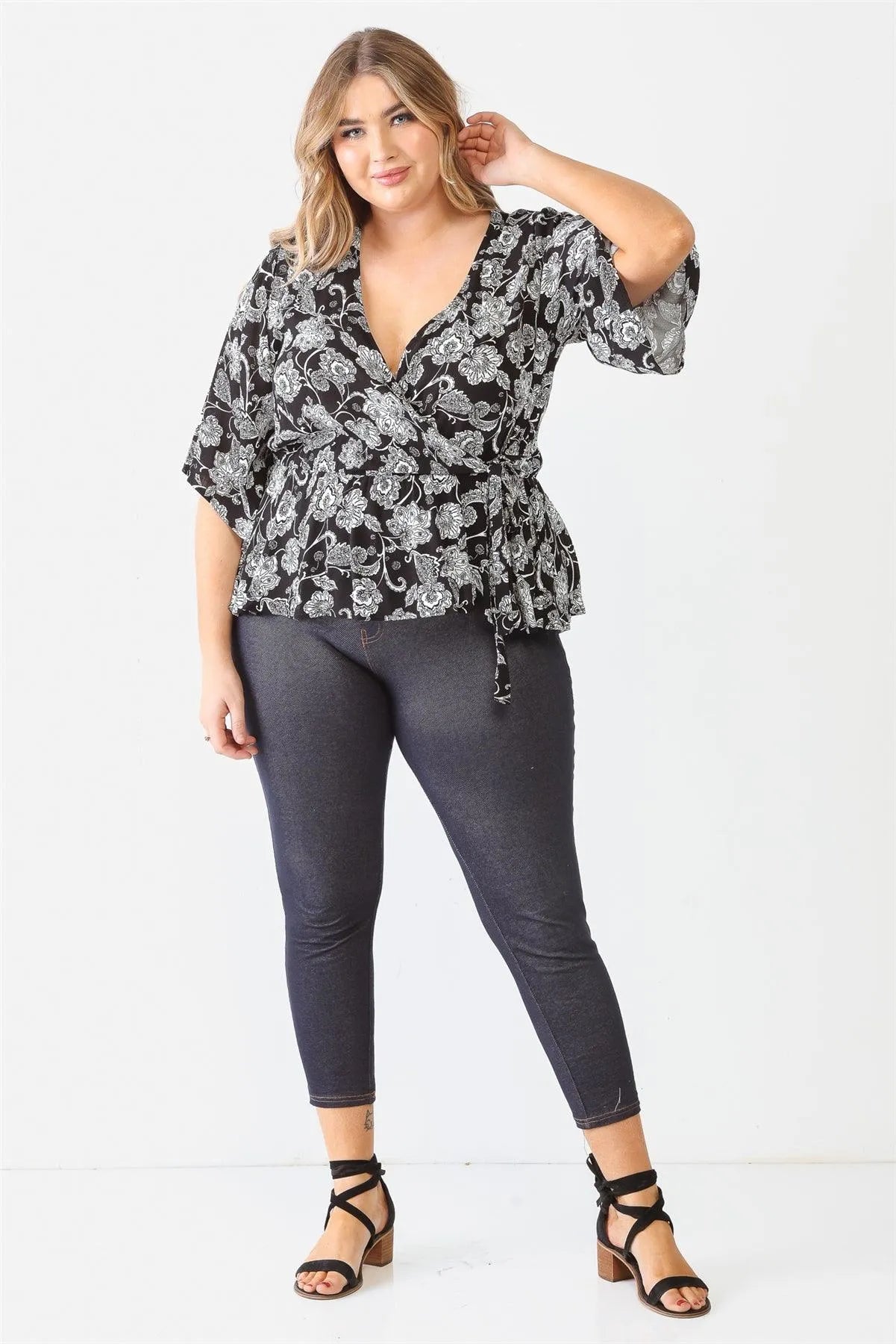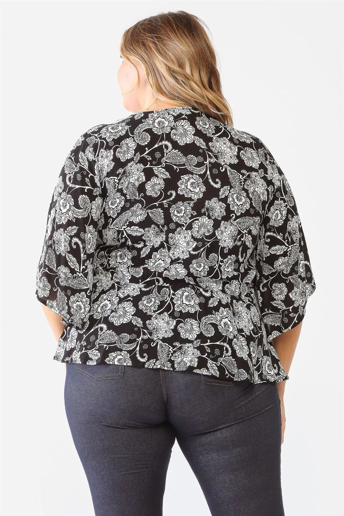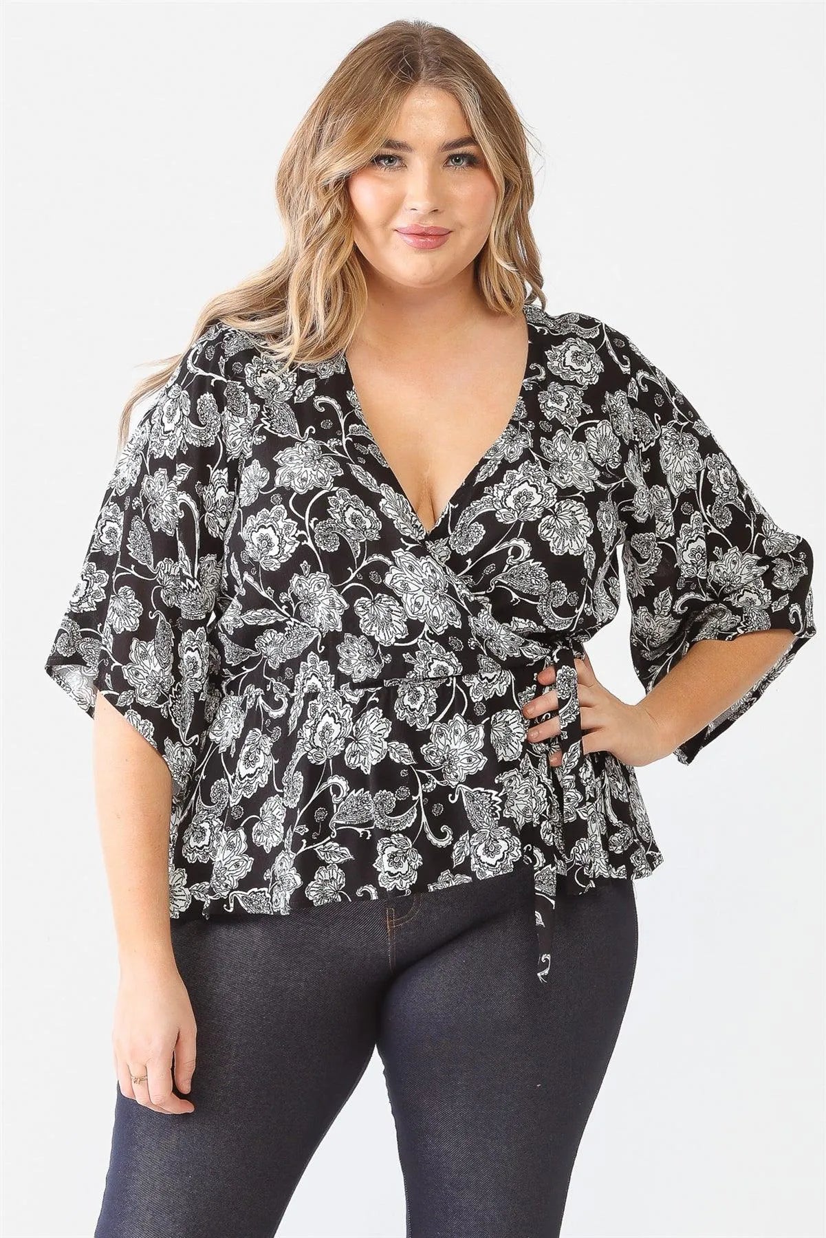 Junior Plus Black Floral Wrap Tie Detail Midi Sleeve Top /1-1-1
