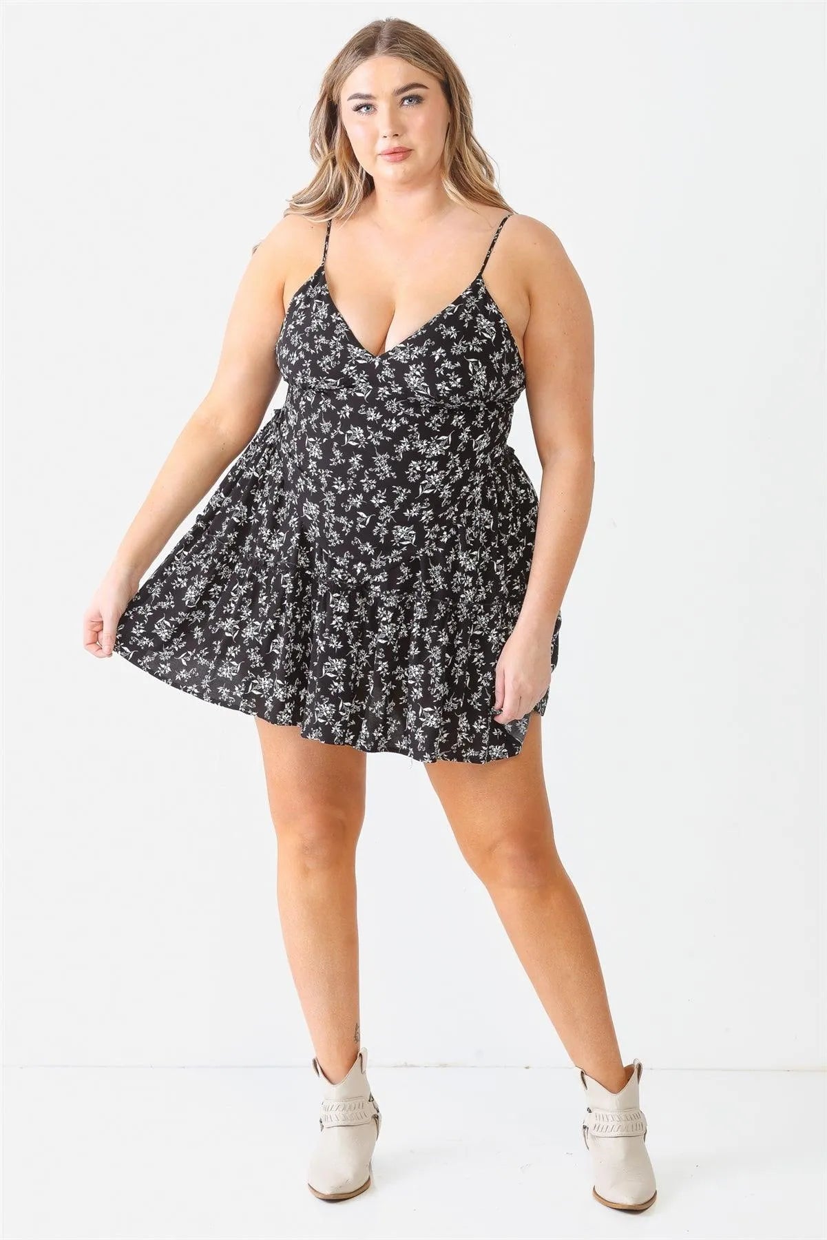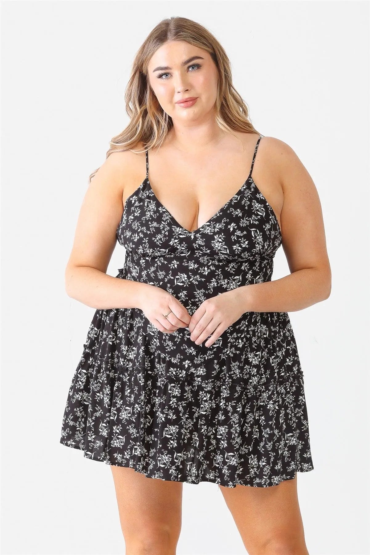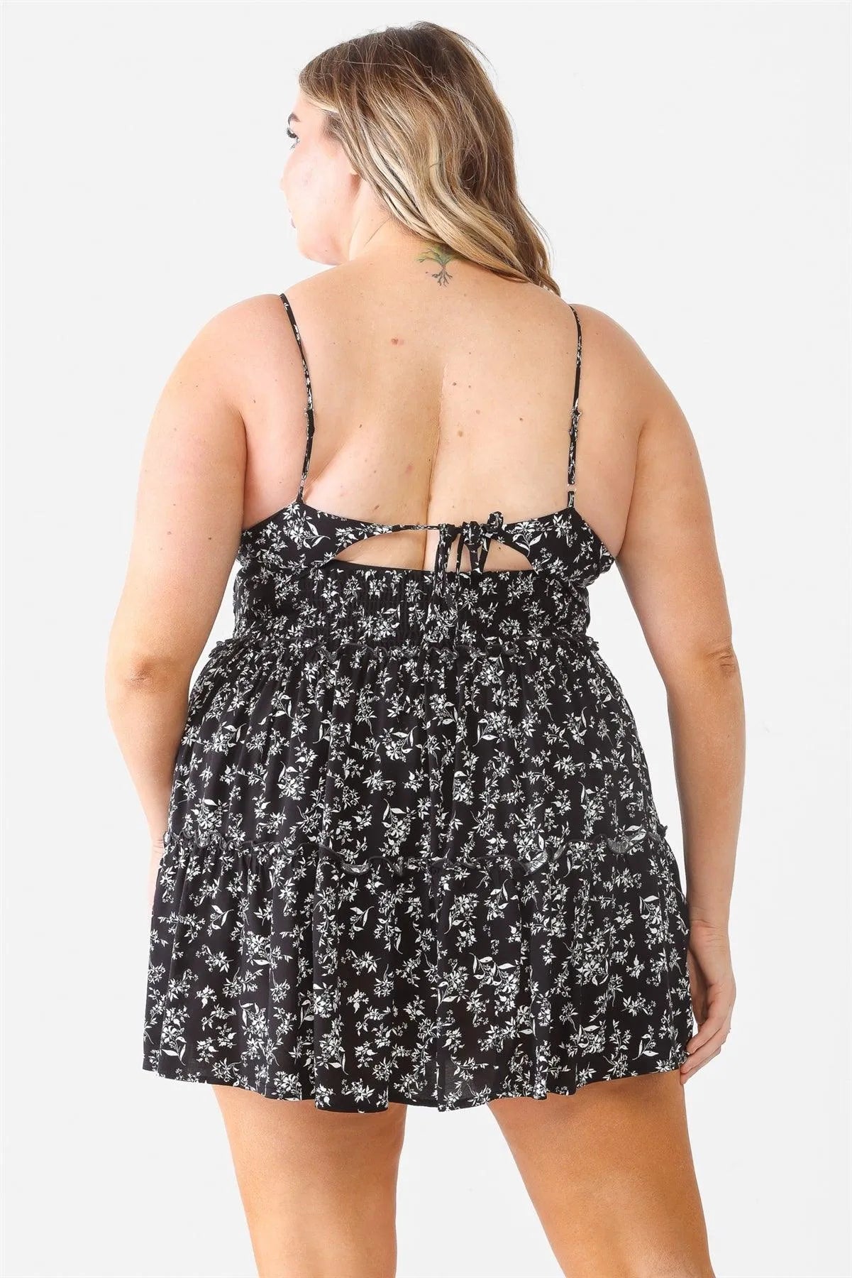 🖤 Item Features: Black, flower print, adjustable straps, sleeveless, self-tie back, v-neckline, hanky hem top, high waist, elasticized smocked waist, mini length skirt, semi-stretchy, unlined, not see through, cute, girlish, cool, must-have.