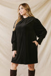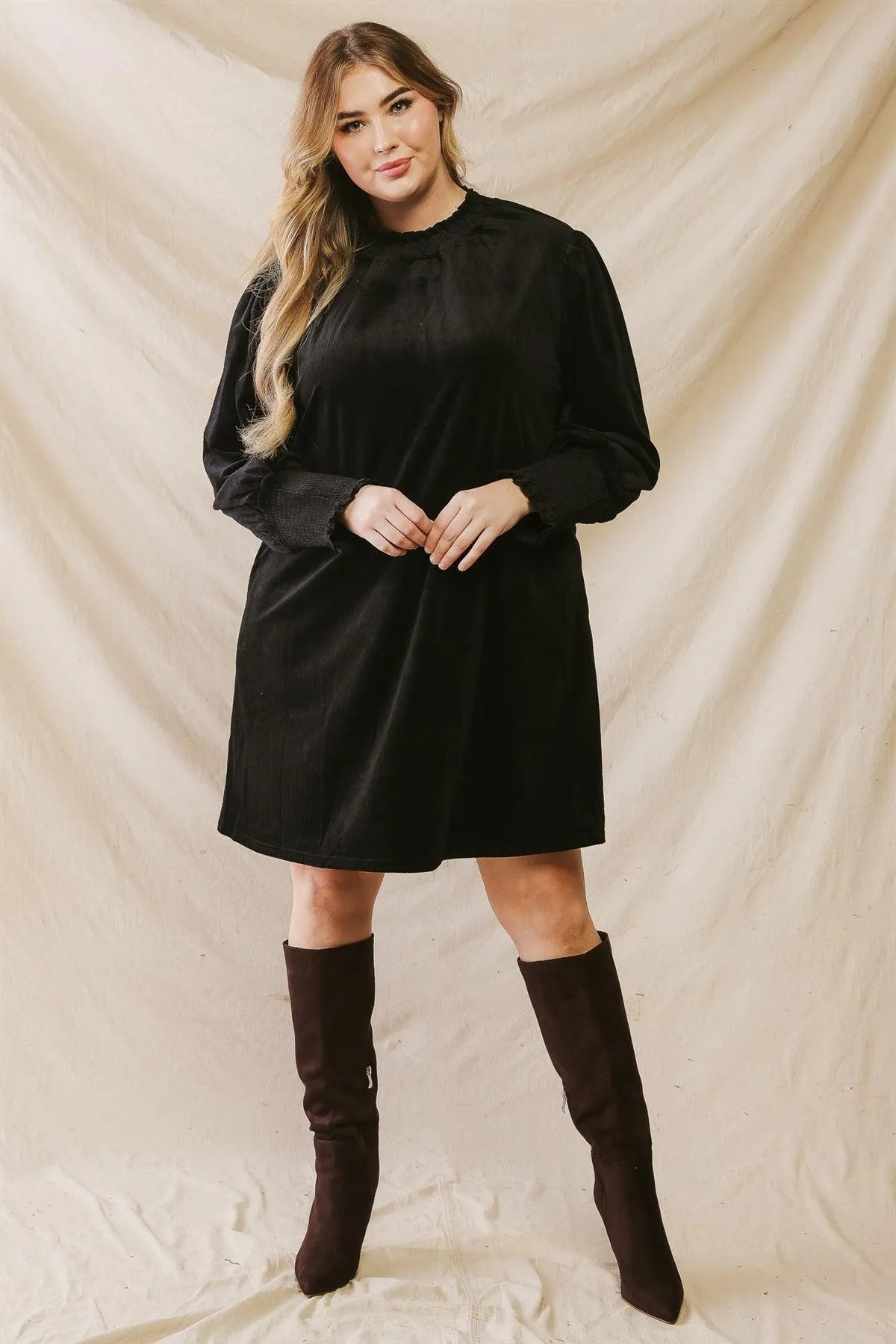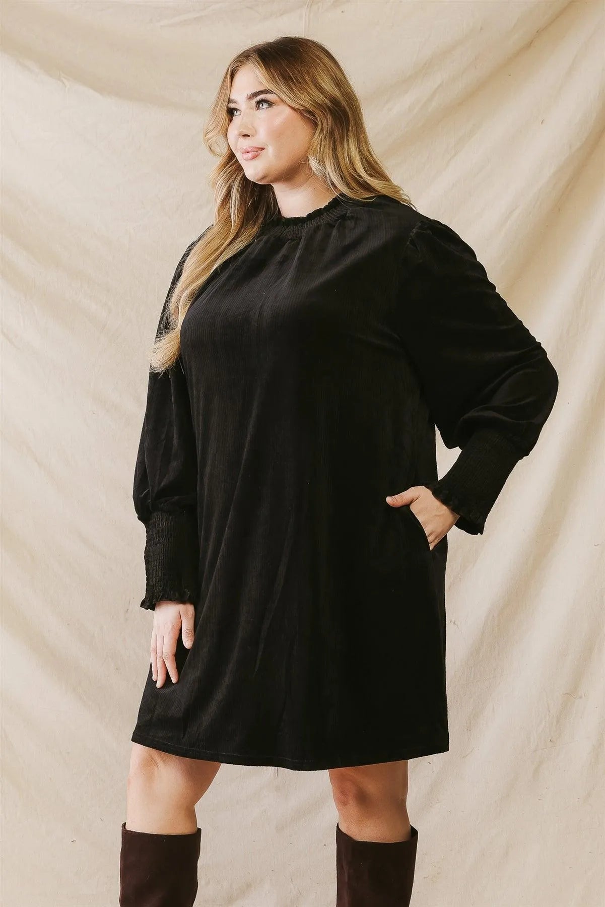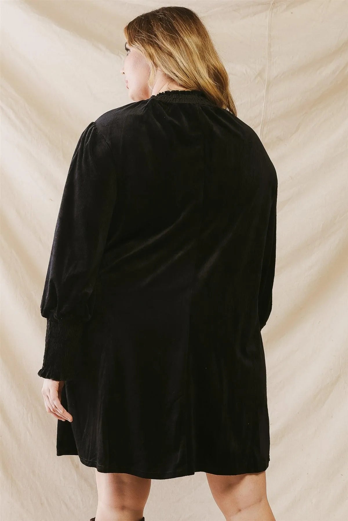 Junior Plus Black Ribbed Velvet Effect Long Sleeve Mini Dress /2-2-1