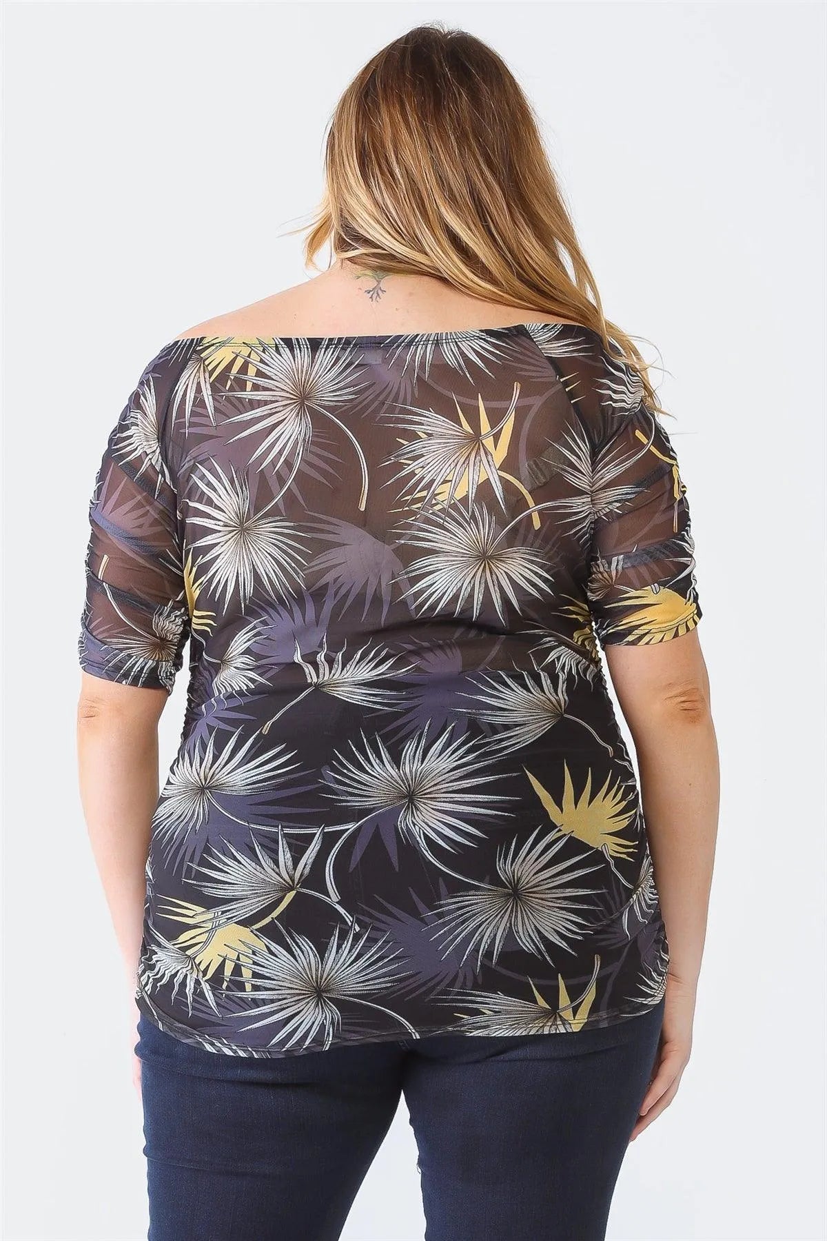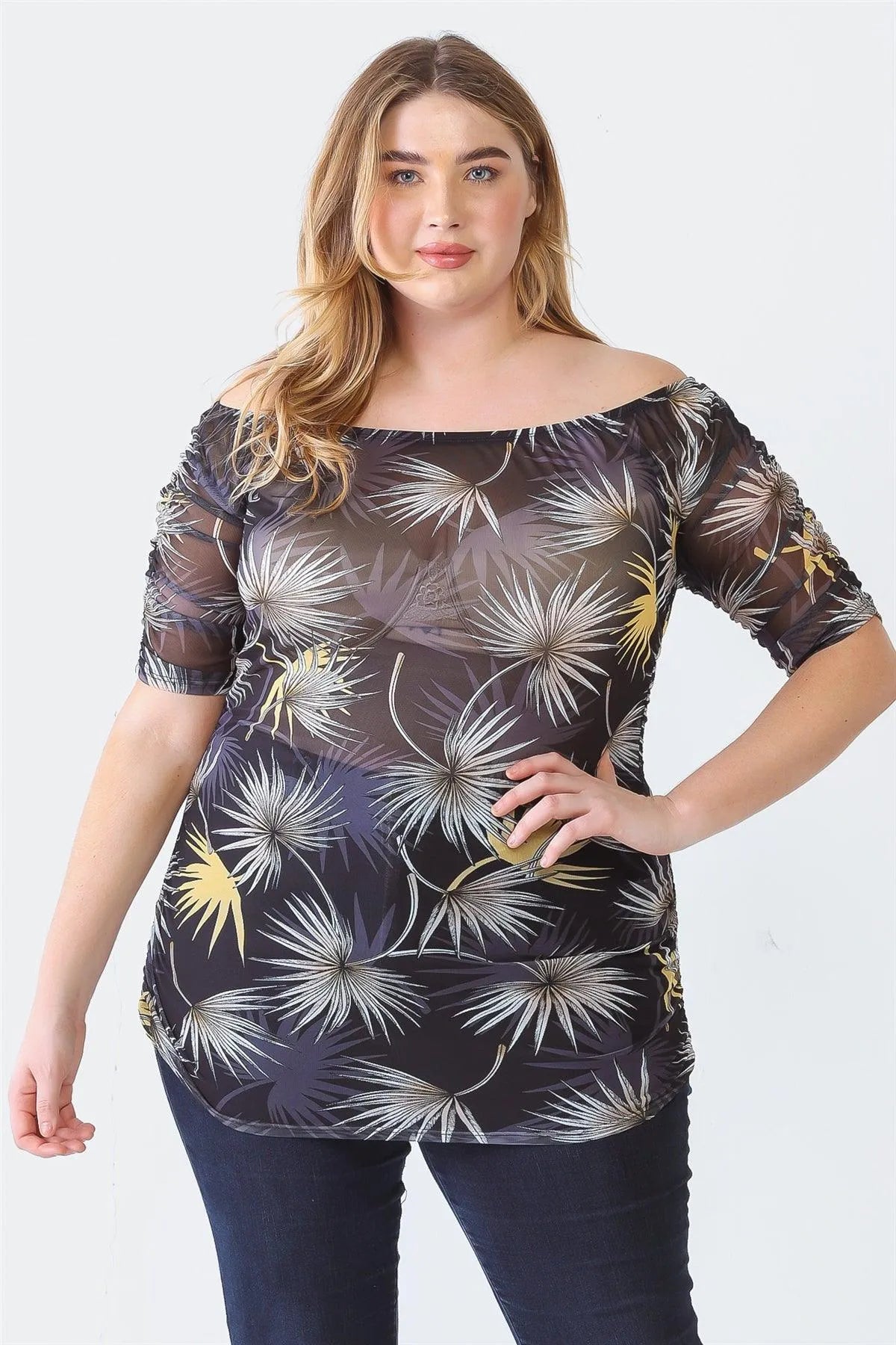 Junior Plus Black Palm Leaves Print Sheer Mesh Ruched Off-The-Shoulder Top /1-1-1