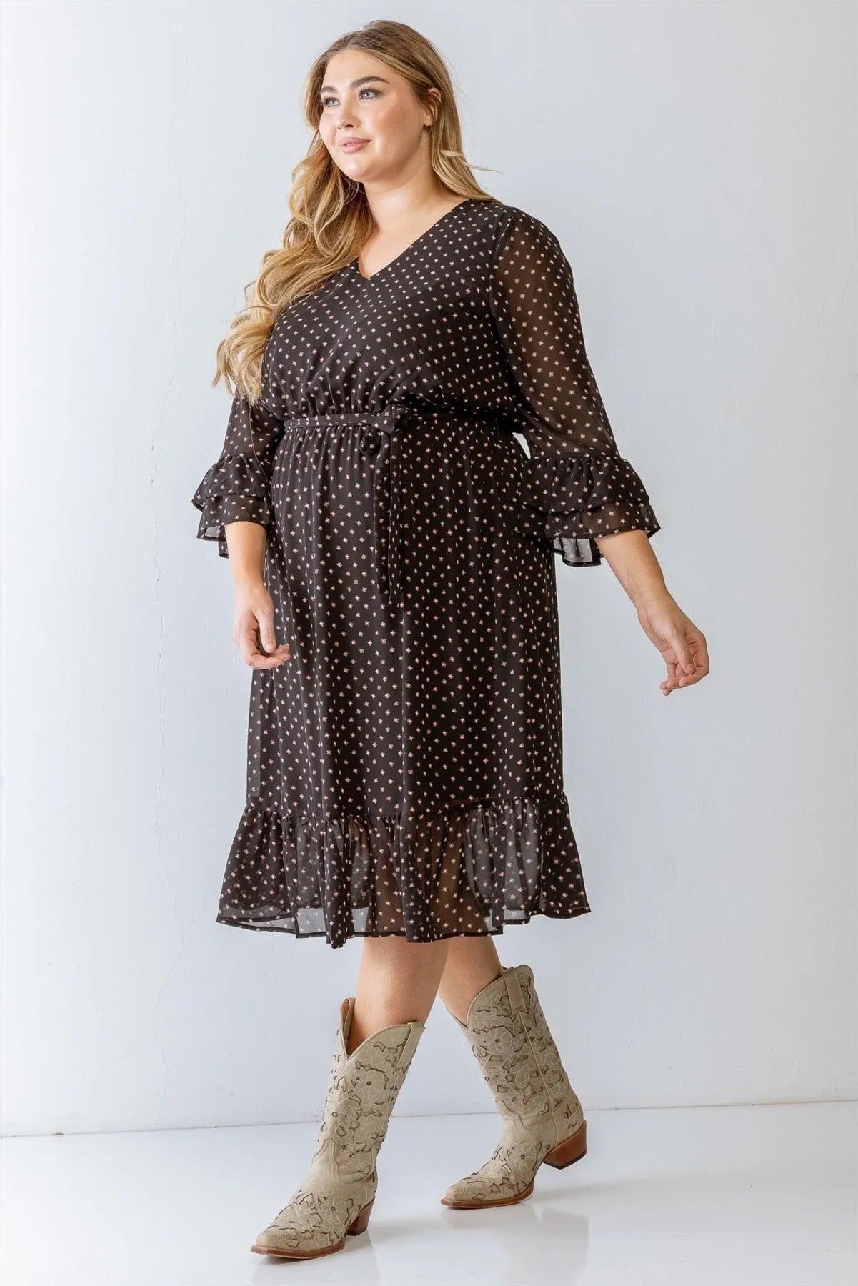 Junior Plus Black Print Belted Flare Hem Midi Dress /2-2-1