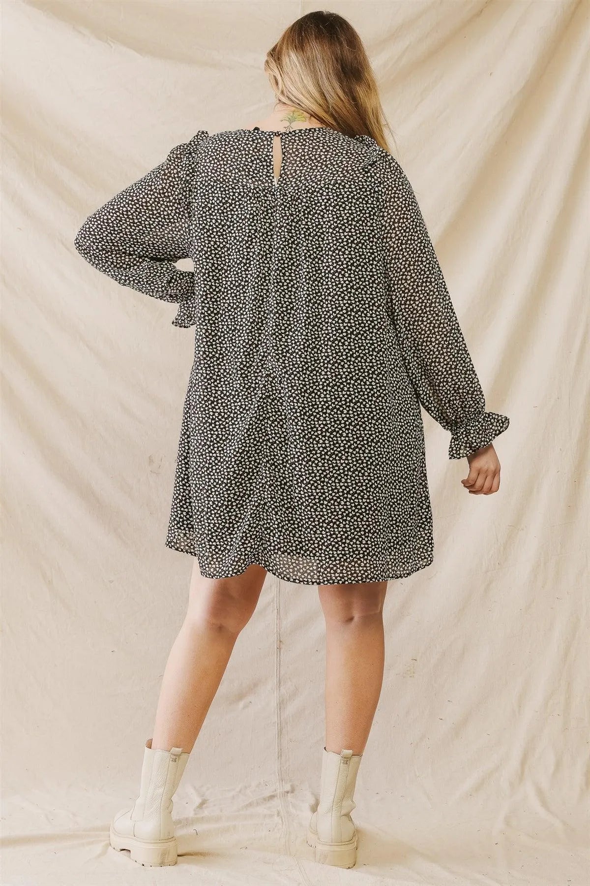 Junior Plus Black Print Ruffle Detail Long Sleeve Mini Dress /3-2-1