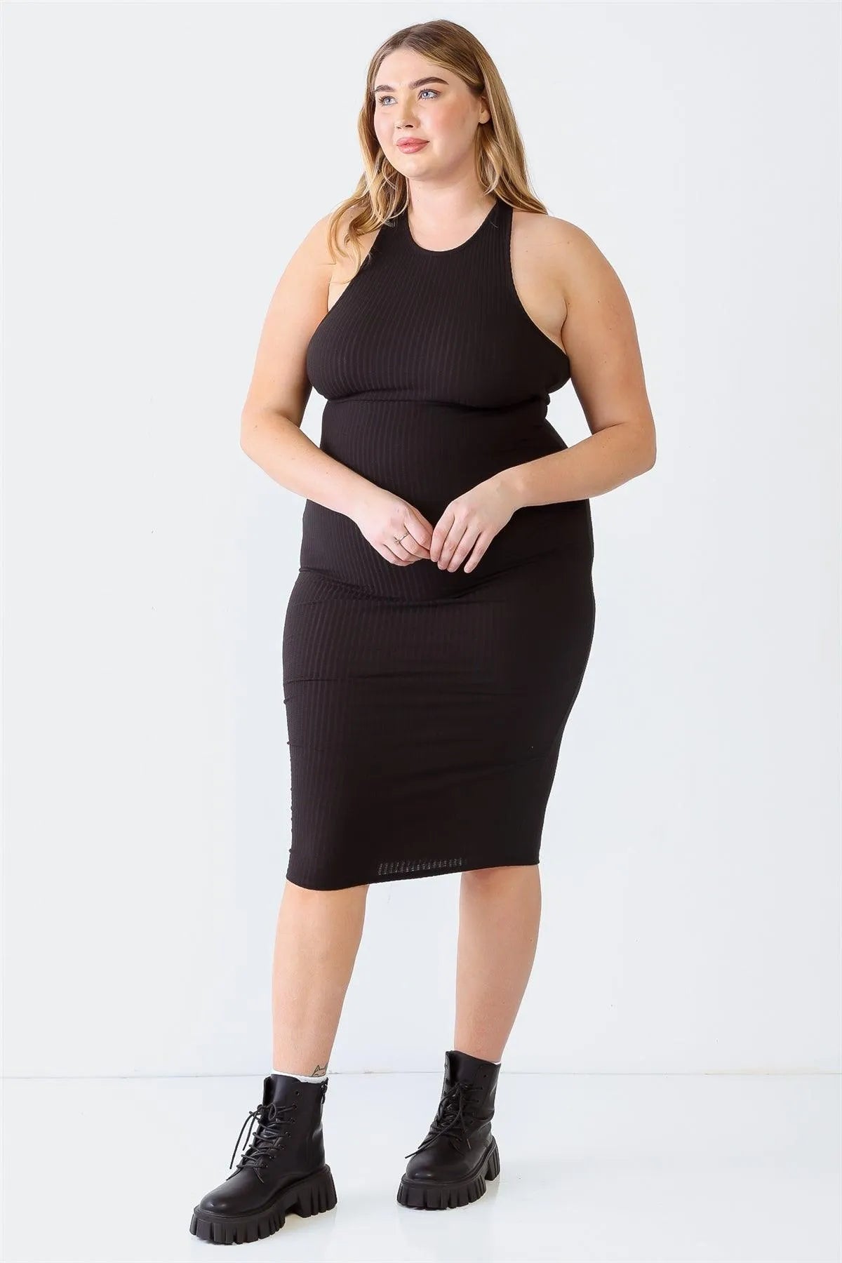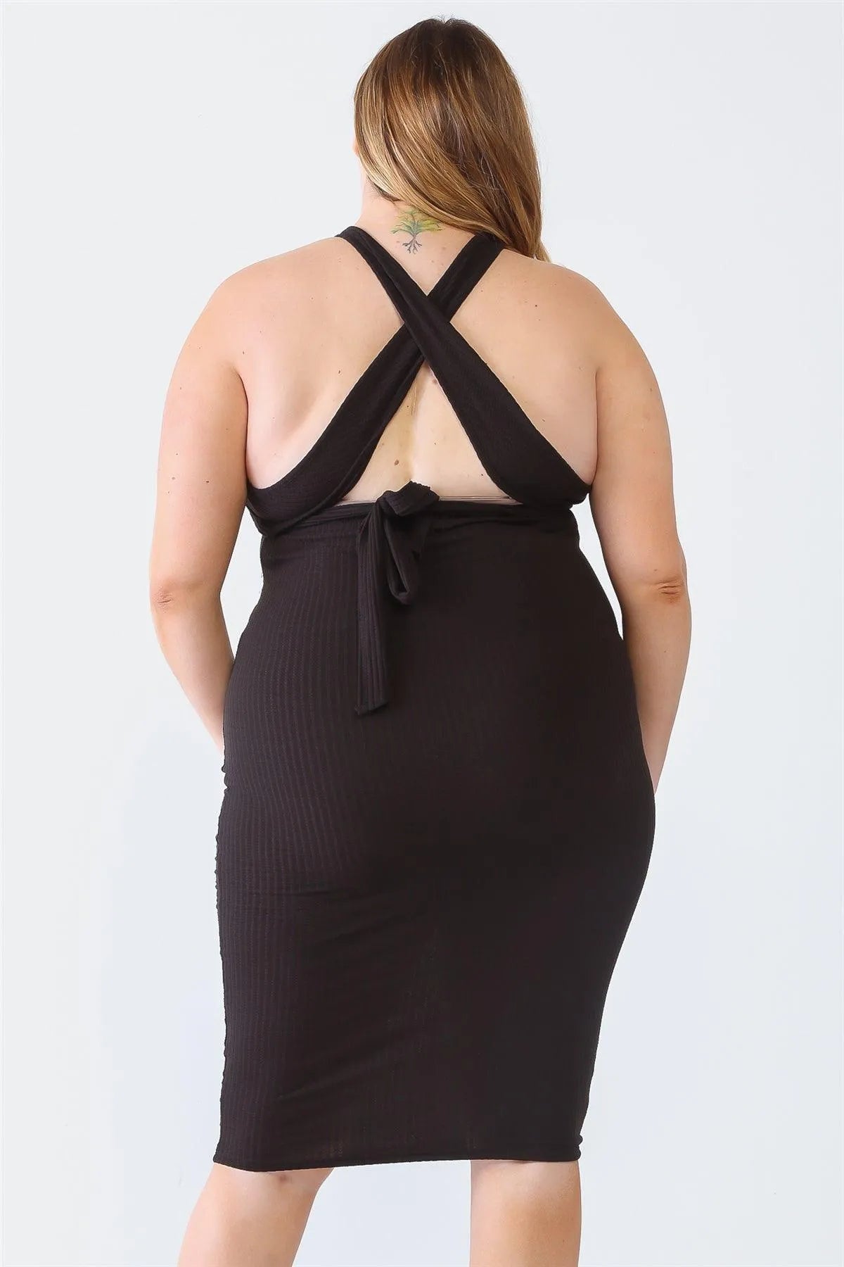 Junior Plus Black Ribbed Sleeveless Criss-Cross Back Midi Dress /1-1-1