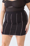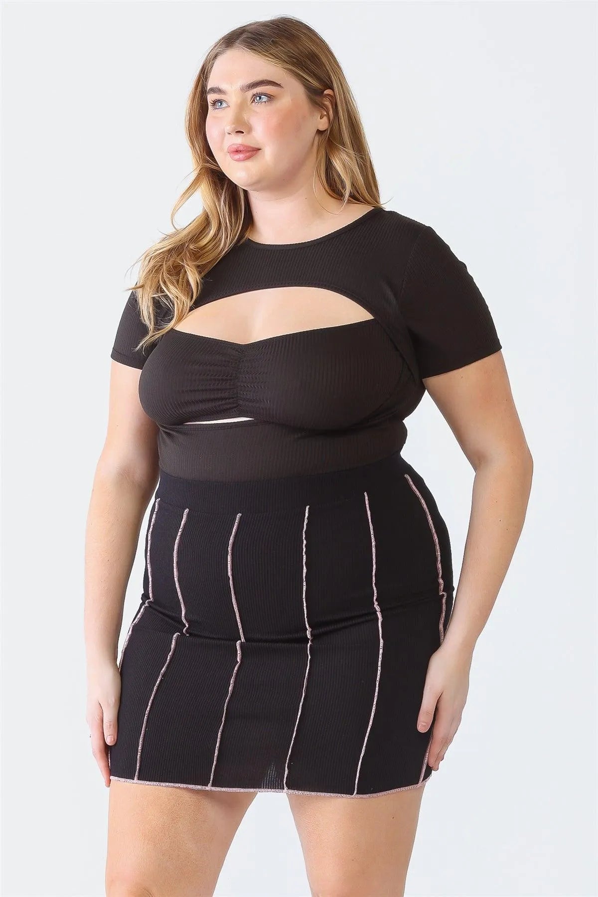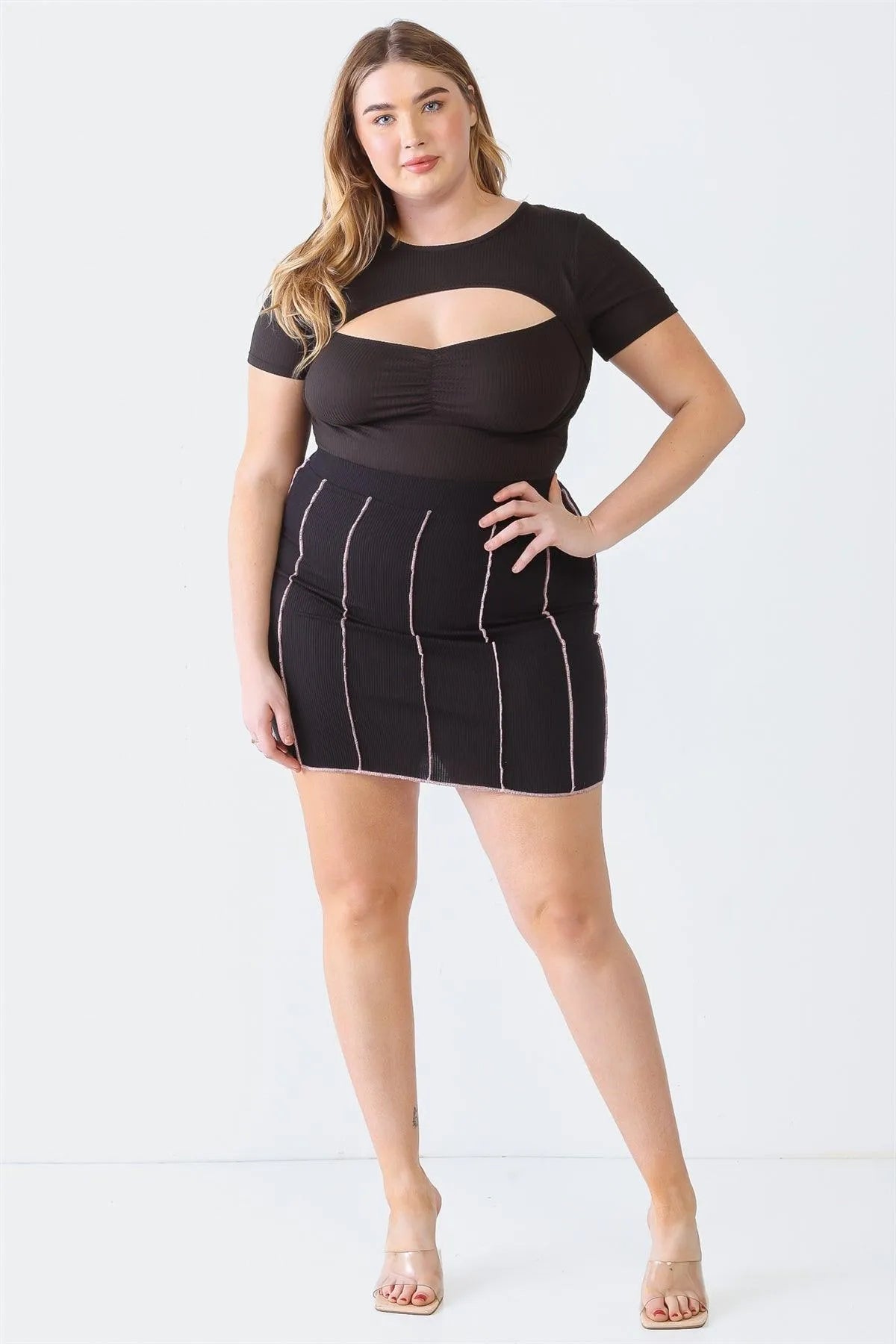 Plus Size Ribbed Contrast Stitch Mini Skirt - Black Bodycon Skirt Pink Accents