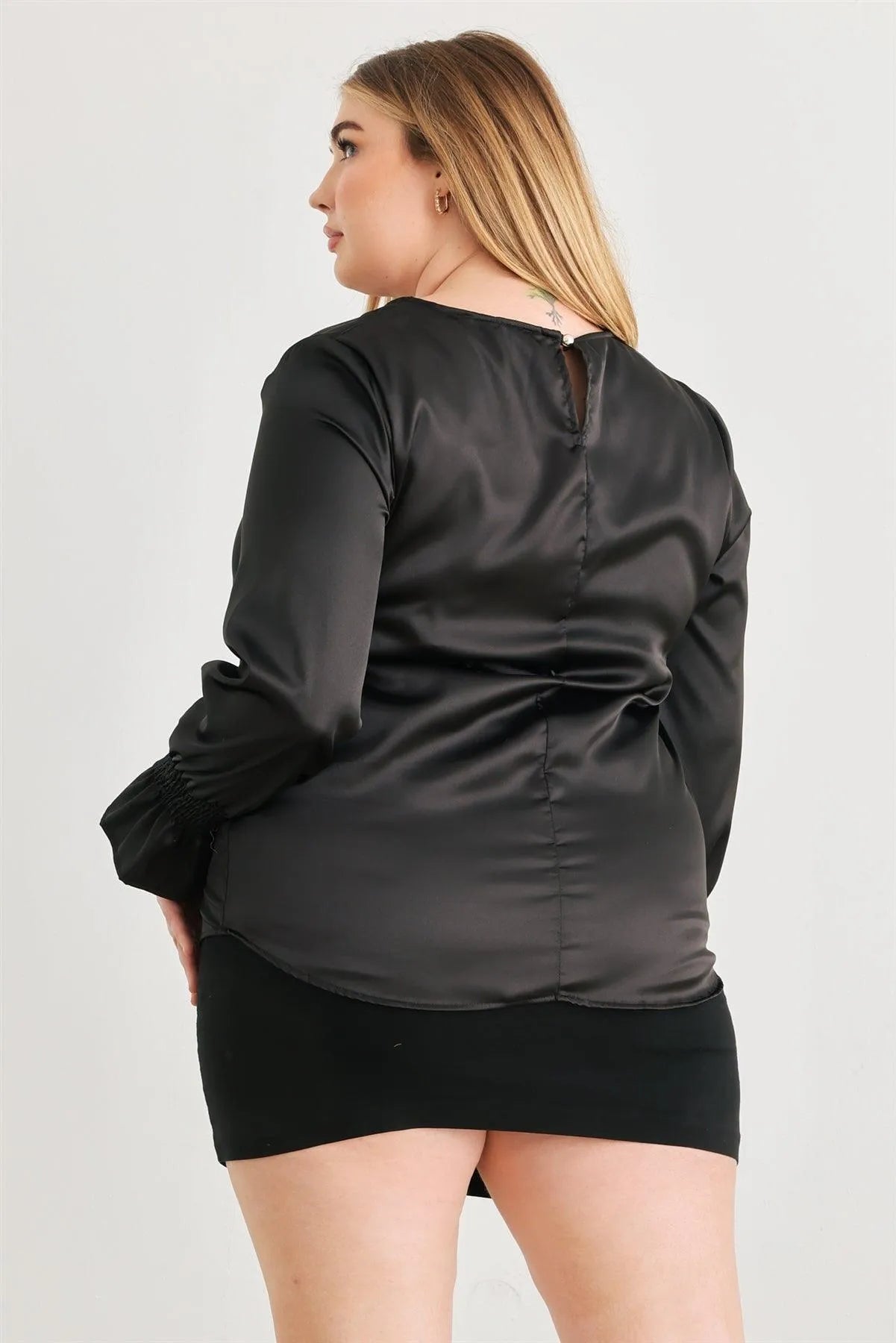 Junior Plus Black Satin Balloon Puff Long Sleeve Top /1-1-1