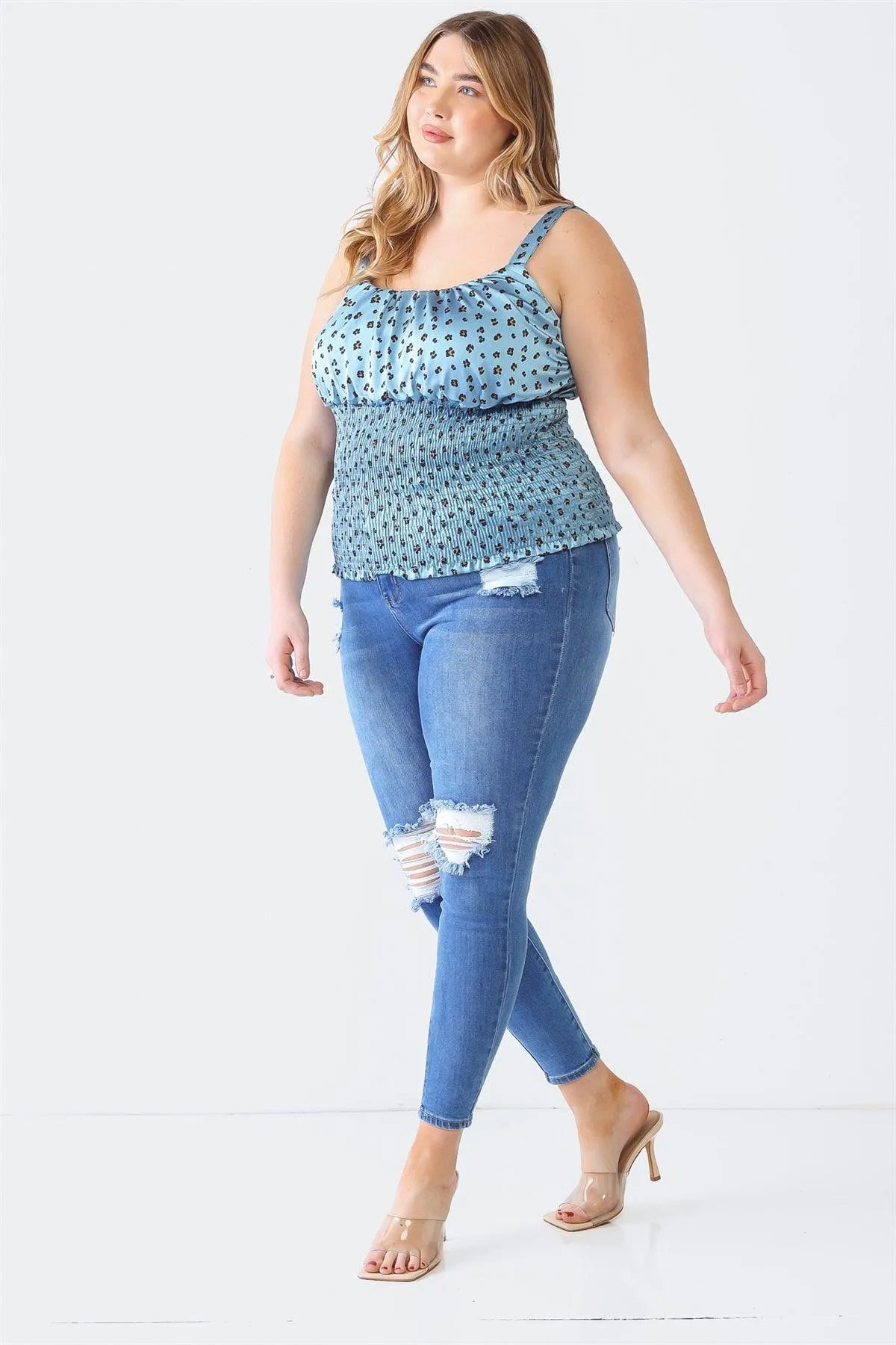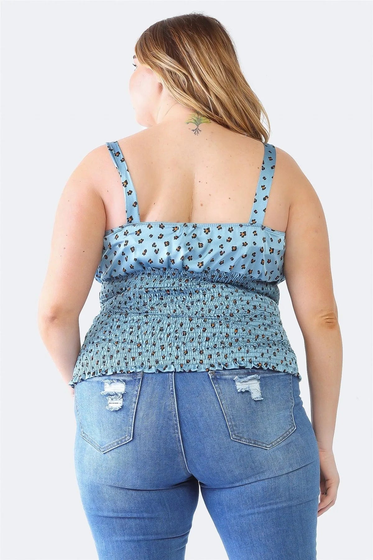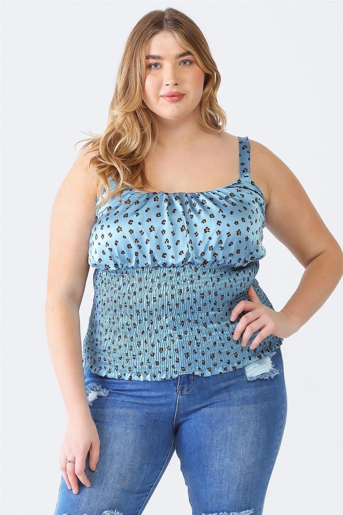 Plus Size Blue Flower Satin Strappy Smocked Top