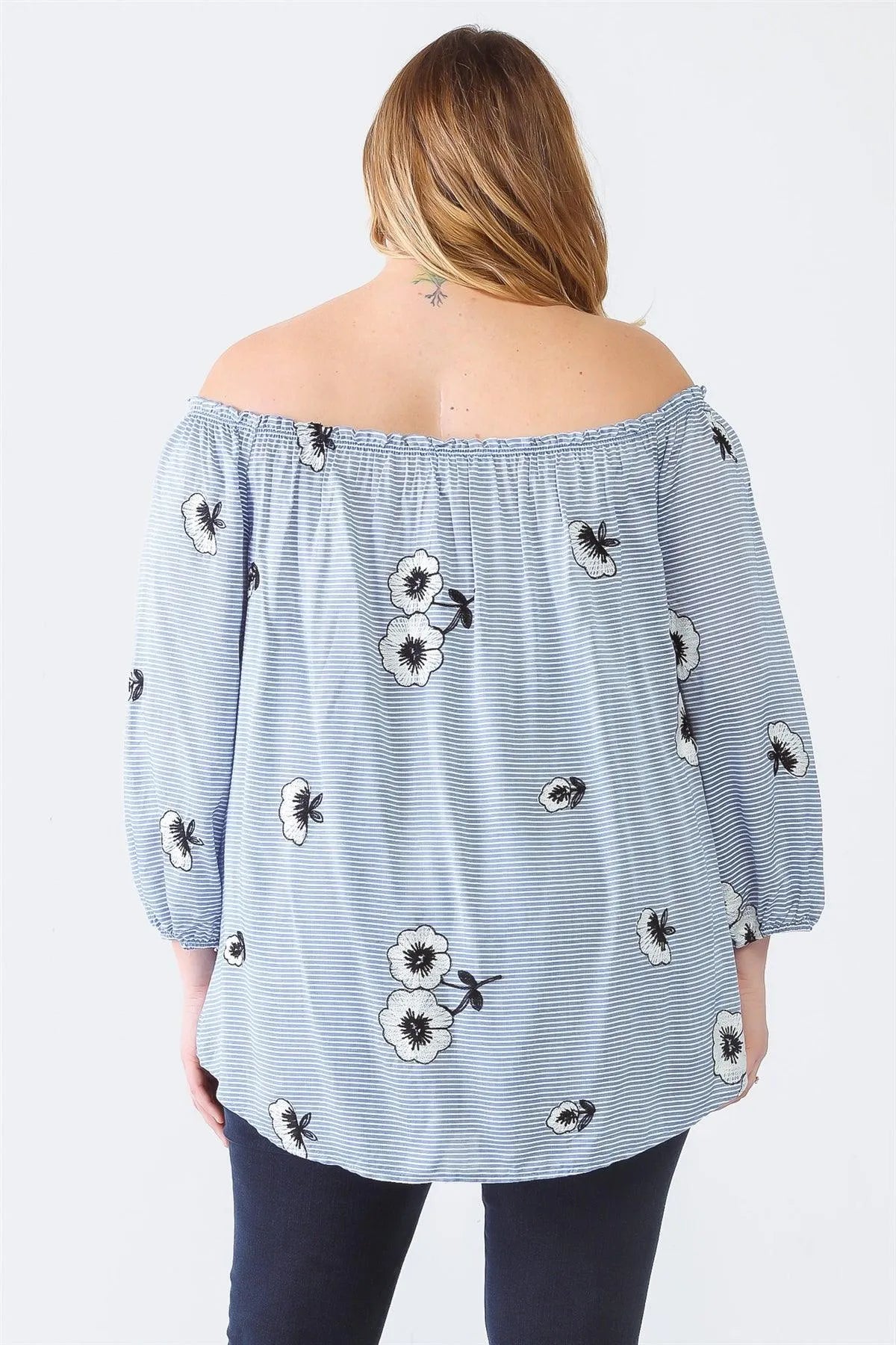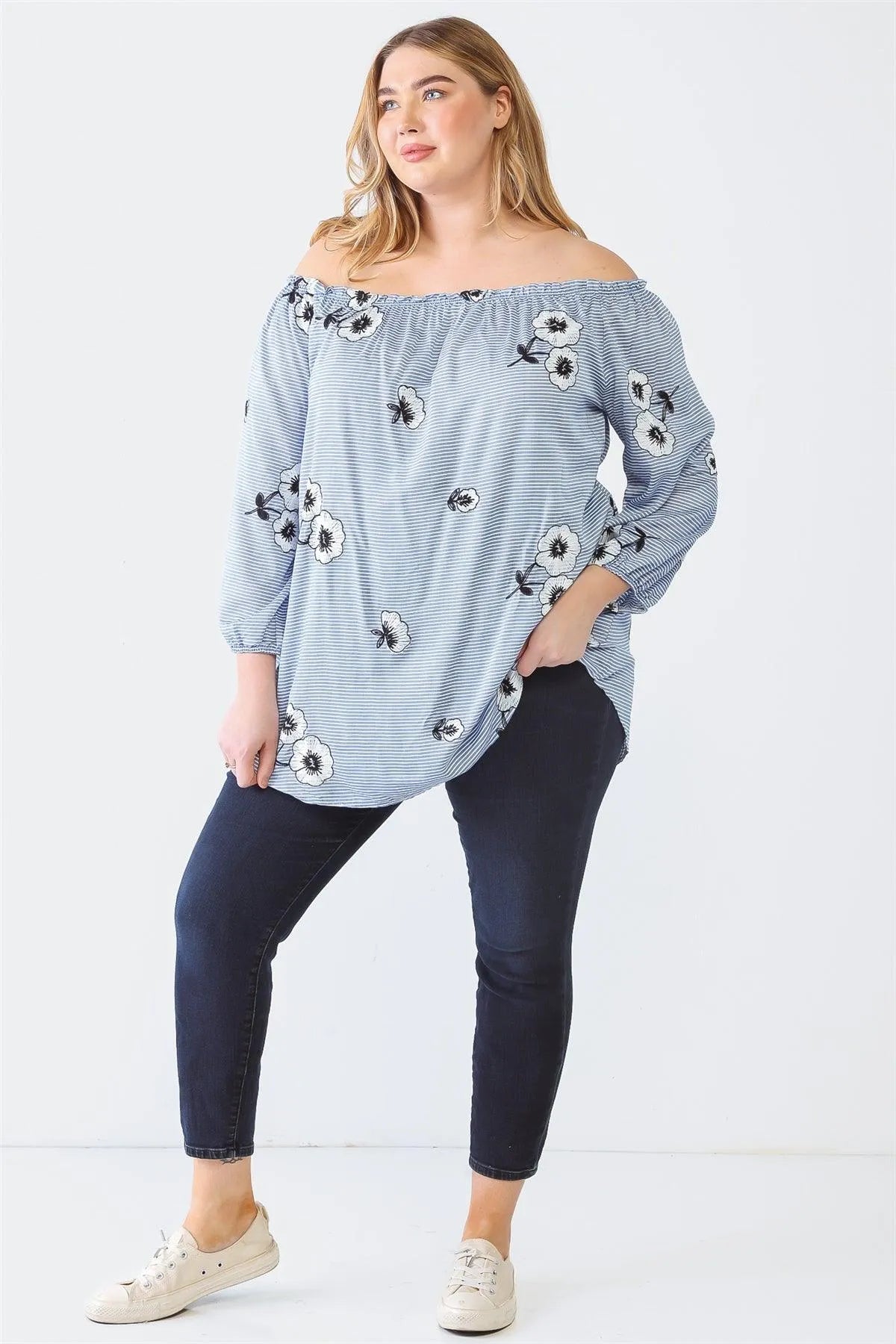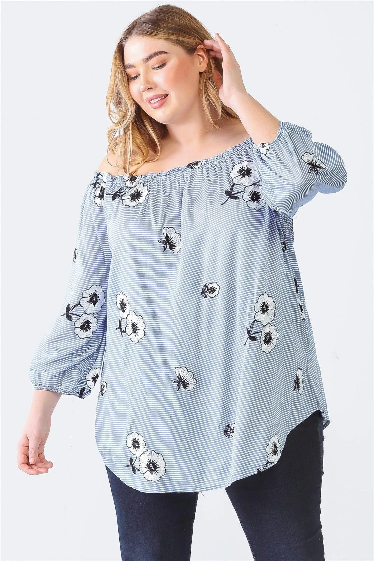 Junior Plus Blue Stripe & Flower Print Off-The-Shoulder Midi Sleeve Top /1-2-1