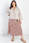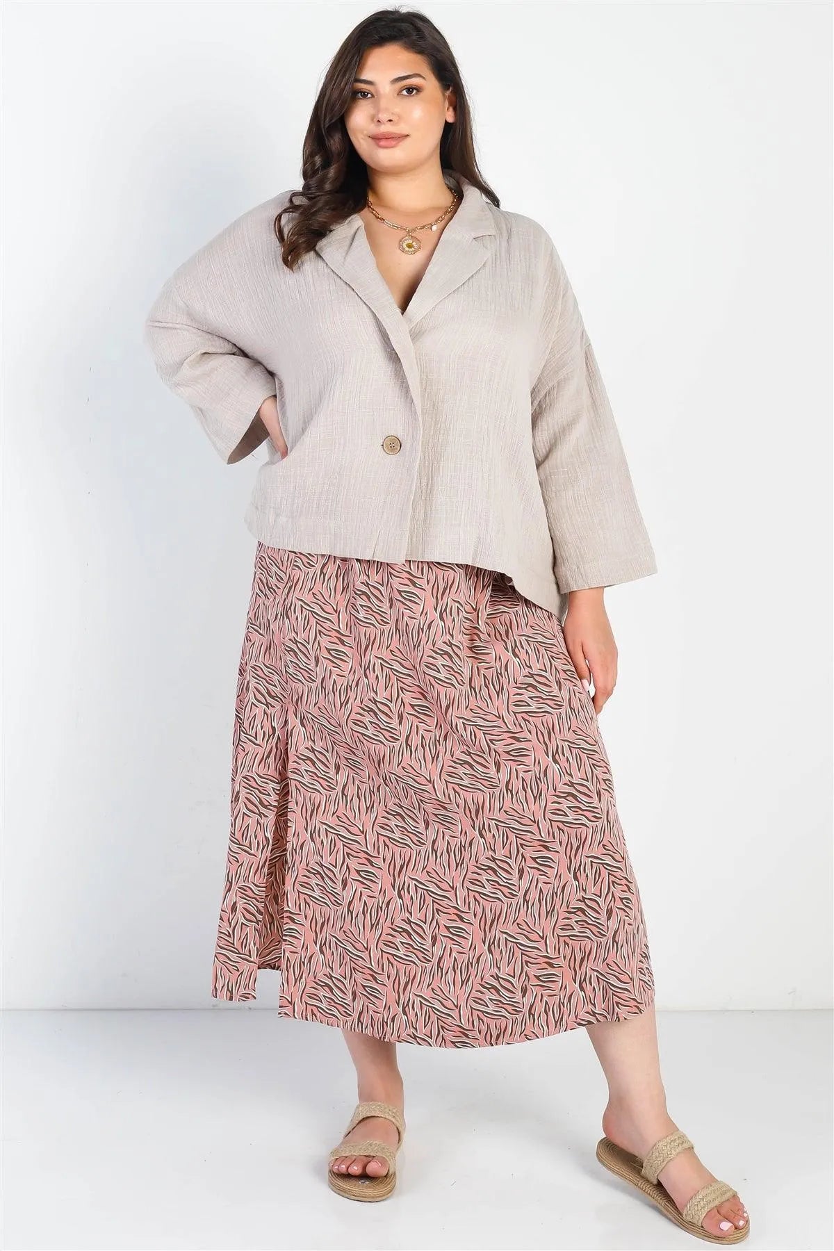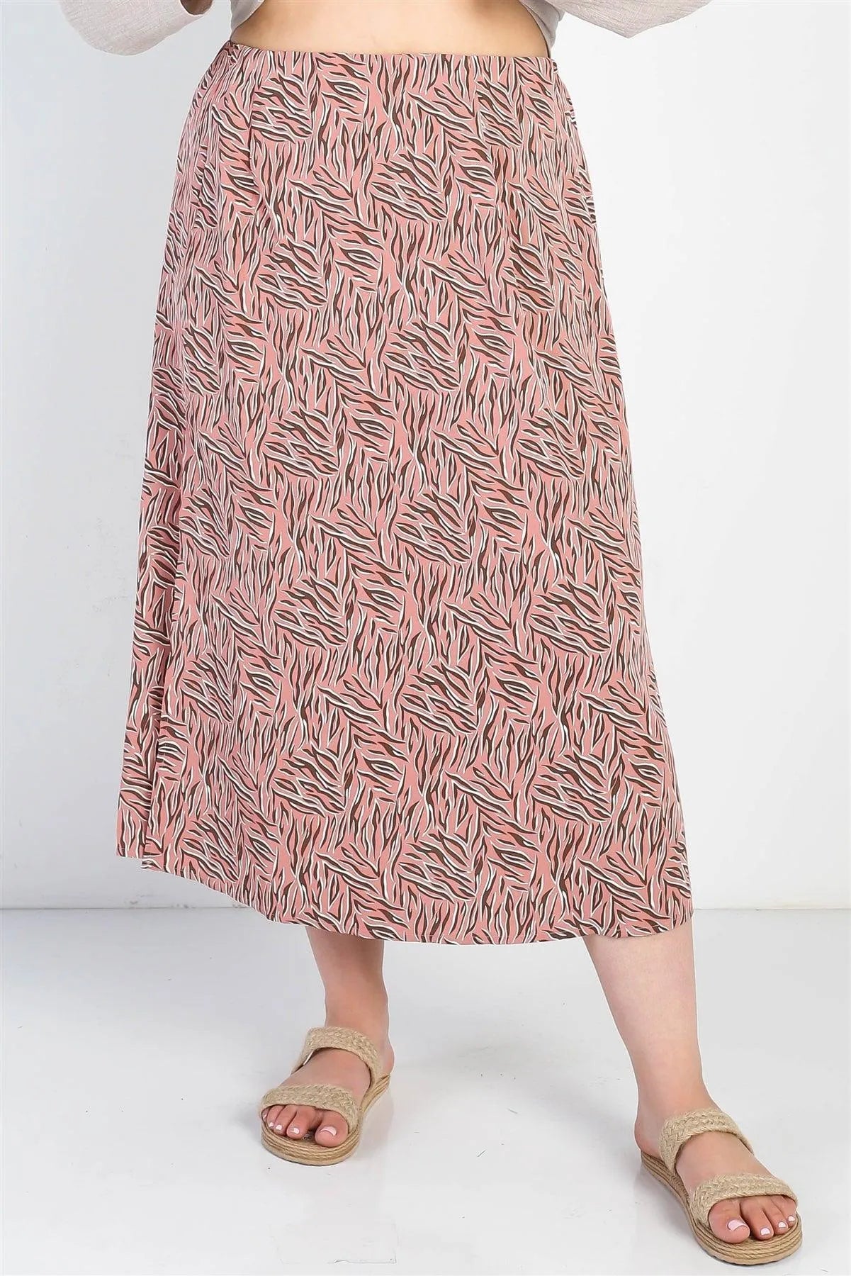Elevate your style with our Plus Size Blush Printed High Waist Midi Skirt. Featuring a beautiful print and a flattering high waist, this midi skirt is designed to enhance your curves and make a statement. Perfect for any occasion, this skirt is a must-have for your wardrobe.