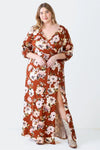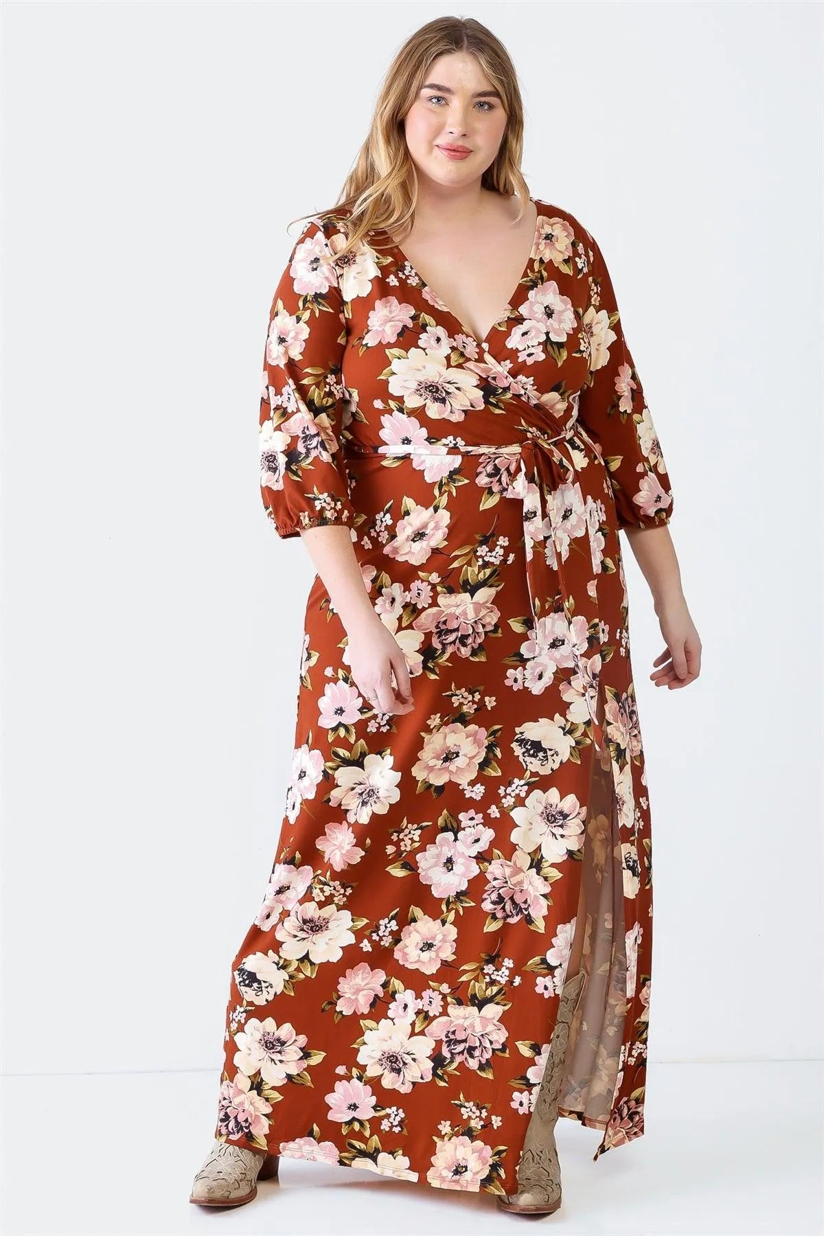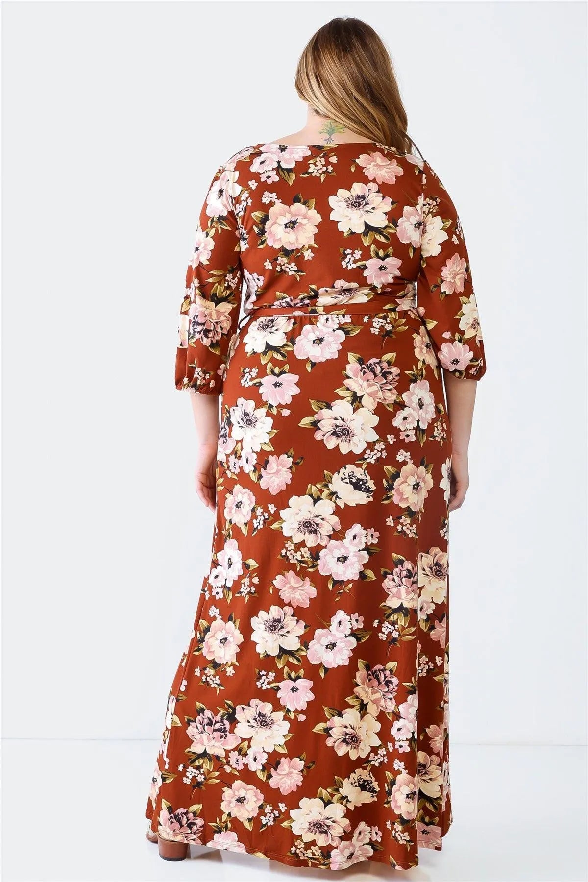 Junior Plus Brown Floral Print Wrap Neck Long Sleeve Belted Maxi Dress /2-2-2