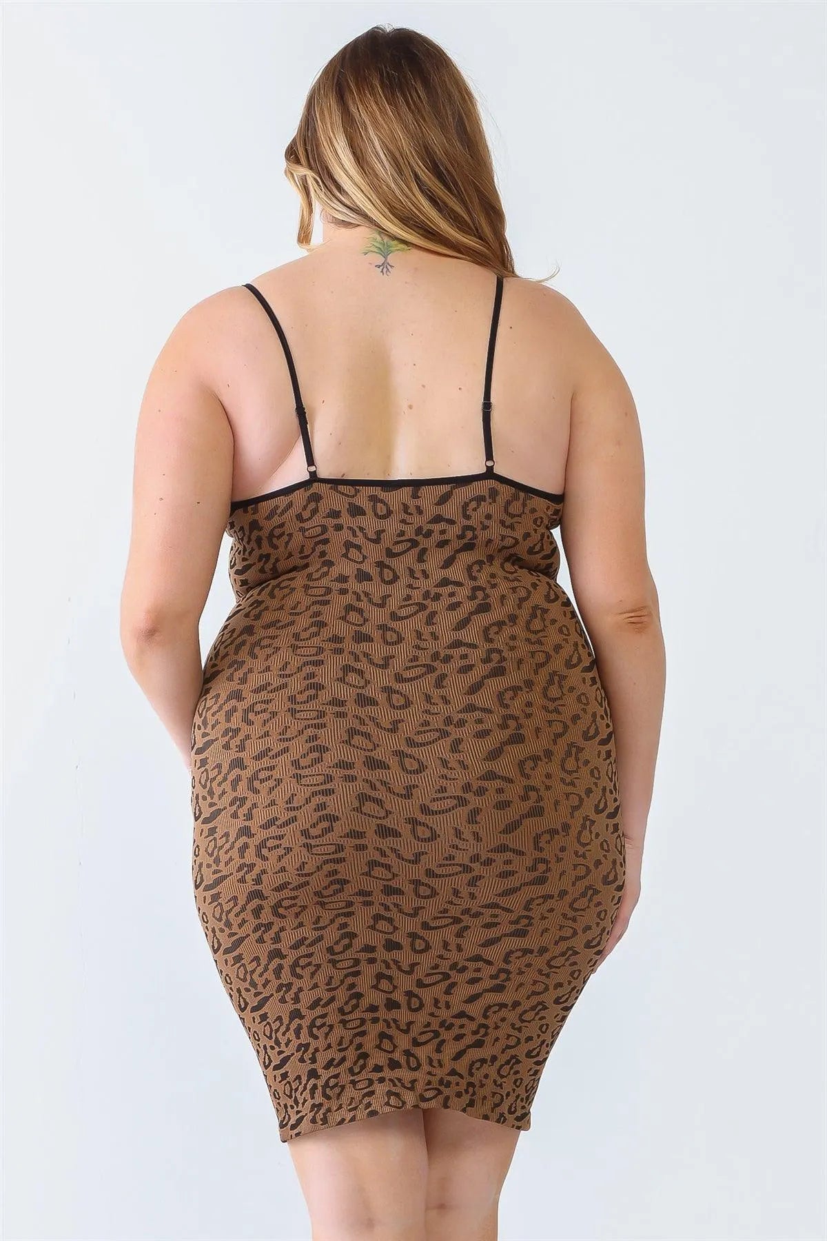 Junior Plus Brown Leopard Print Ribbed Sleeveless Strappy Tight Mini Dress /2-2