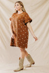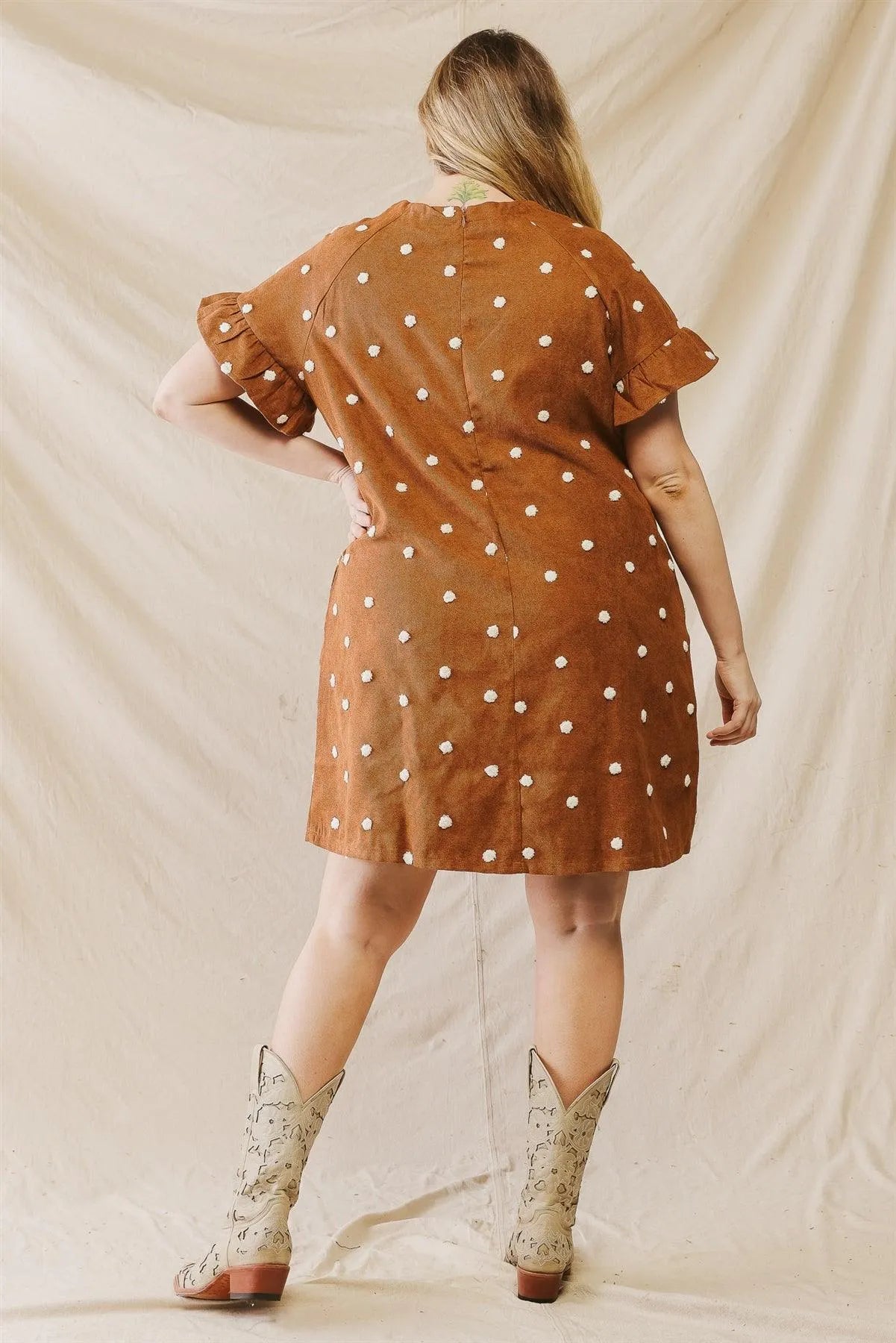Junior Plus Camel Polka Dot Short Ruffle Sleeve Two Pocket Mini Dress /2-2-1