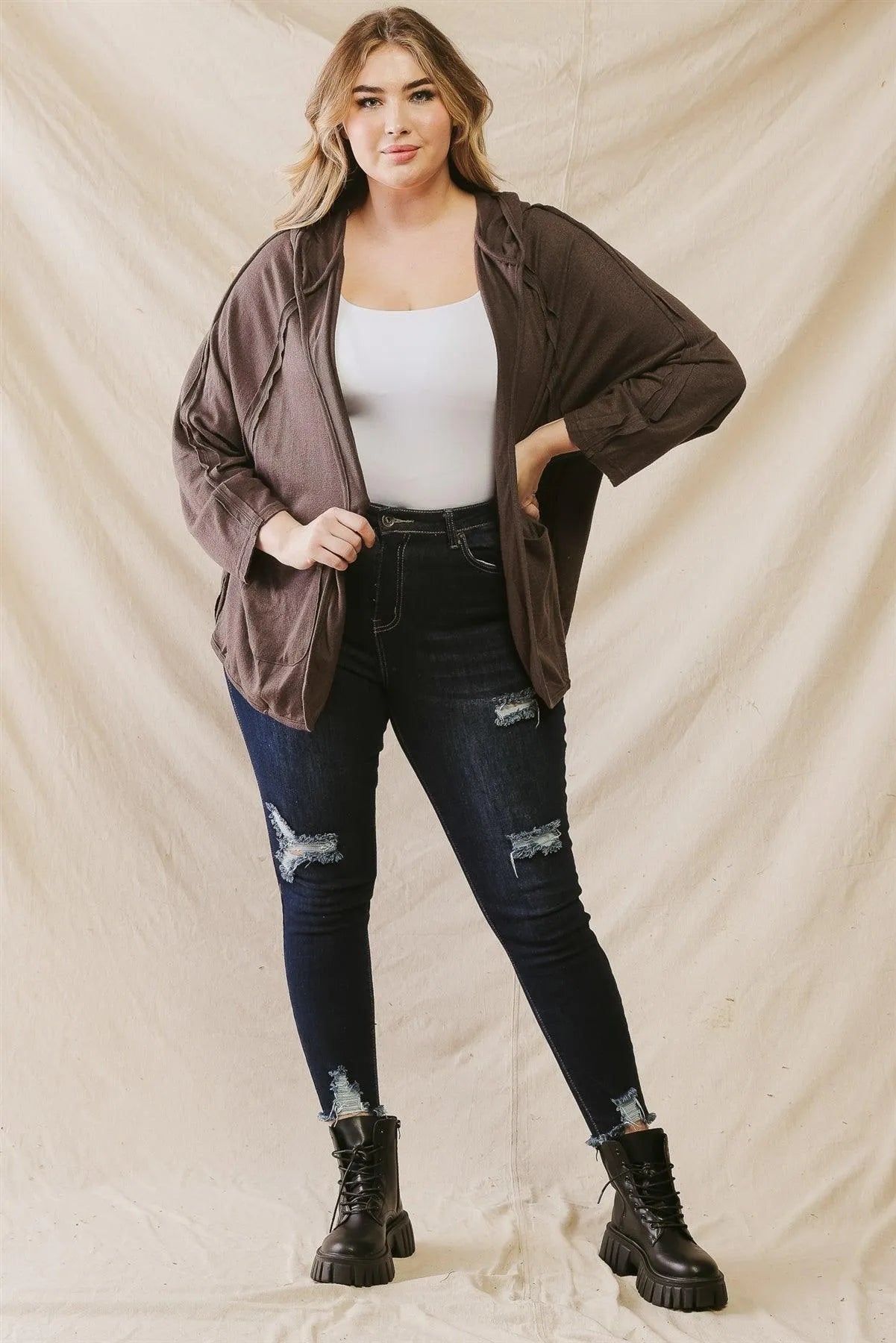 Junior Plus Charcoal Inside-Out Detail Two Pocket Hooded Open Front Cardigan /2-1-1