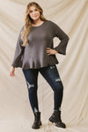 Junior Plus Charcoal Waffle Knit Flare Hem Long Sleeve Top /3-2-1