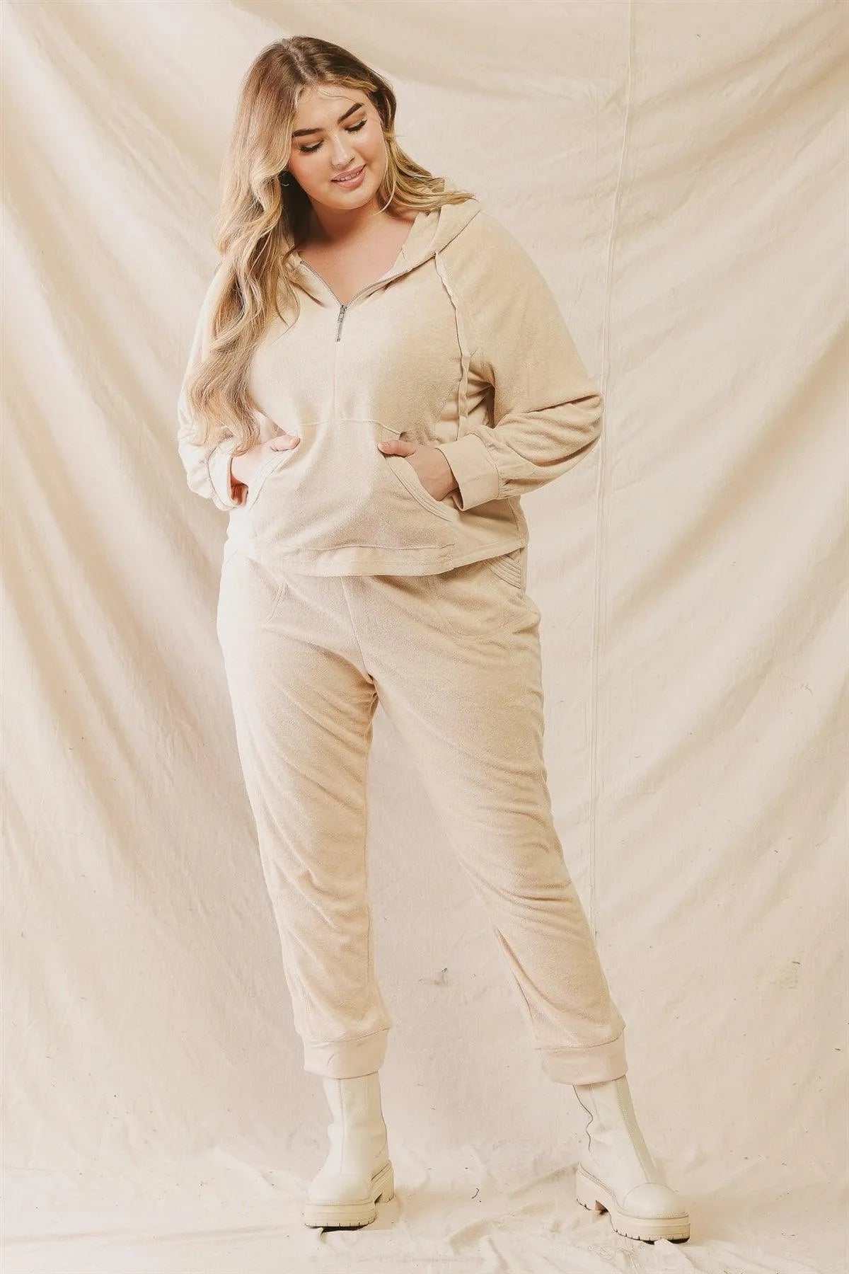 Stay cozy and effortlessly chic with our plus size wholesale women's half zip hoodie. This ultra-soft beige sweatshirt features a relaxed fit design with a convenient half-zip closure and kangaroo pocket, making it the perfect comfortable loungewear piece your customers will live in. Perfect for boutique owners seeking that trendy athleisure appeal that drives consistent sales.