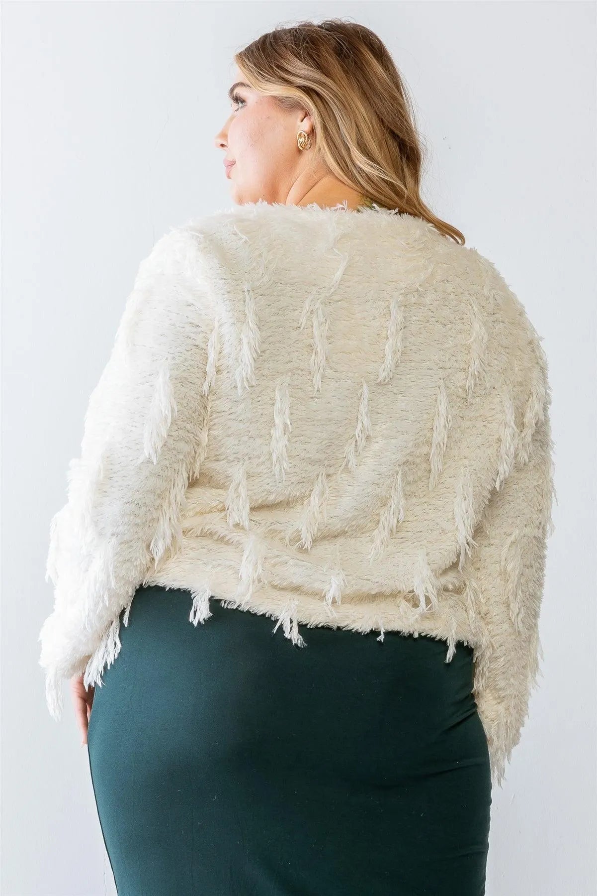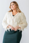 🖤 Add a playful touch to your wardrobe with our Plus Size Feathered Fringe V-Neck Cardigan Sweater. This cream colored sweater features feathered fringe, hook fasteners, and a v-neckline, making it both cute and cozy. Designed for a casual lifestyle, it's a must-have for any fashionista. Soft to the touch, it will keep you warm and stylish all winter long!