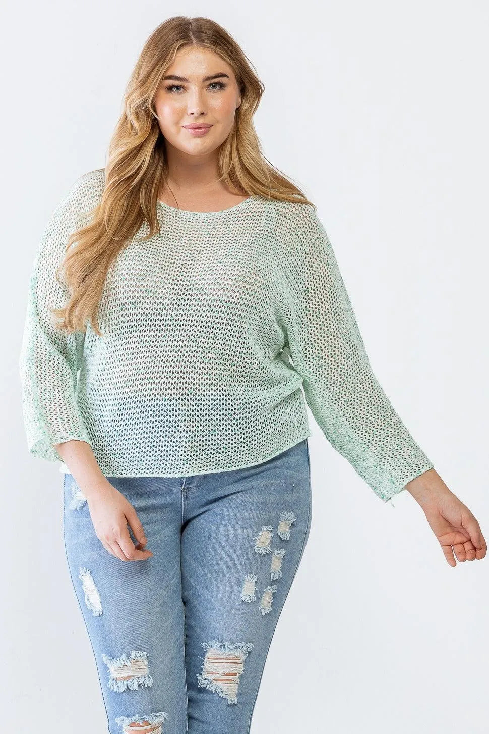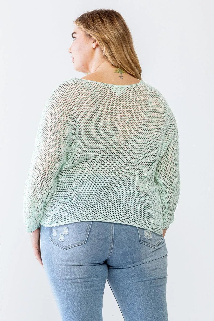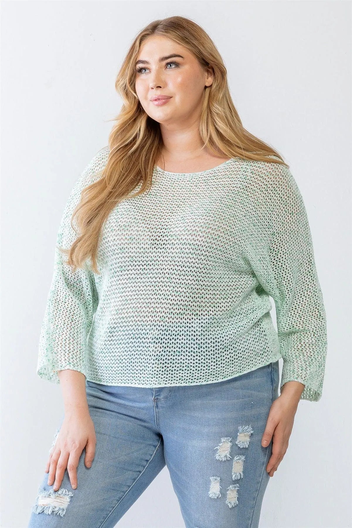 Plus Size Green White Long Sleeve Relax Knit Sweater /3-2