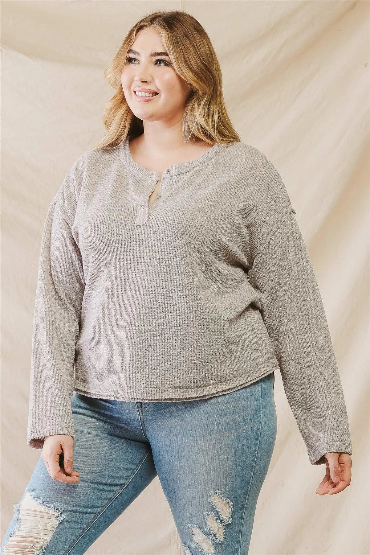 Plus Size Grey Waffle Knit Henley Long Sleeve Casual Boutique Top