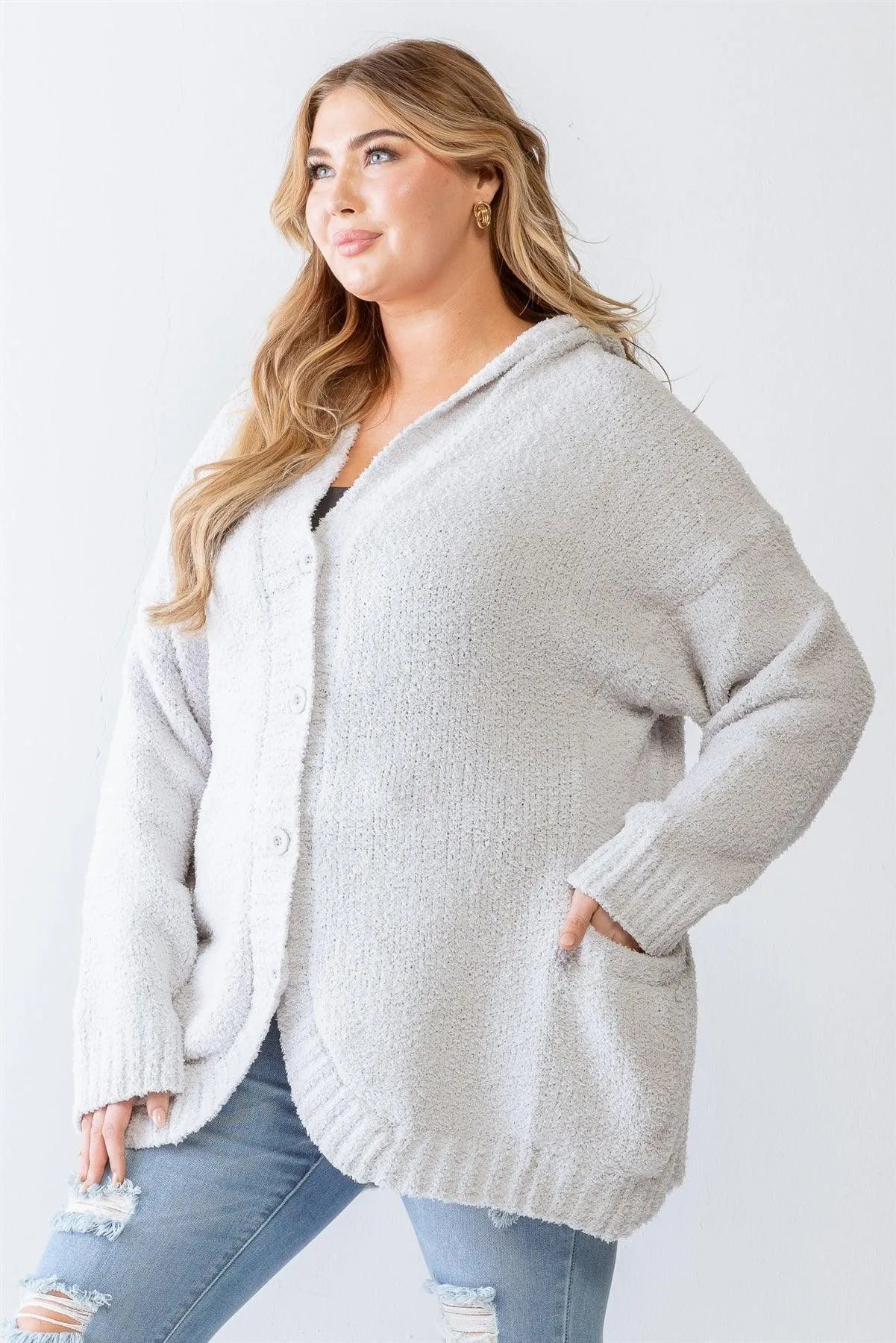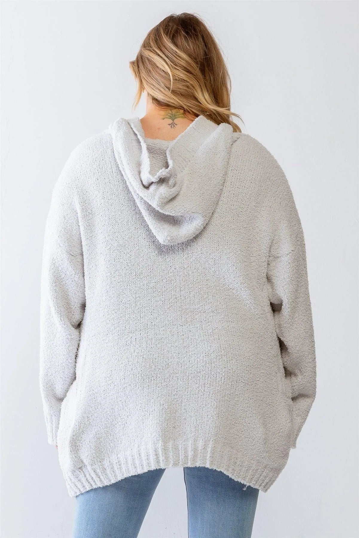 Junior Plus Grey Knit Hooded Soft Sweater Cardigan