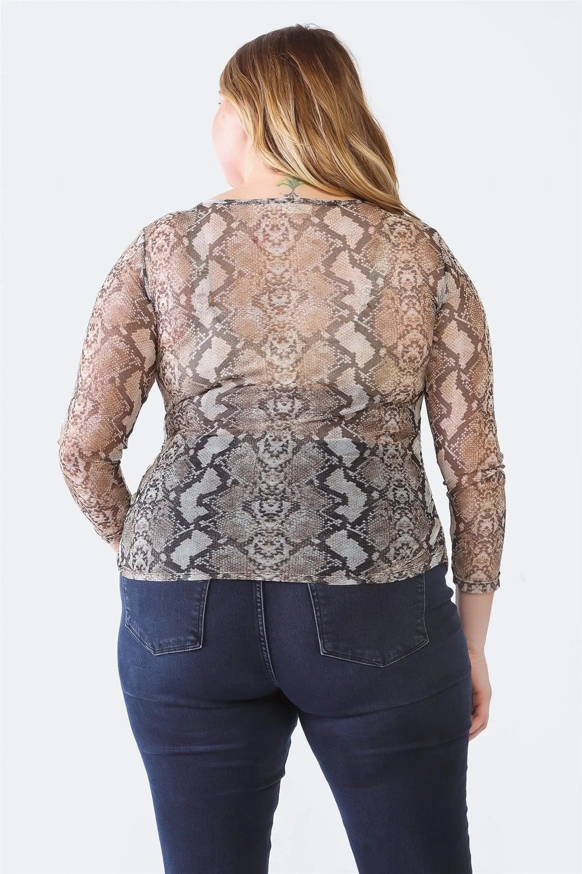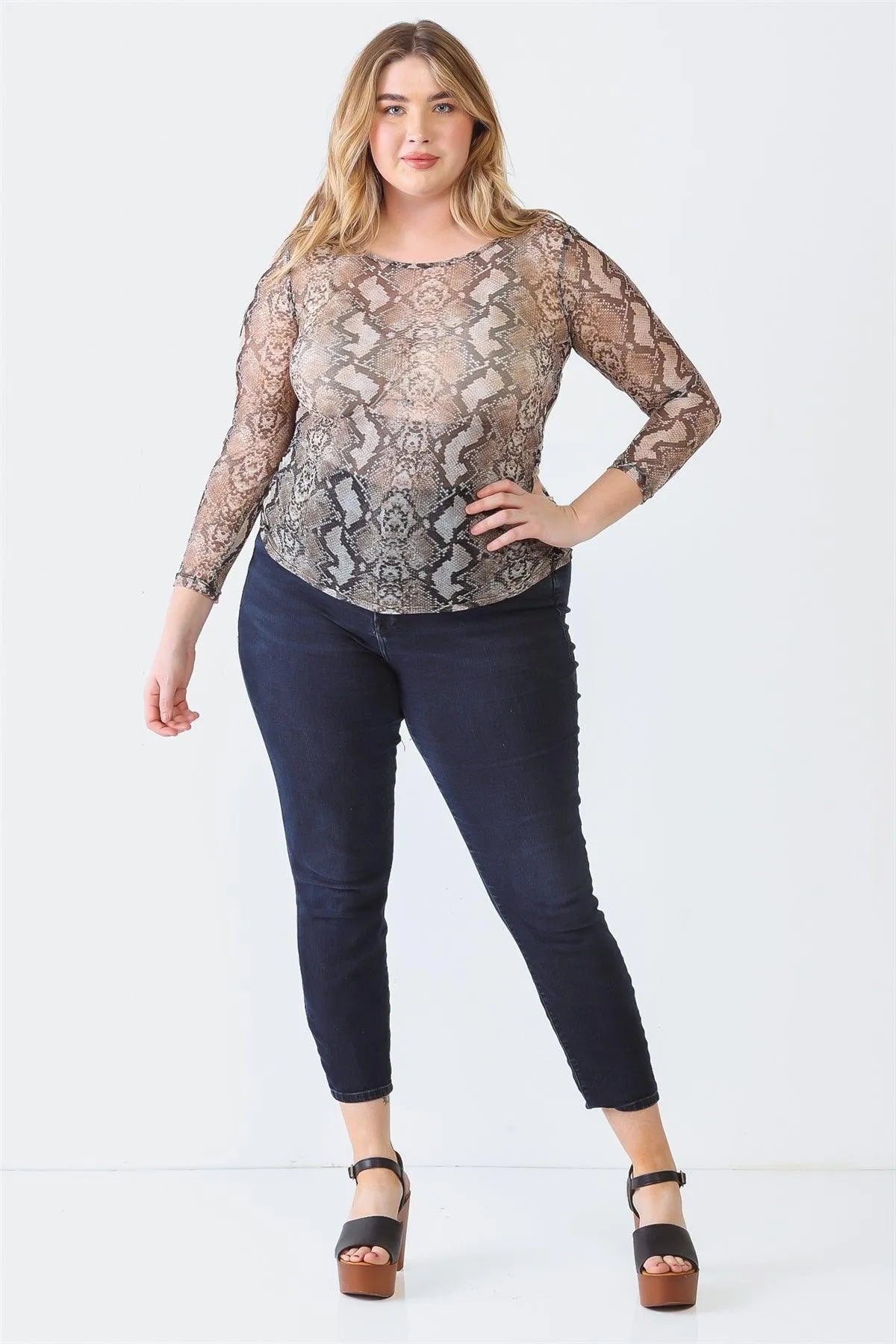 Junior Plus Grey Snake Print Mesh Sheer Crew Neck Long Sleeve Top /1-2-2