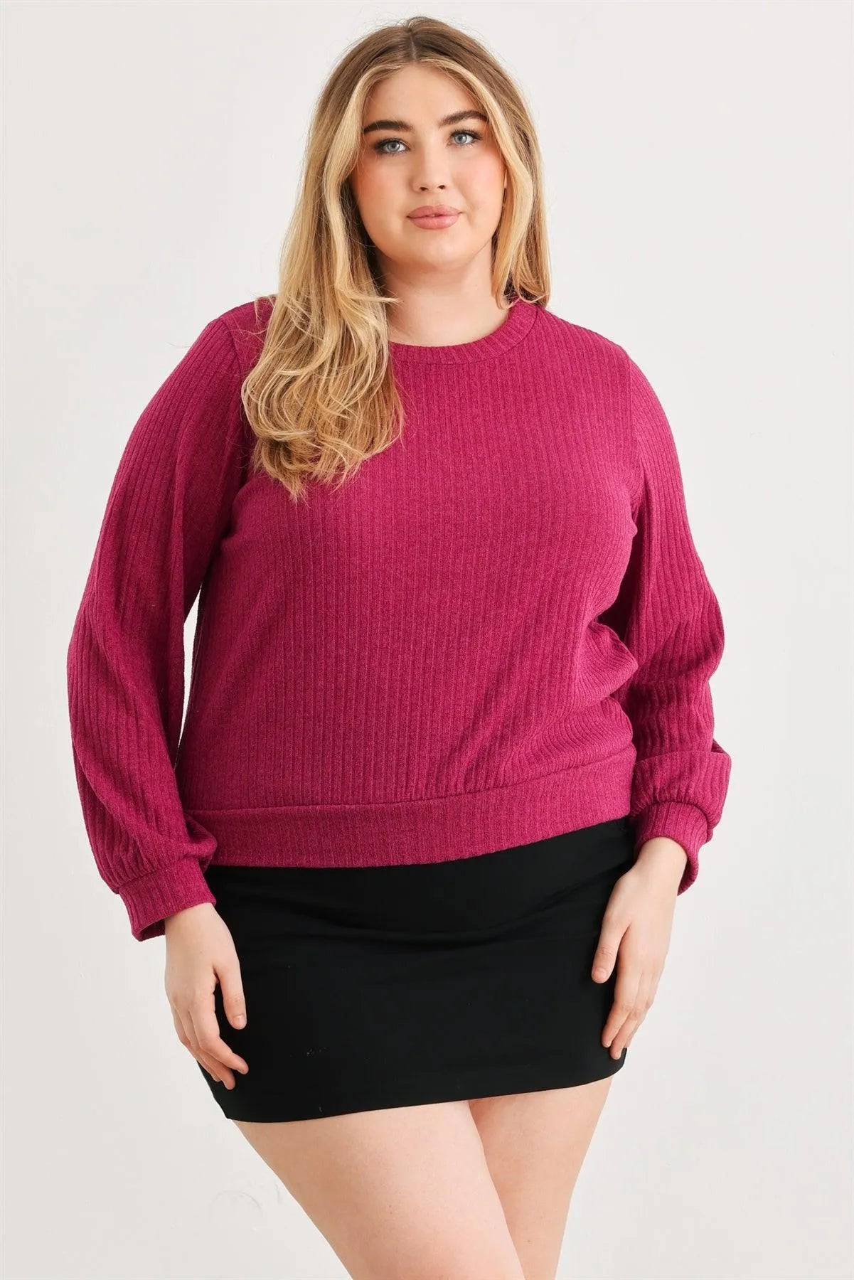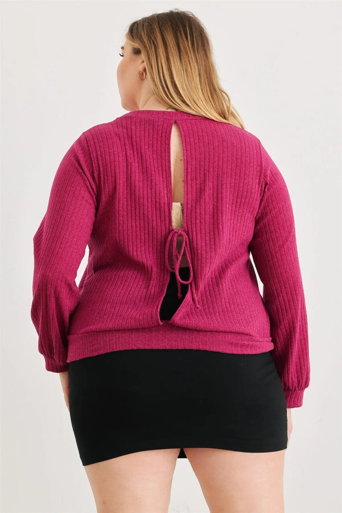 Junior Plus Magenta Ribbed Long Sleeve Open Tie Back Top /3-2-1