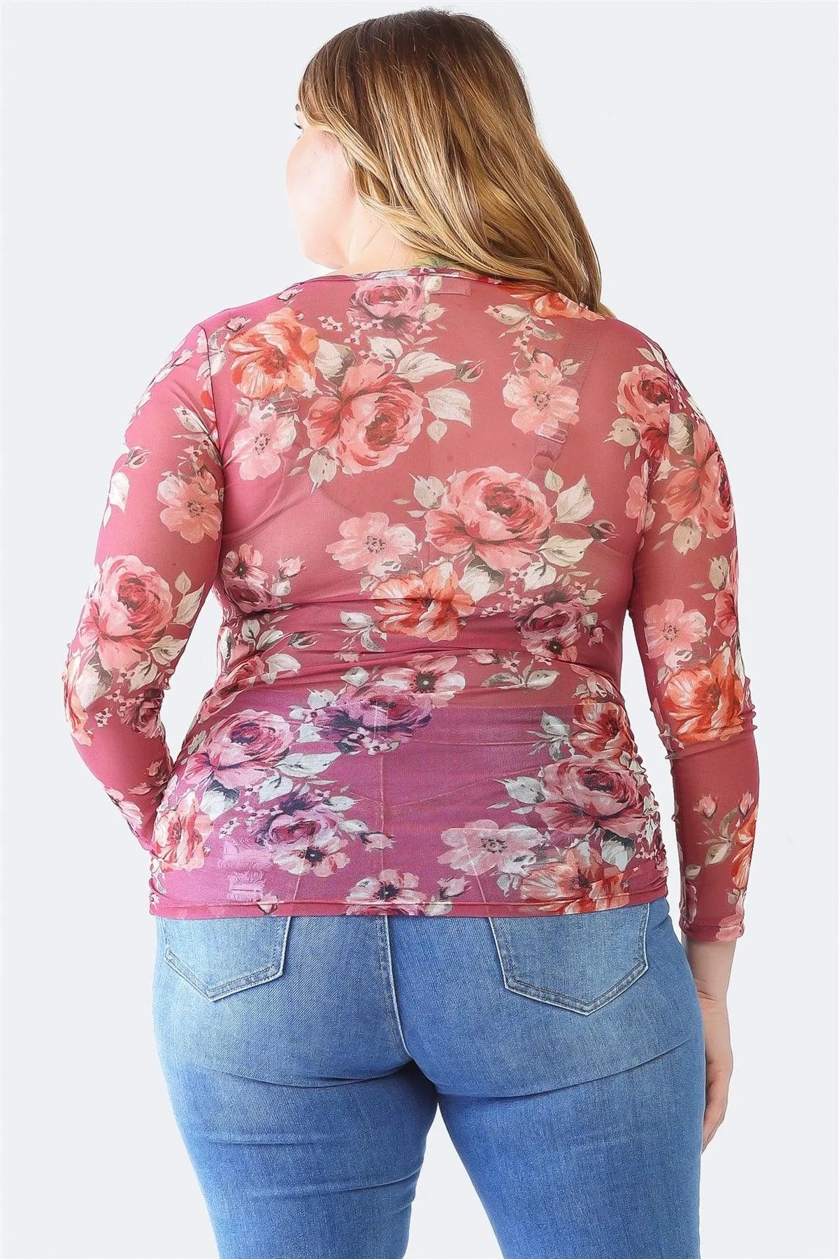 Plus Size Mauve Flower Mesh Sheer Long Sleeve Top