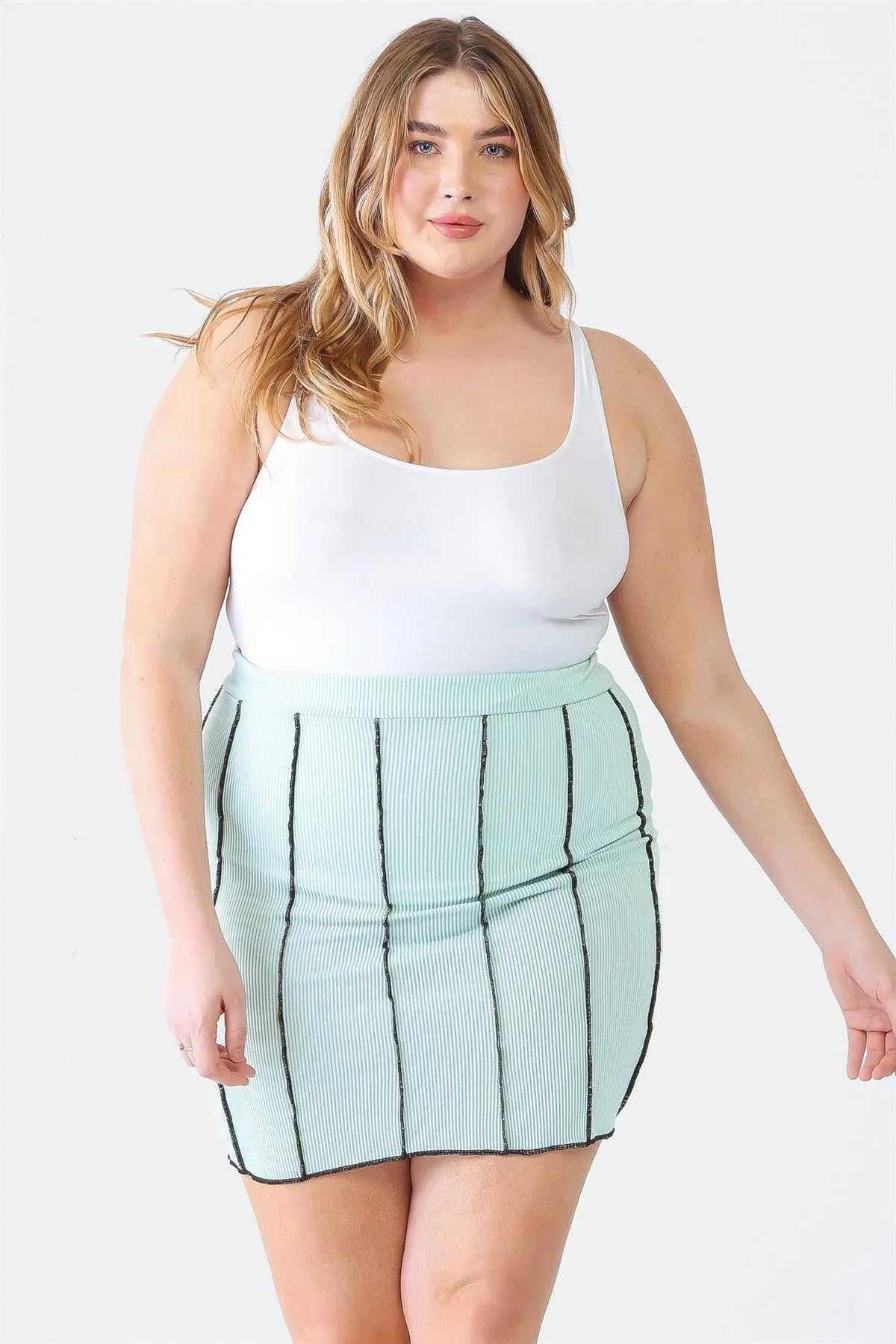 Plus Size Ribbed Contrast Stitch Mini Skirt - Mint Green Bodycon Skirt