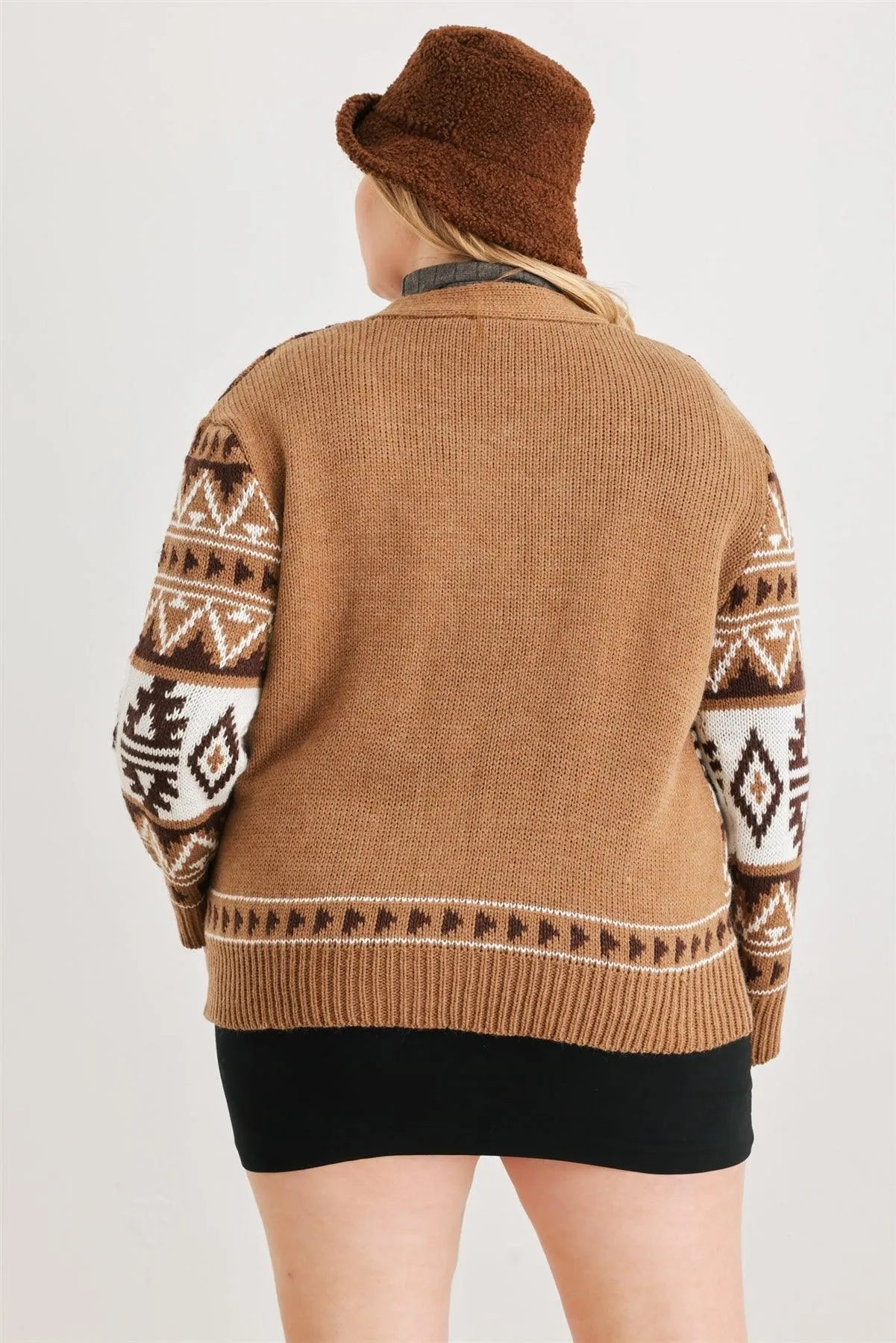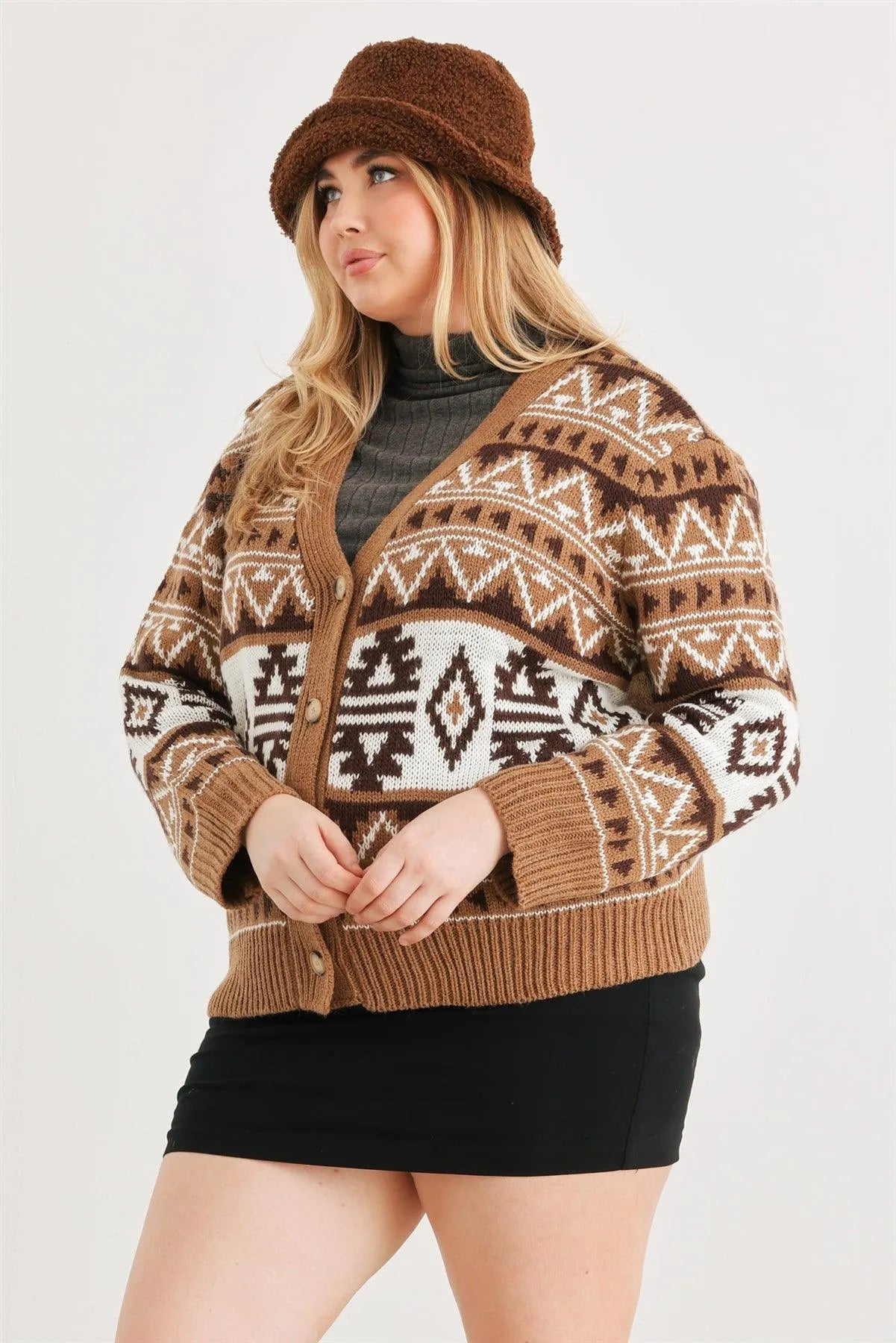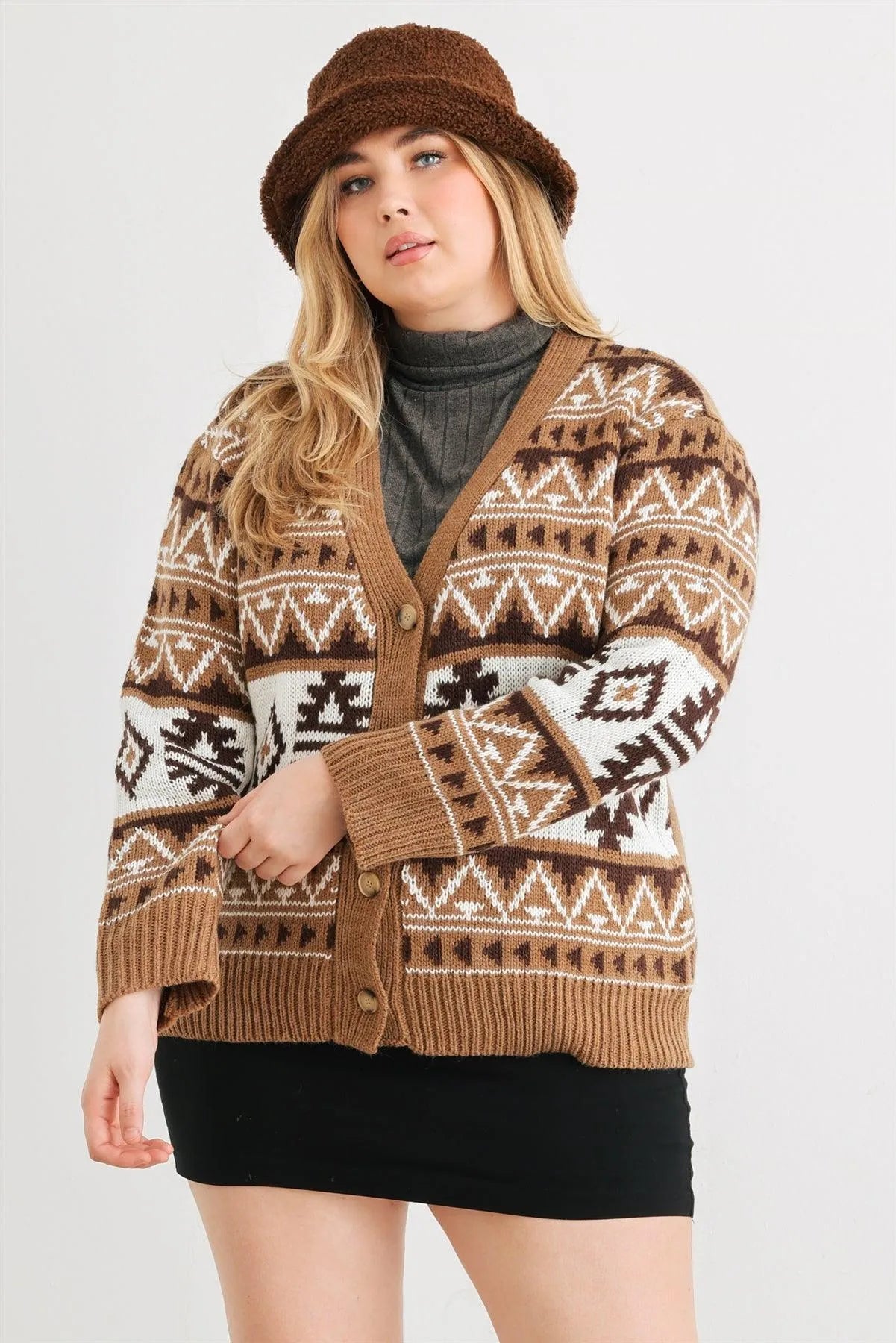 Junior Plus Mocha Fair Isle Knit Button-Up Long Sleeve Cardigan Sweater /3-2-1
