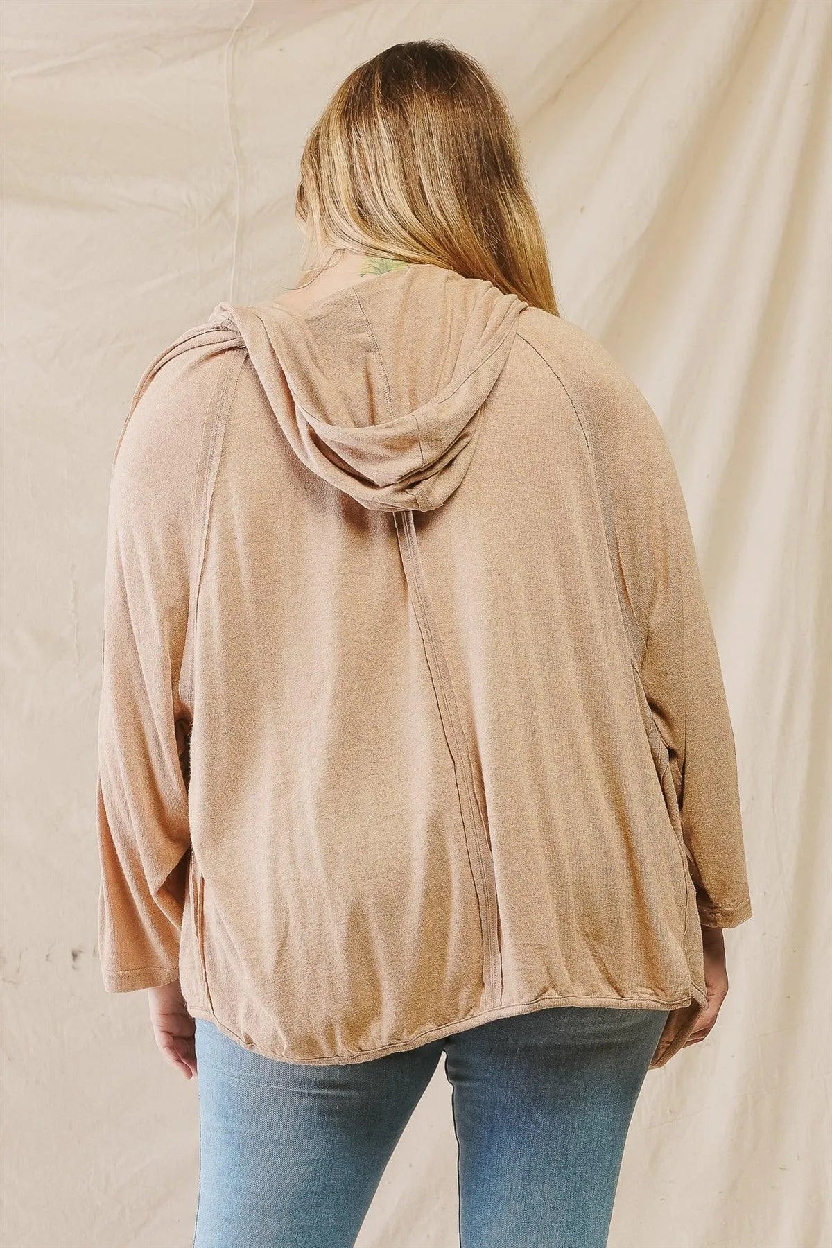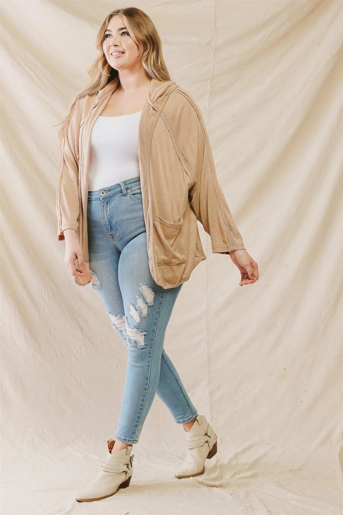 Junior Plus Mocha Inside-Out Detail Two Pocket Hooded Open Front Cardigan /3-2-1