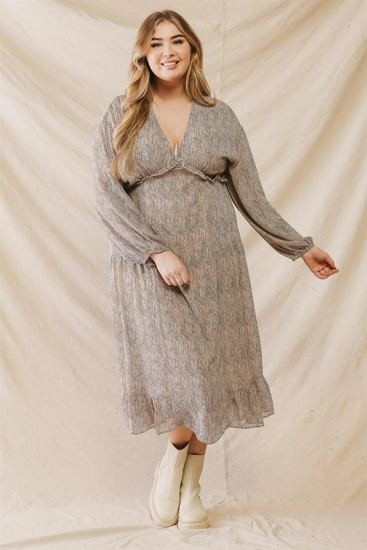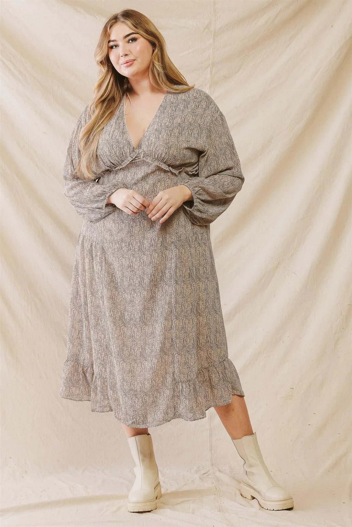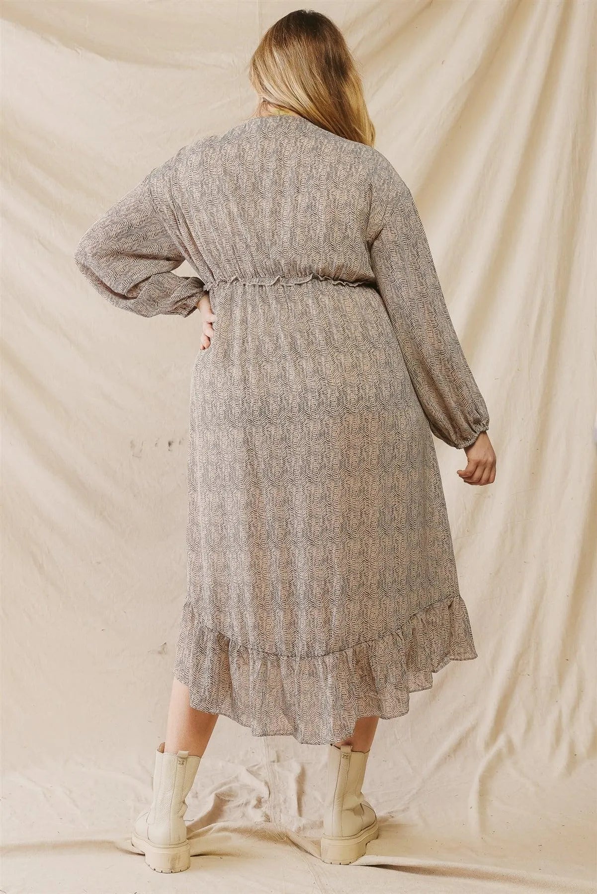 Junior Plus Mocha Printed V-Neck Ruffle Detail Flare Hem Midi Dress /3-2-1