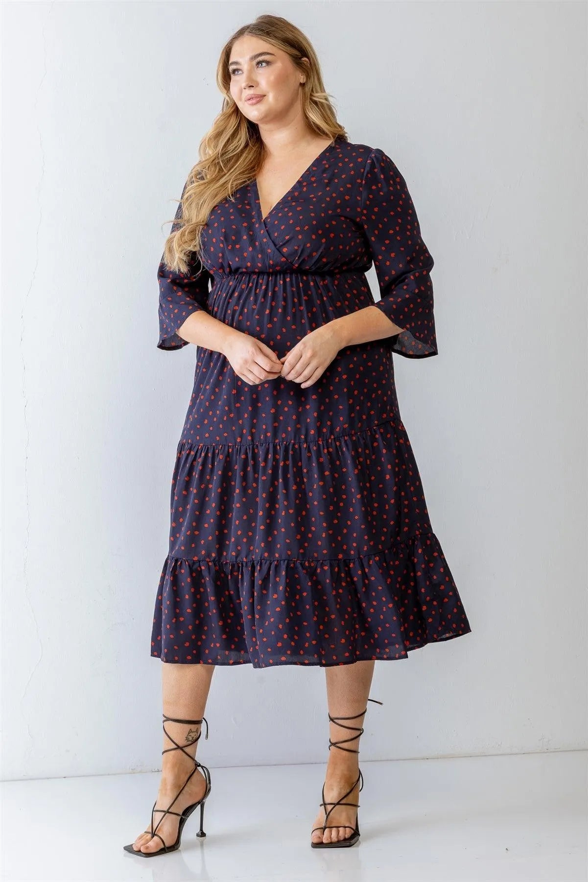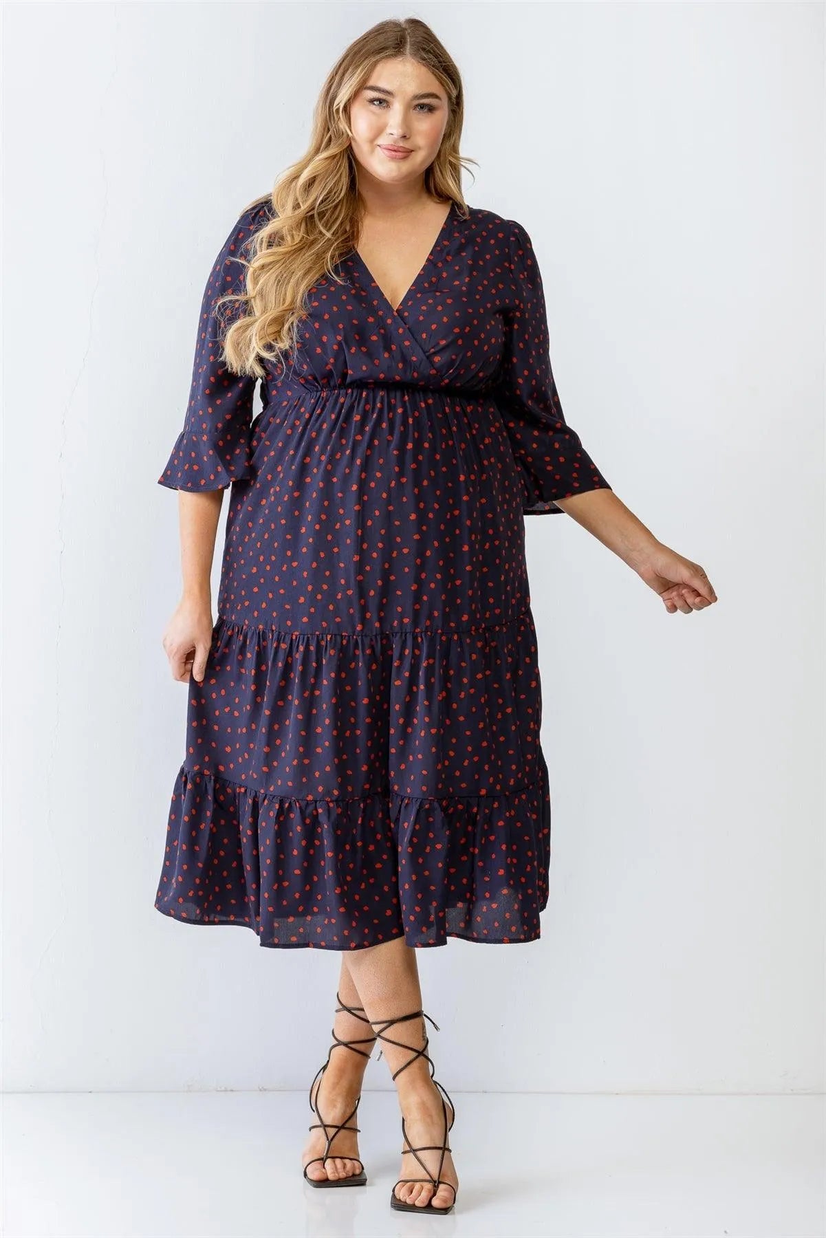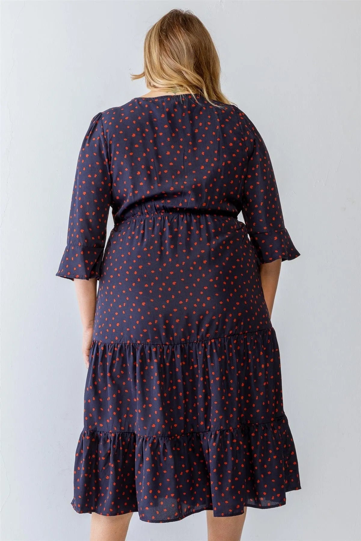 Junior Plus Navy Polka Dot Print Wrap V-Neck Midi Dress /3-2-1