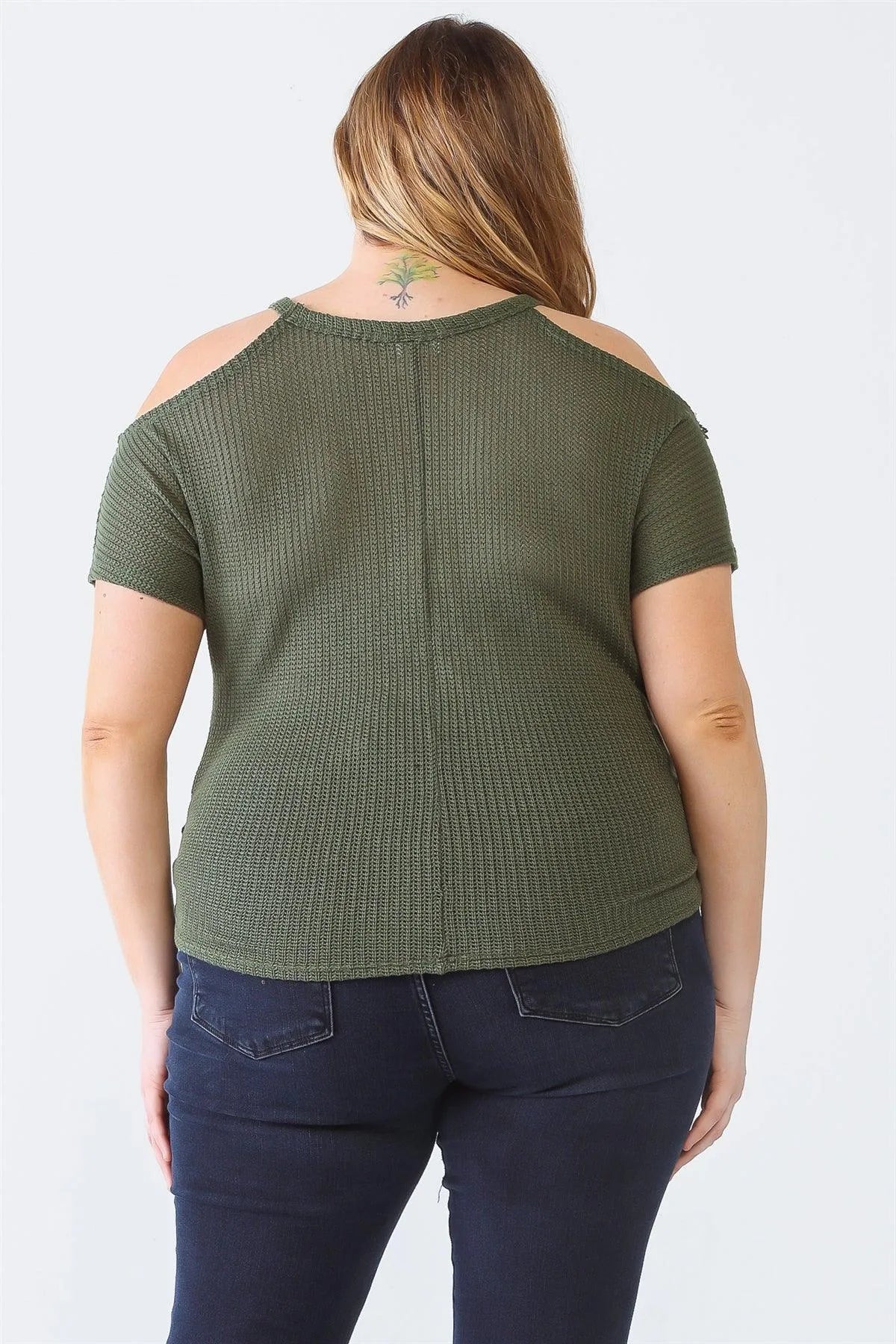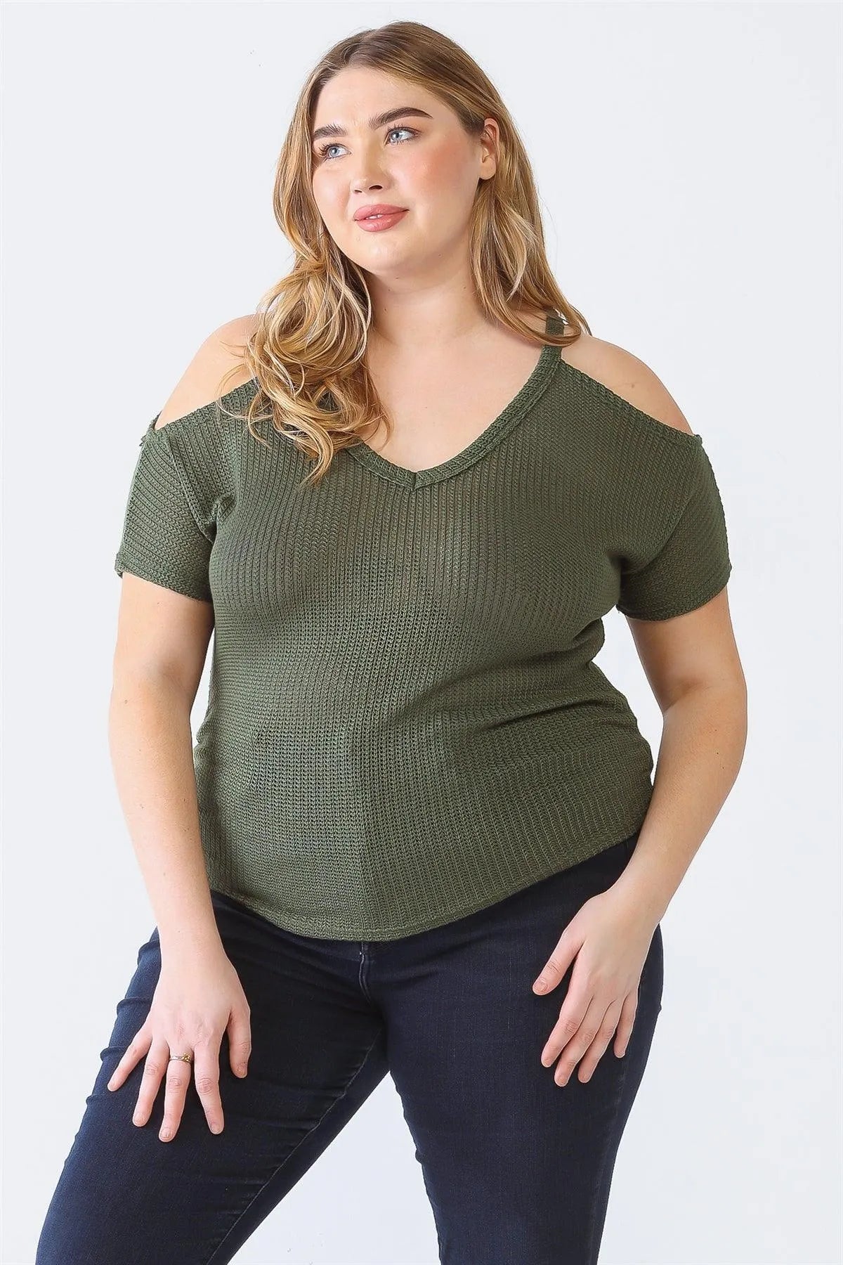 Junior Plus Olive Knit Off-The-Shoulder Short Sleeve Top /1-1-1