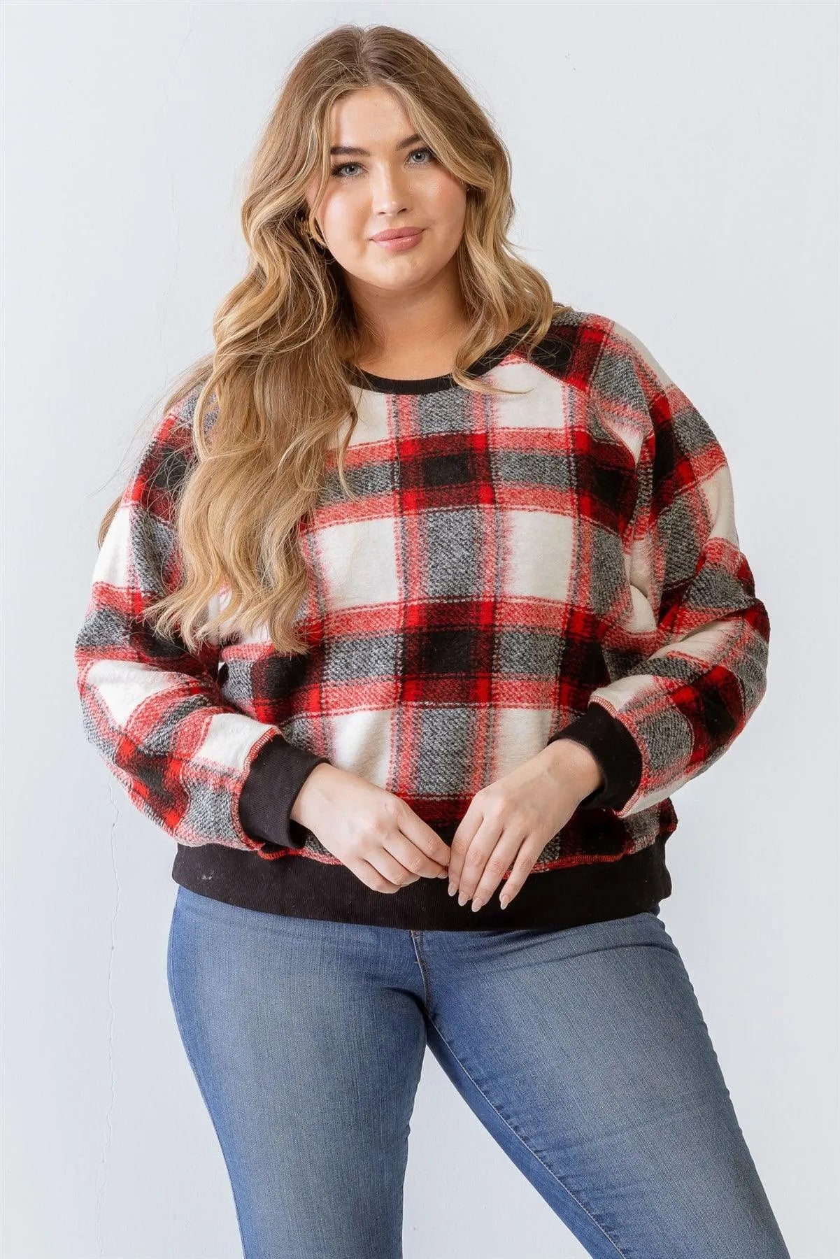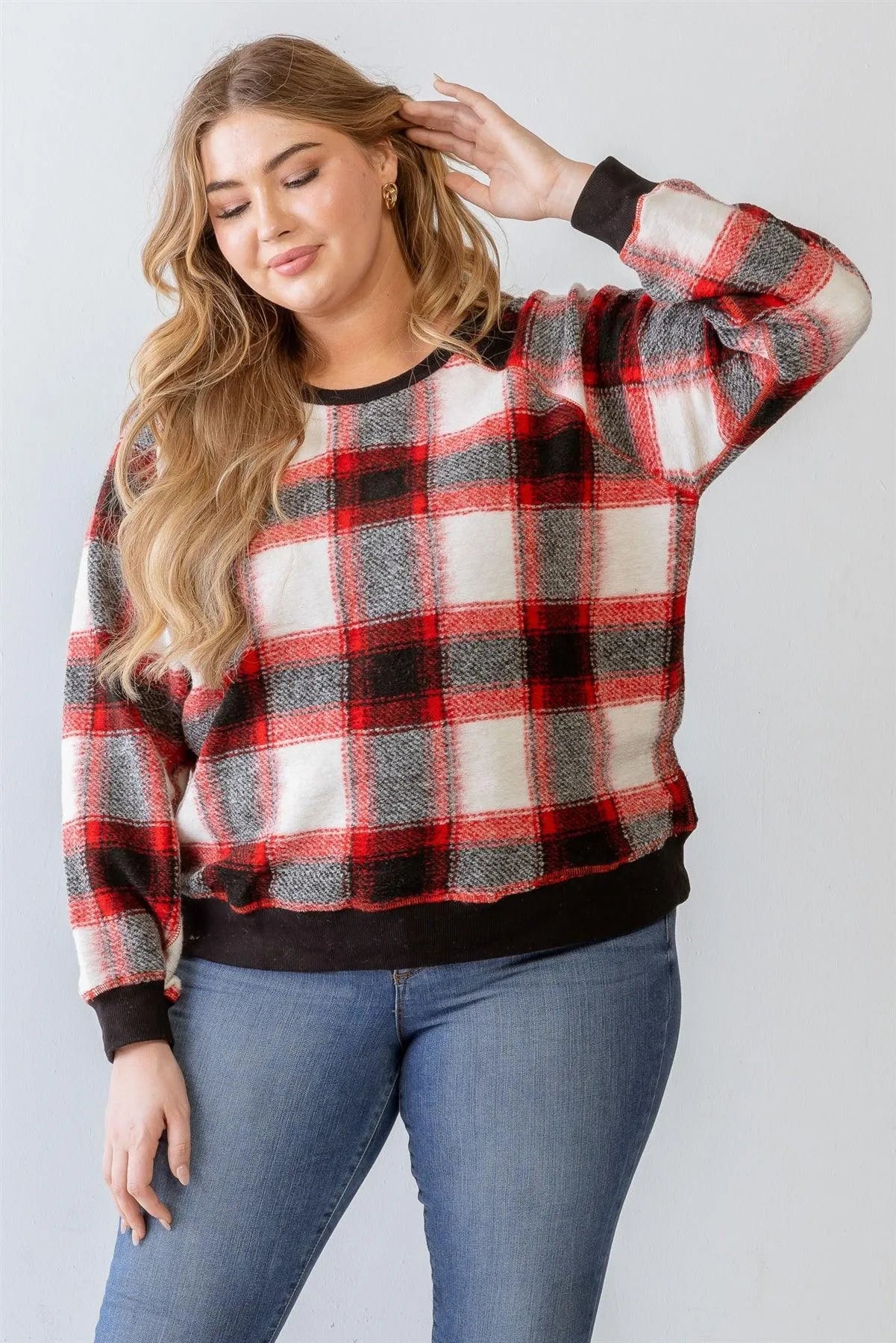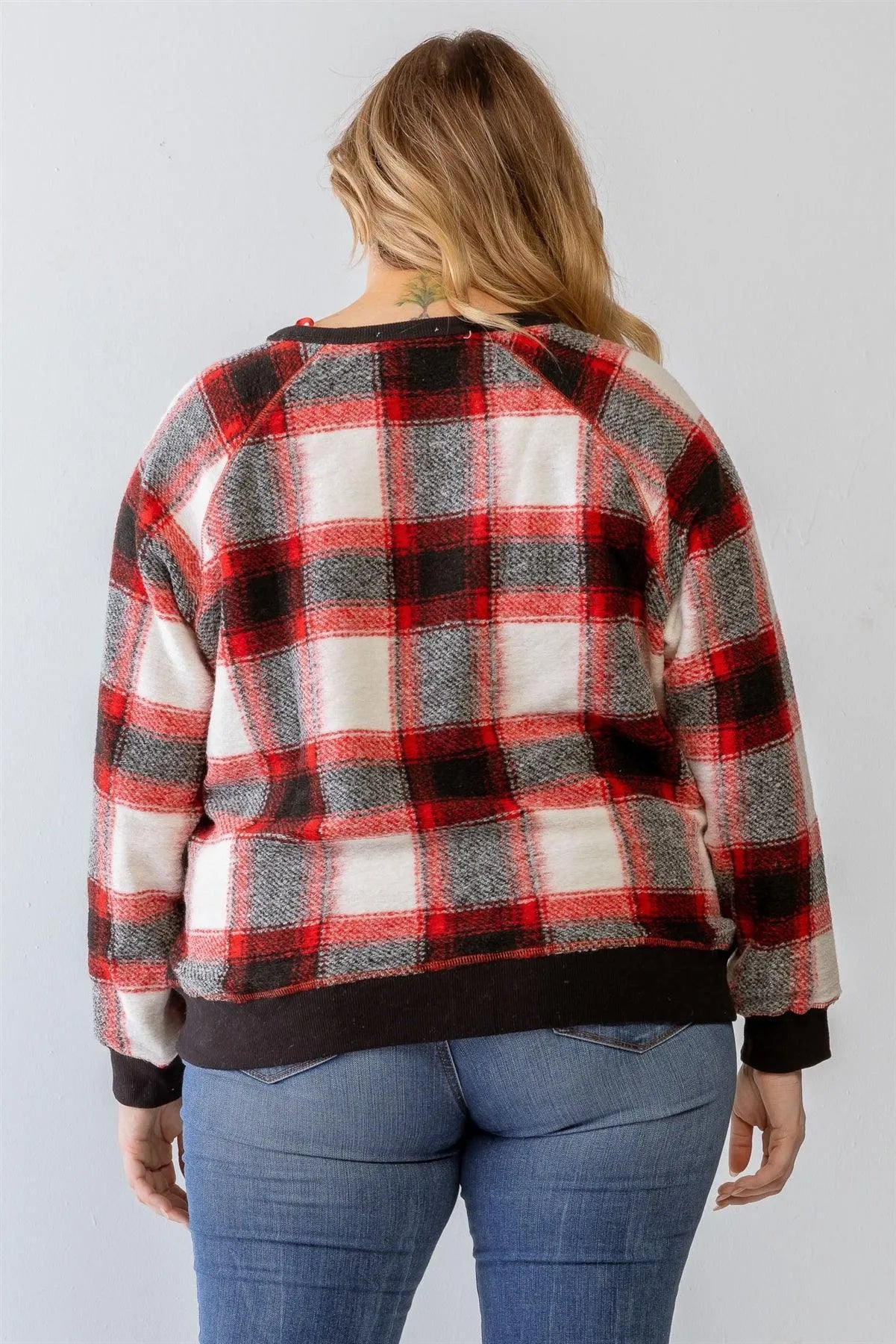 Junior Plus Red Wildfire Plaid Cotton Blend Long Sleeve Sweatshirt /3-2-1