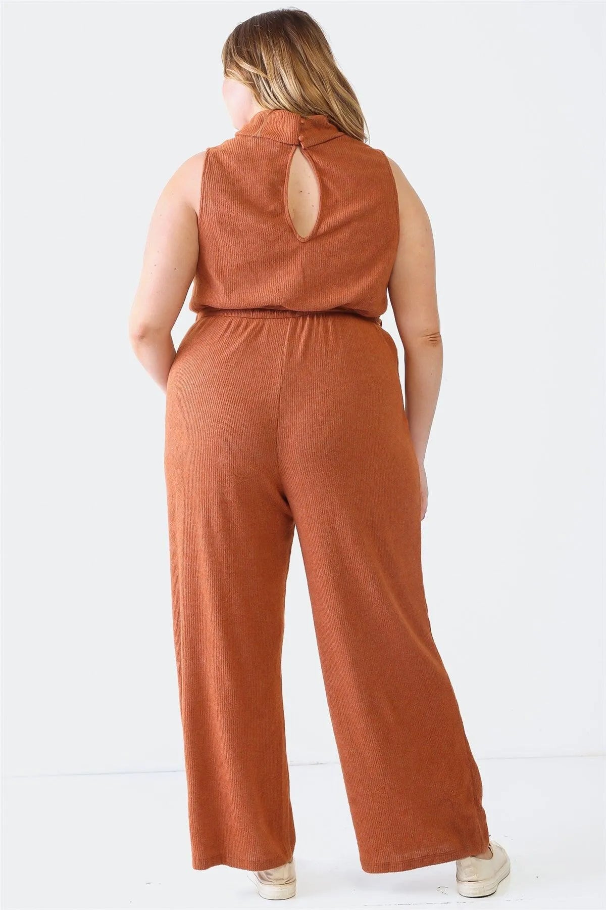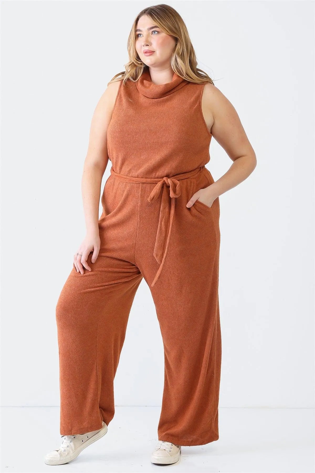 🖤 Introducing your new must-have for the fall season - our Plus Size Ribbed Sleeveless Turtle Neck Belted Jumpsuit! This cozy and cute jumpsuit comes in a warm rust color and features a ribbed texture, a chic turtle neckline, convenient pockets and loops, and a stylish belted waist. Perfect for staying cool while staying warm!