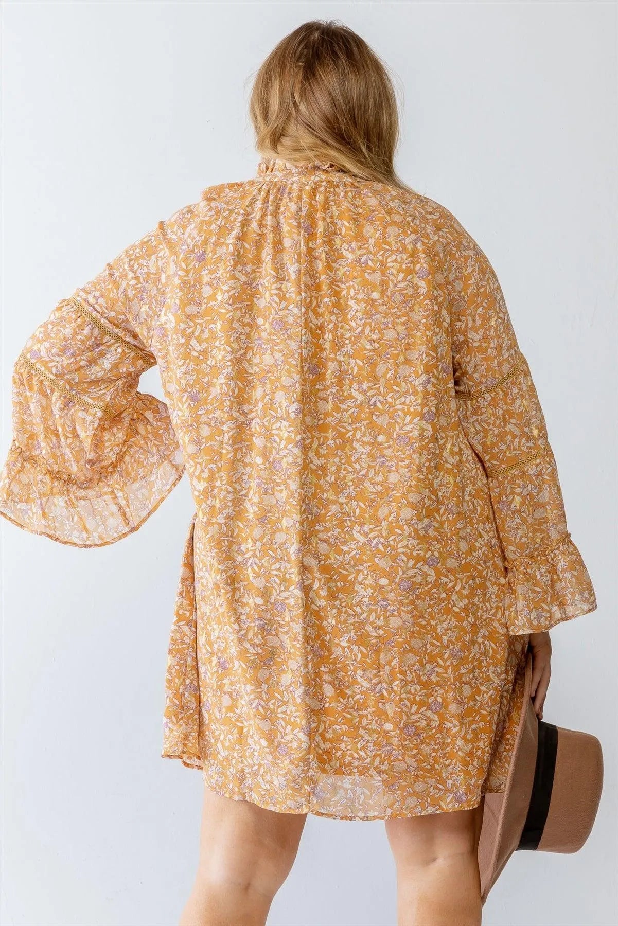 🖤 Item Features: Sand, floral & gold print, long sleeves with embroidery, crew neckline with ruffle & self-tie details, relaxed fit, flare hem, mini length, non-stretchy, lined, non-sheer, casual, cute, girlish, lifestyle, must-have