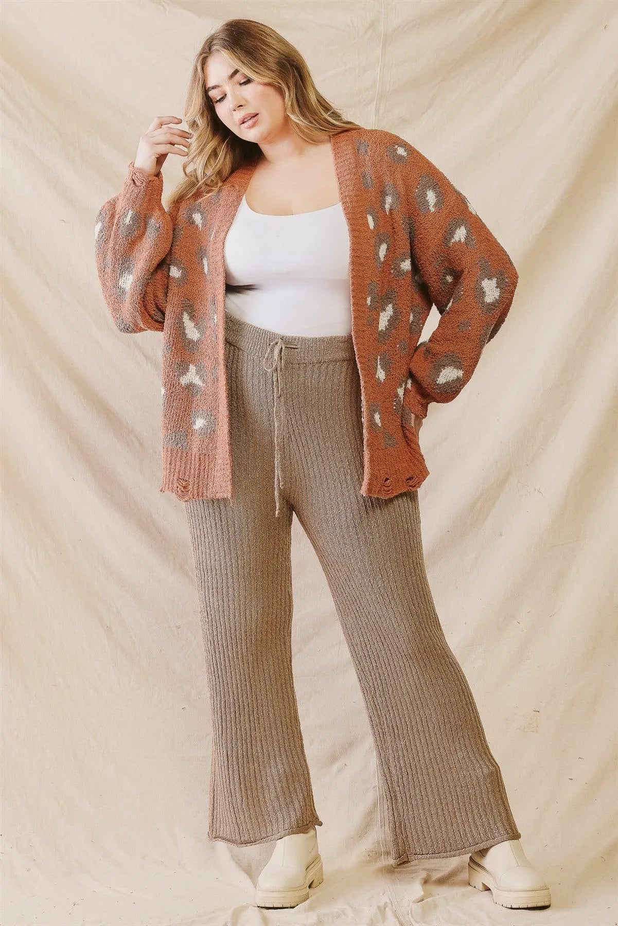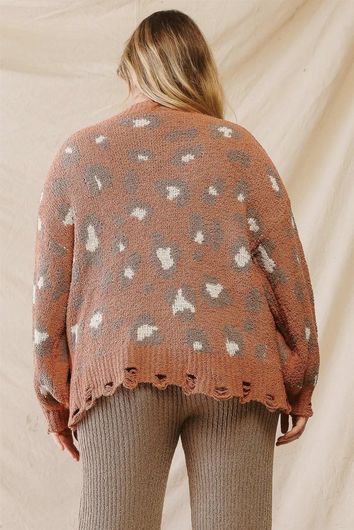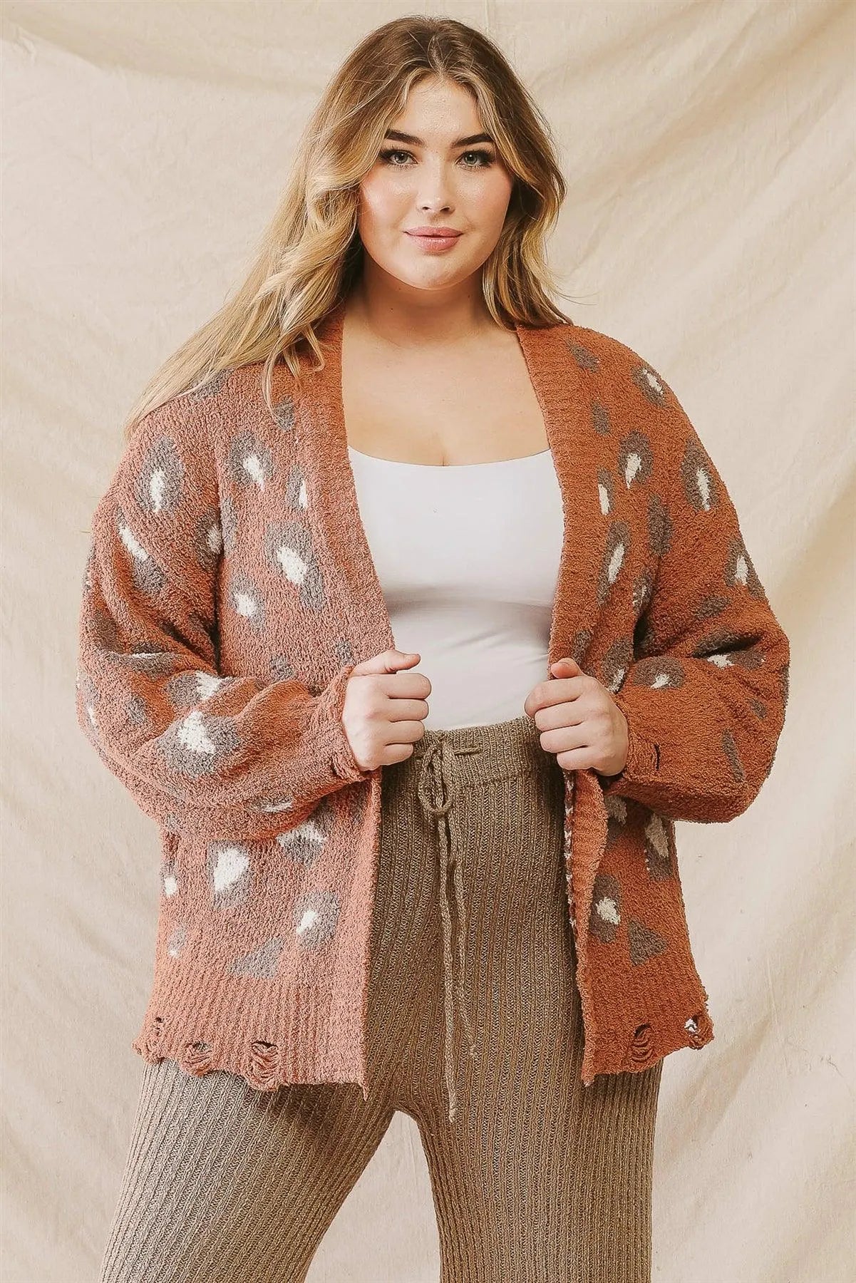 Junior Plus Camel Cow Print Distressed Hem Soft To Touch Open Front Cardigan /3-2-1