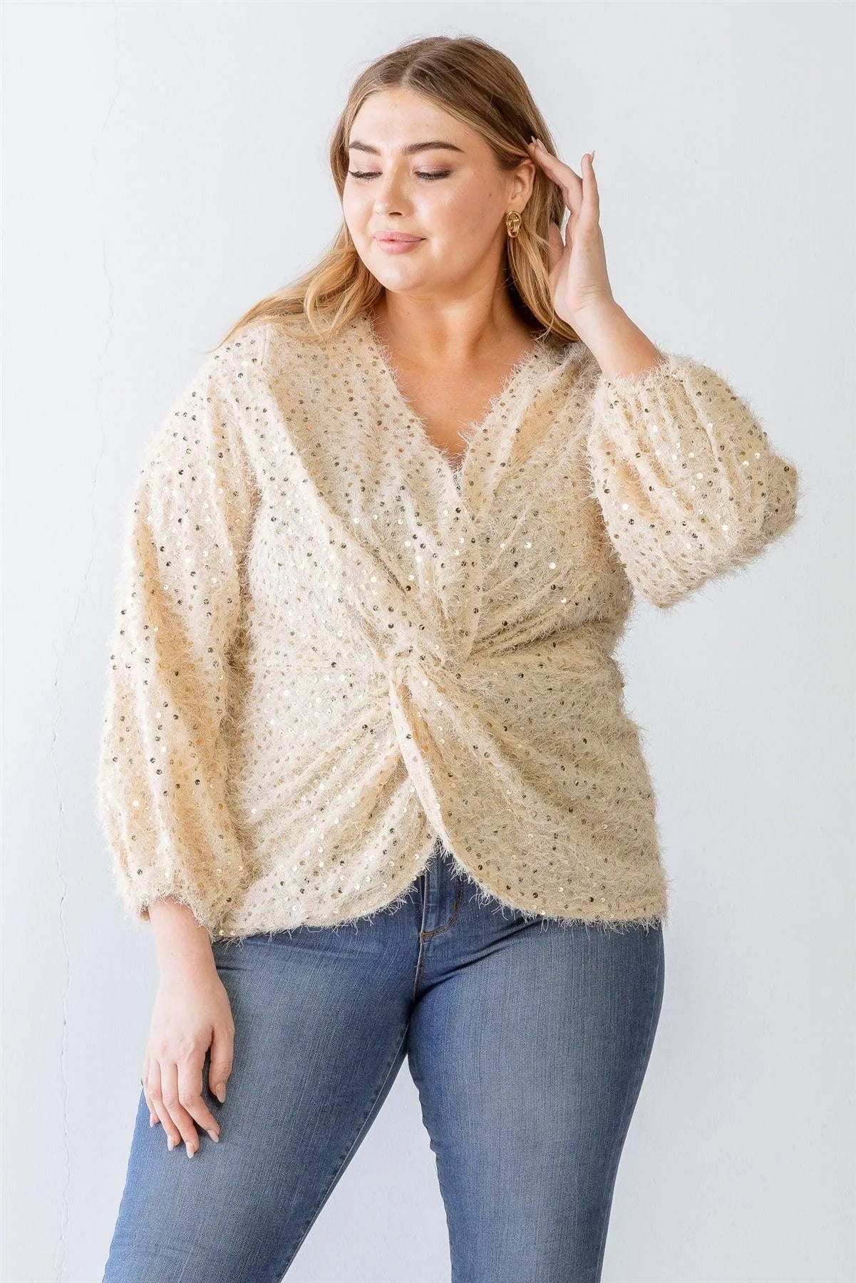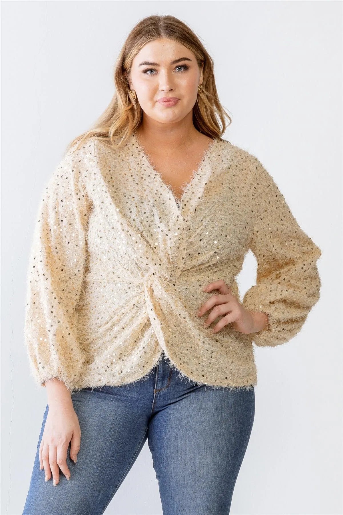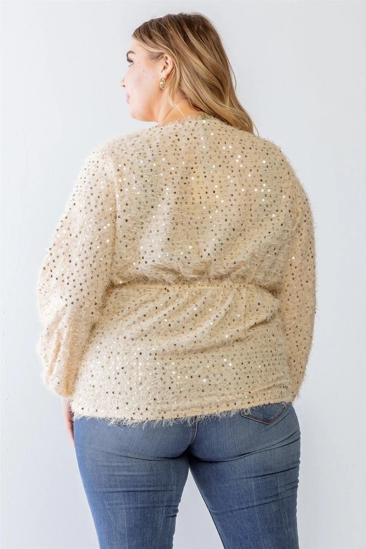 Junior Plus Tan Fuzzy Sequin Wrap Detail Long Sleeve Sweater /3-2-1